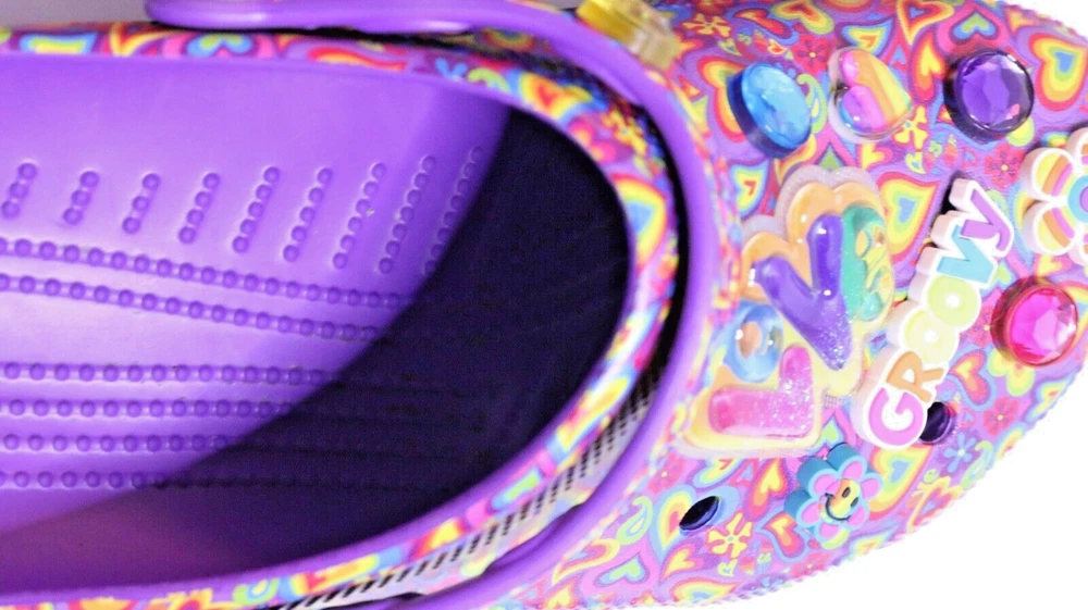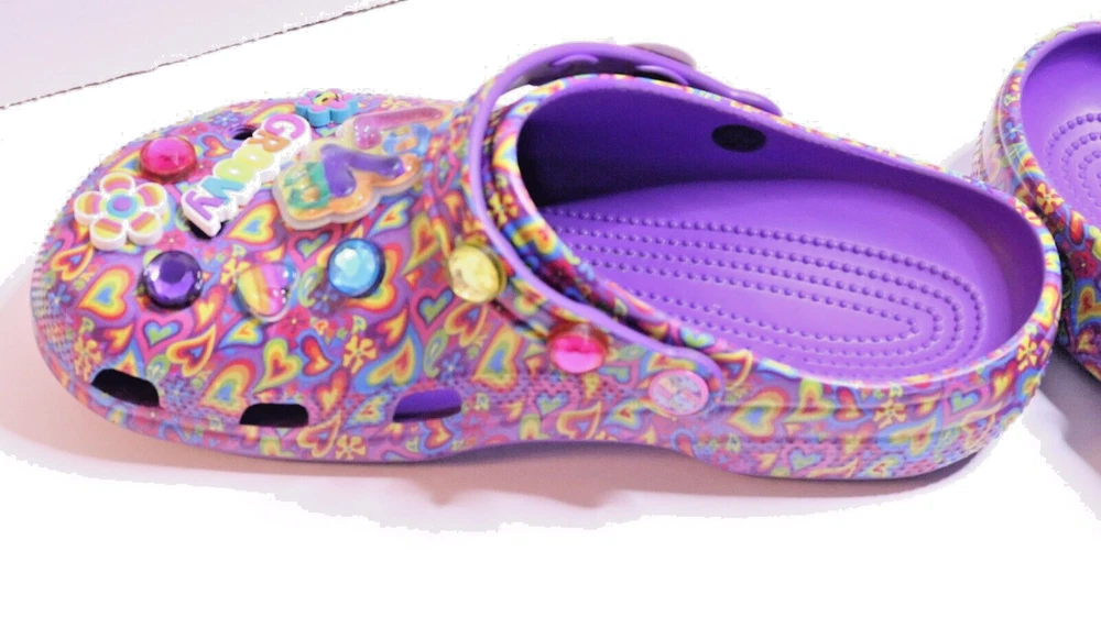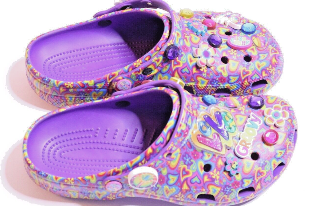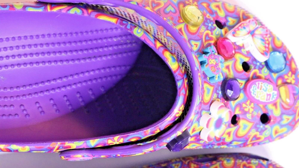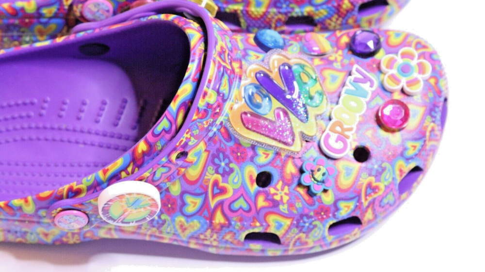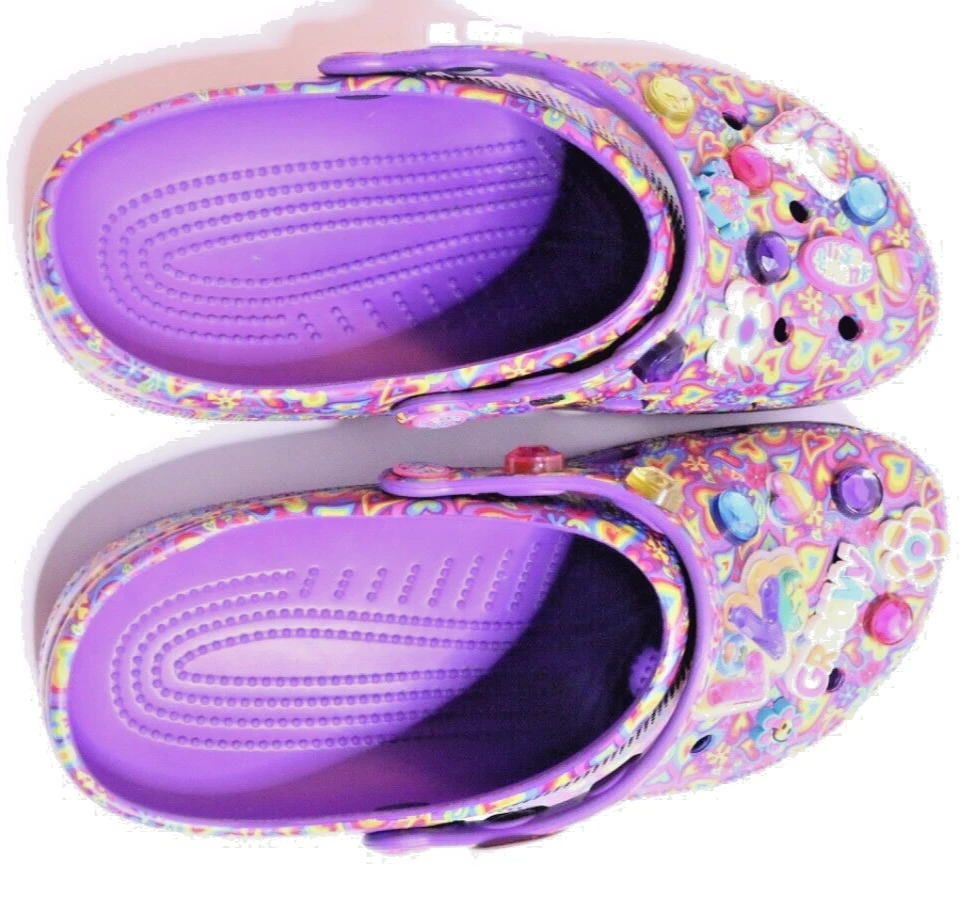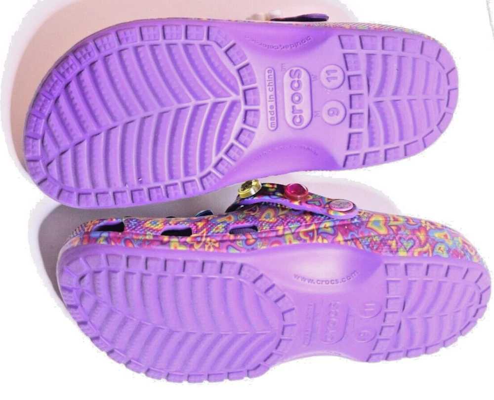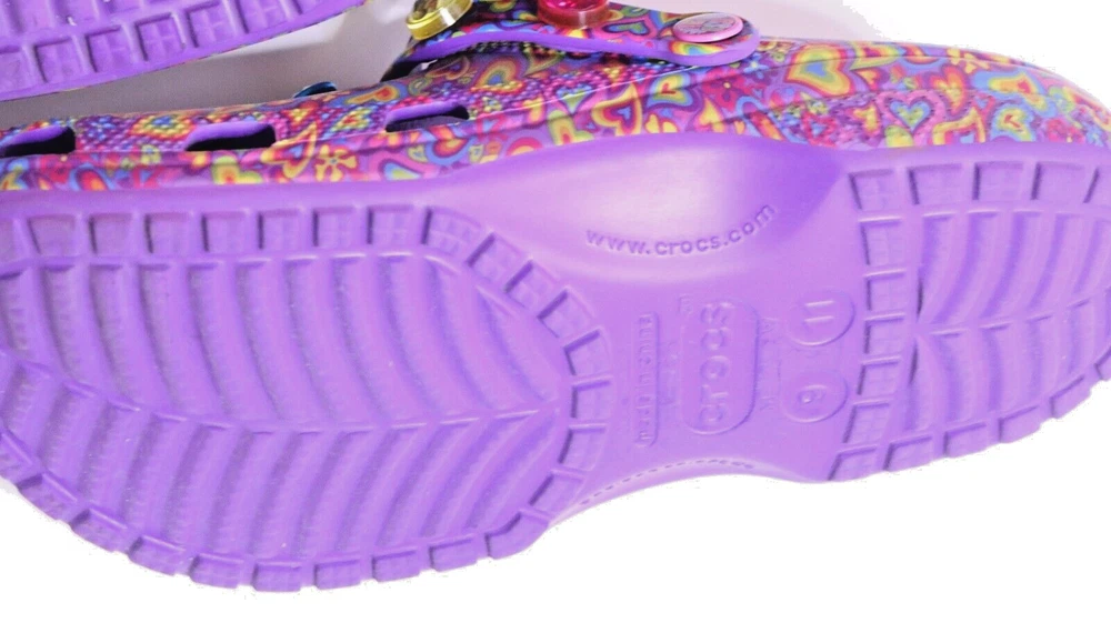 Step into a vibrant purple world with these Crocs Lisa Frank Classic Purple Crocs. The slip-on clogs feature a rubber upper and outsole, with a breathable insole and rubber lining. The limited edition design is perfect for walking, with a standard shoe width and slip-on closure. These Crocs are unisex, with a UK shoe size of 7 and a US shoe size of 9. The neon and classic theme is perfect for any casual occasion, and the Crocs brand ensures comfort and durability. Don't miss out on these stylish and practical shoes.