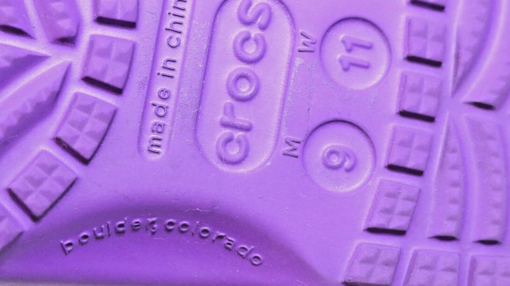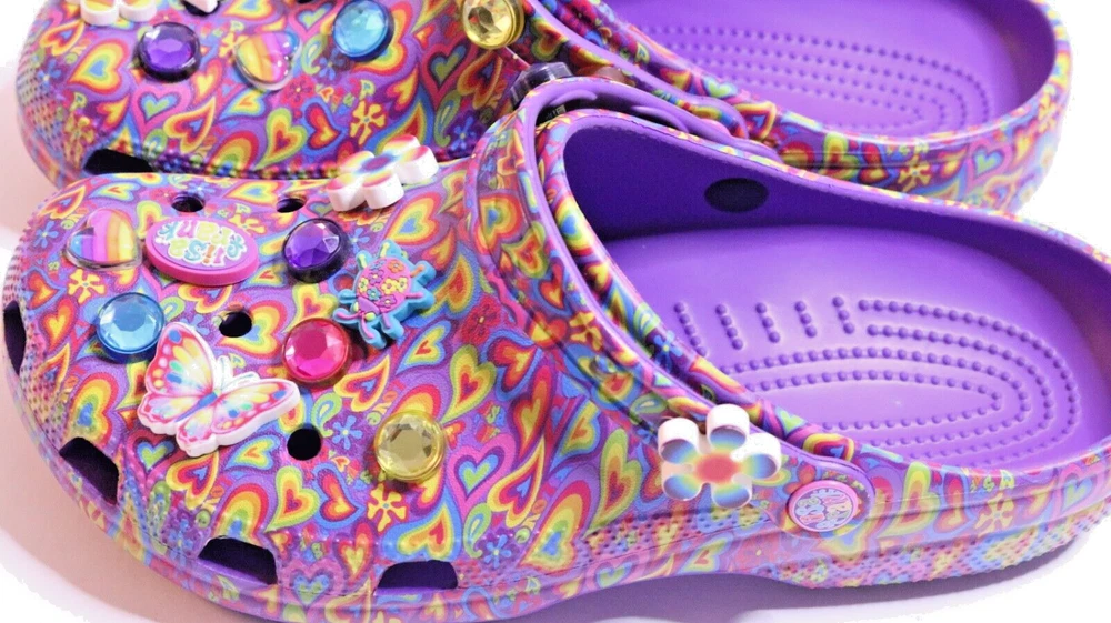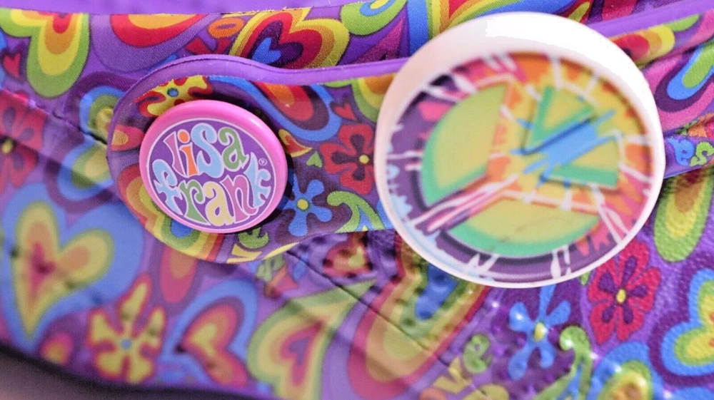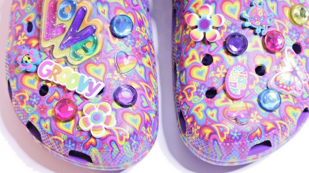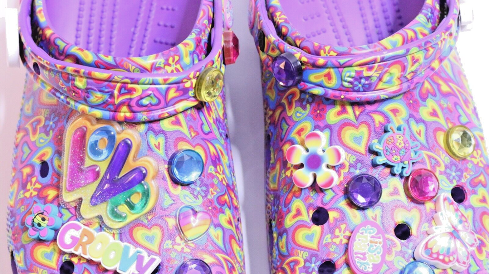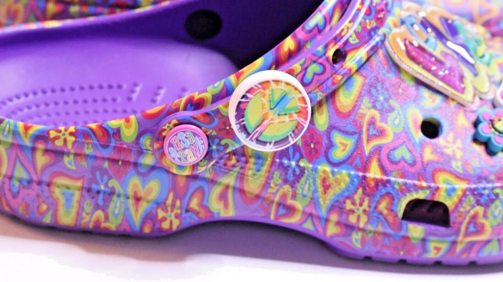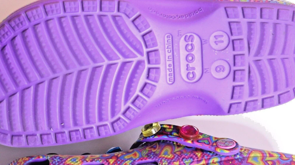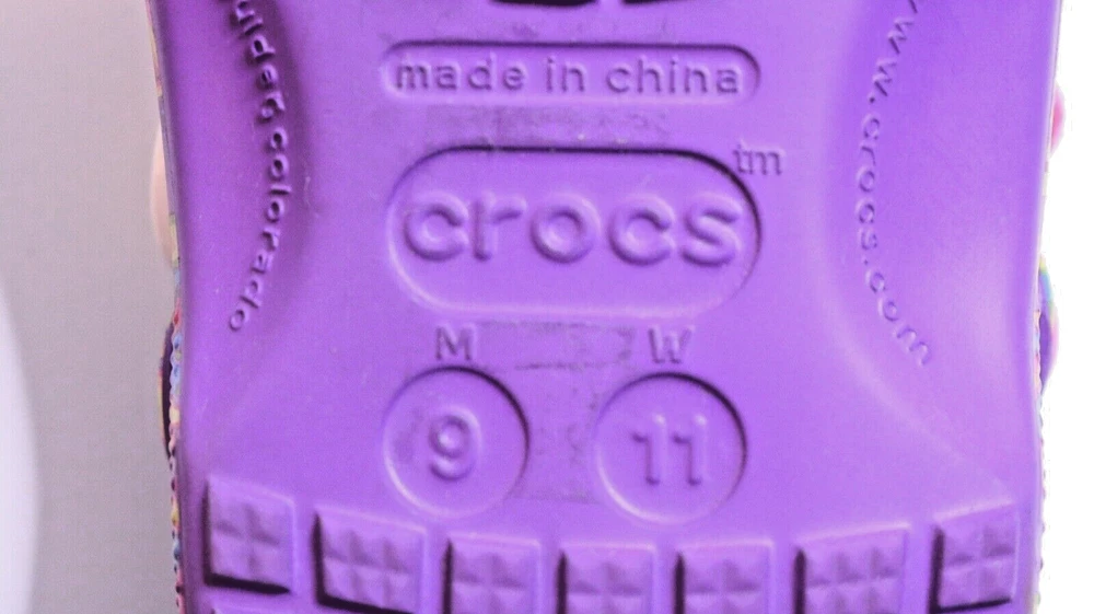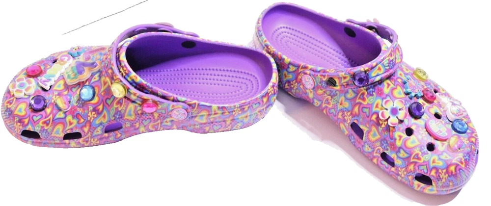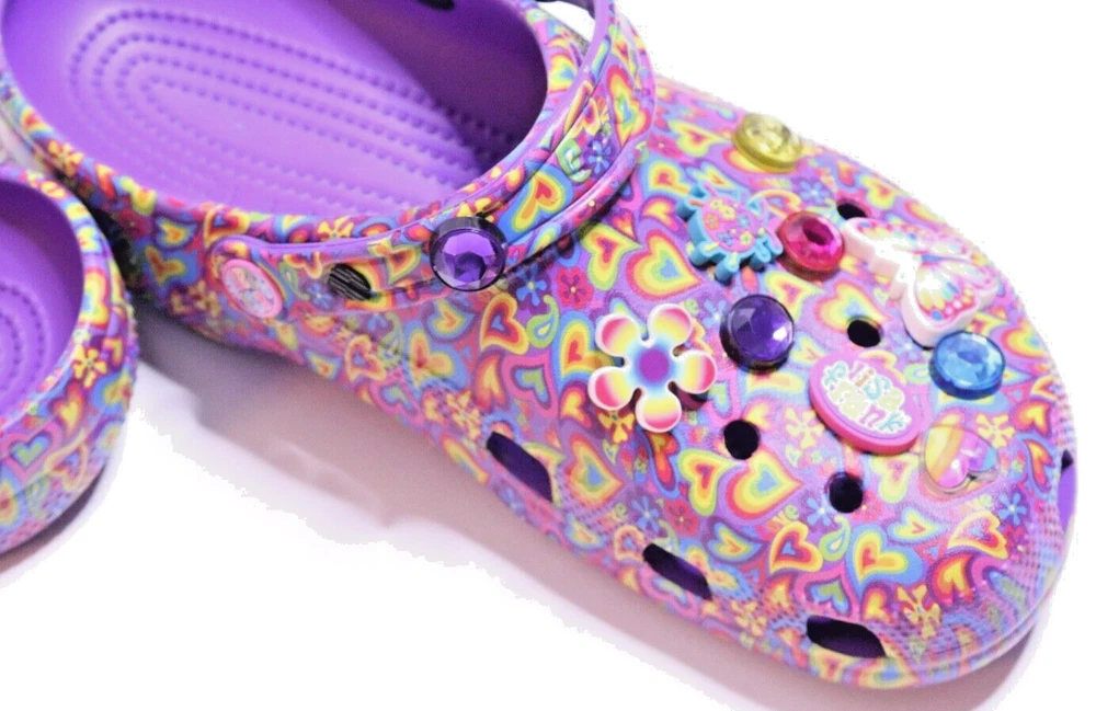 Step into a vibrant purple world with these Crocs Lisa Frank Classic Purple Crocs. The slip-on clogs feature a rubber upper and outsole, with a breathable insole and rubber lining. The limited edition design is perfect for walking, with a standard shoe width and slip-on closure. These Crocs are unisex, with a UK shoe size of 7 and a US shoe size of 9. The neon and classic theme is perfect for any casual occasion, and the Crocs brand ensures comfort and durability. Don't miss out on these stylish and practical shoes.