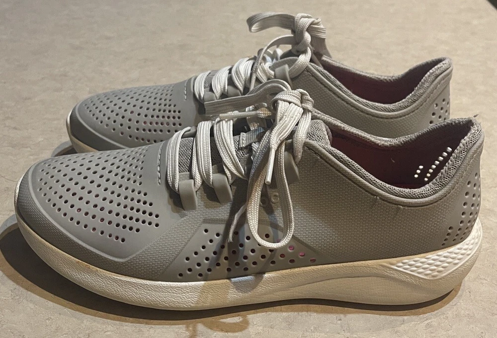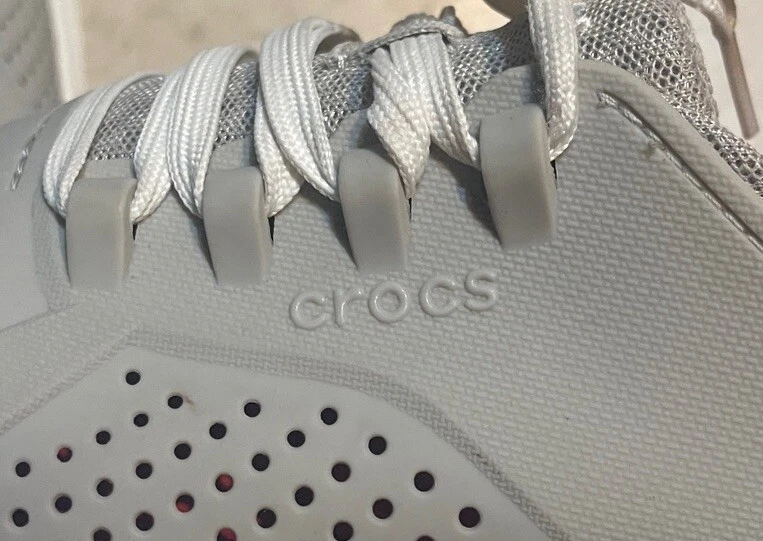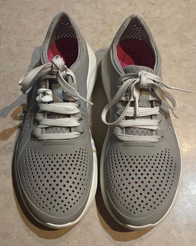Elevate your casual style with these Crocs LiteRide Pacer sneakers in a beautiful gray mesh design. These lace-up shoes feature a round toe shape and a standard shoe width, making them comfortable to wear for walking or any casual activity. The rubber outsole material provides durability, while the breathable features ensure your feet stay cool and comfortable. These sneakers are perfect for women who appreciate a classic theme and are looking for a stylish and comfortable pair of shoes. The Crocs brand is known for its quality and these shoes are no exception. Get your hands on these Crocs LiteRide Pacer sneakers today and step out in style! These shoes are in good preowned condition with light signs of wear on the bottom of the shoe. Please see ALL photos for a better idea on condition, any measurements, or details to the shoes.