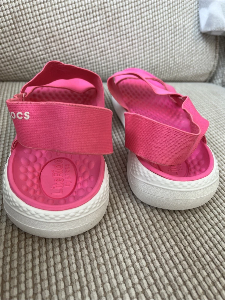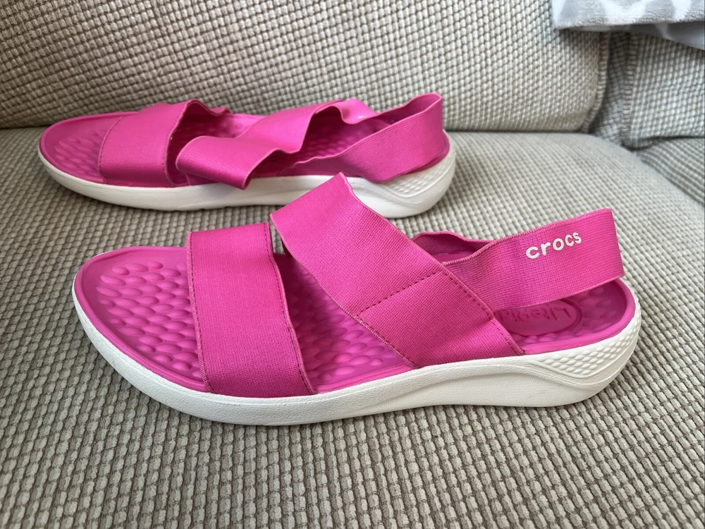 These Crocs LiteRide Stretch sandals are the perfect addition to your summer footwear collection. With a slip-on closure and flat heel style, they provide both comfort and convenience. The solid pink color and Crocs logo accents make them a stylish choice for any casual occasion. These sandals are designed with a comfort strap and stretch features, making them perfect for women's size 8. Whether you're running errands or going to the beach, these Crocs LiteRide Stretch sandals are a must-have. Add them to your cart now and experience the ultimate comfort and style.
