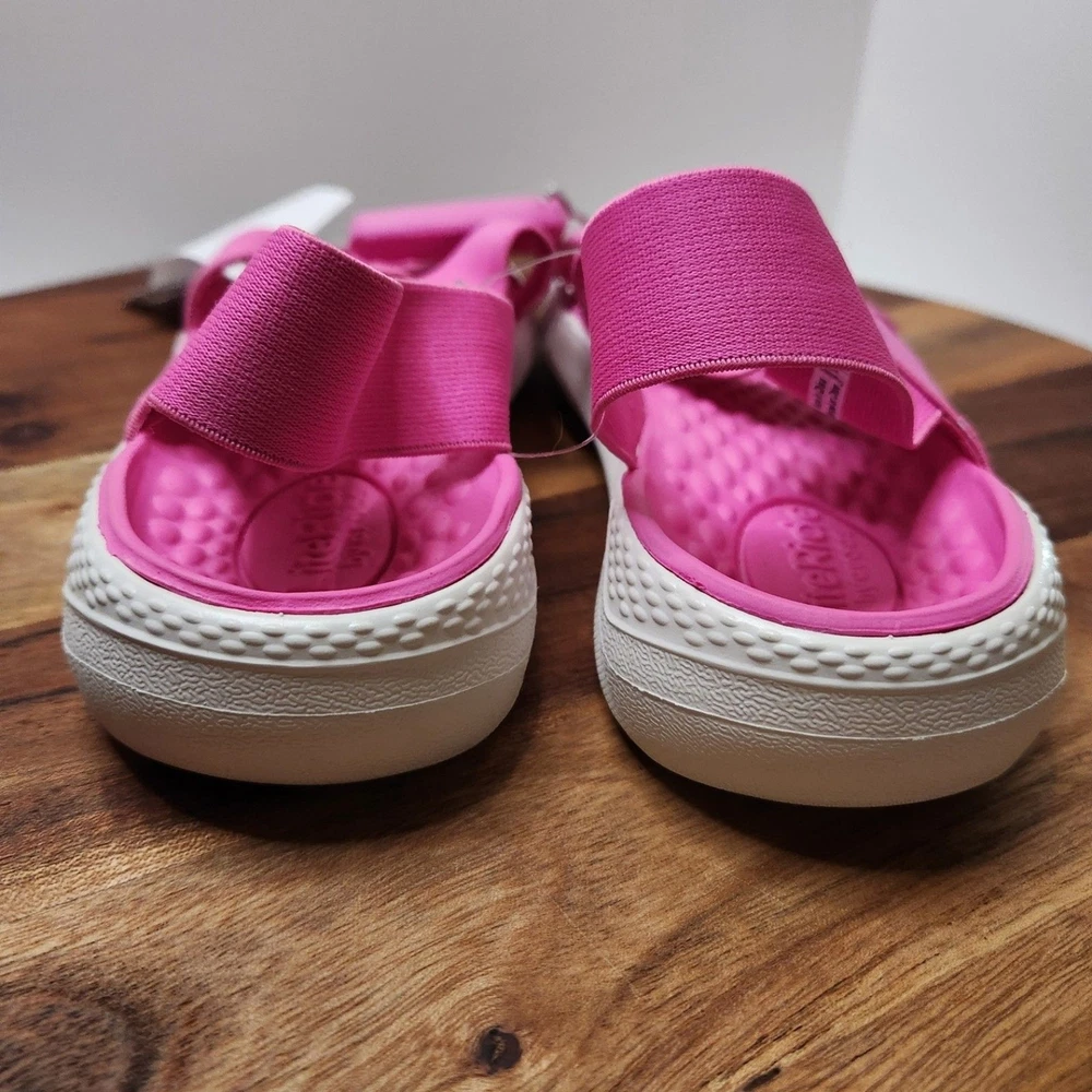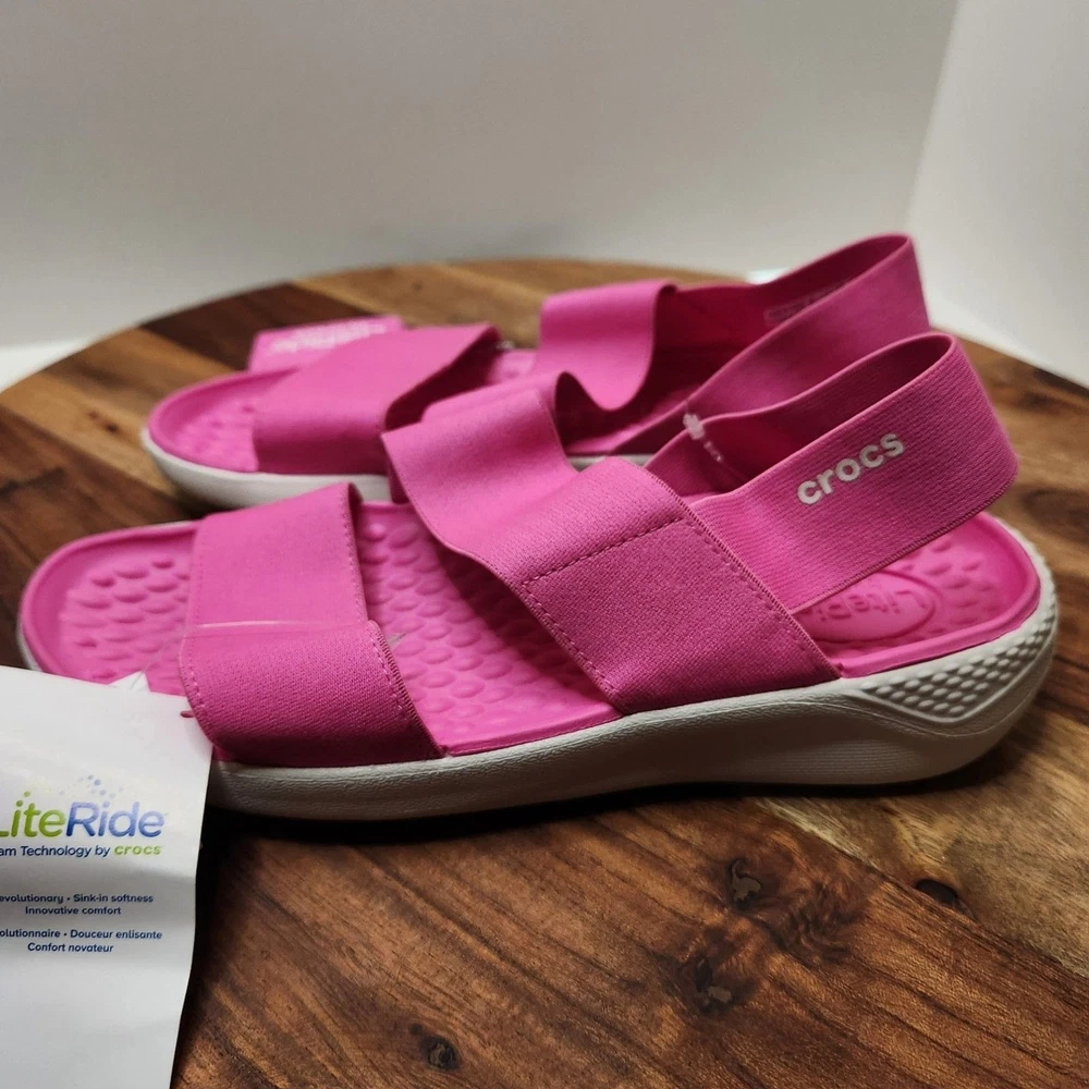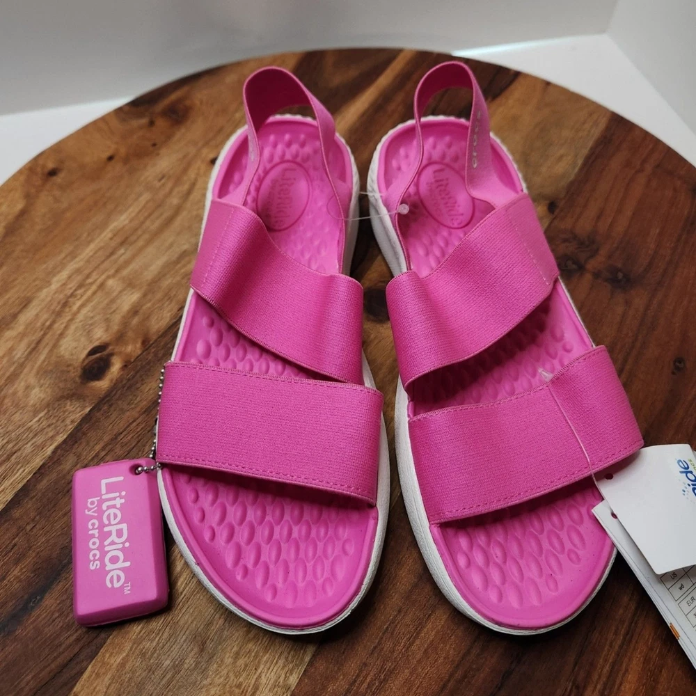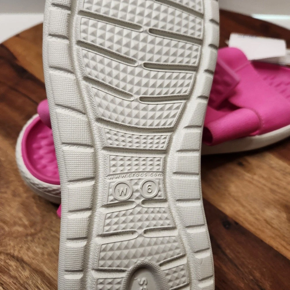 women's size 6 pink Crocs brand sandals straps are stretchy Please go by the photo and written description (not auto fill) for item details. Any questions, just ask!