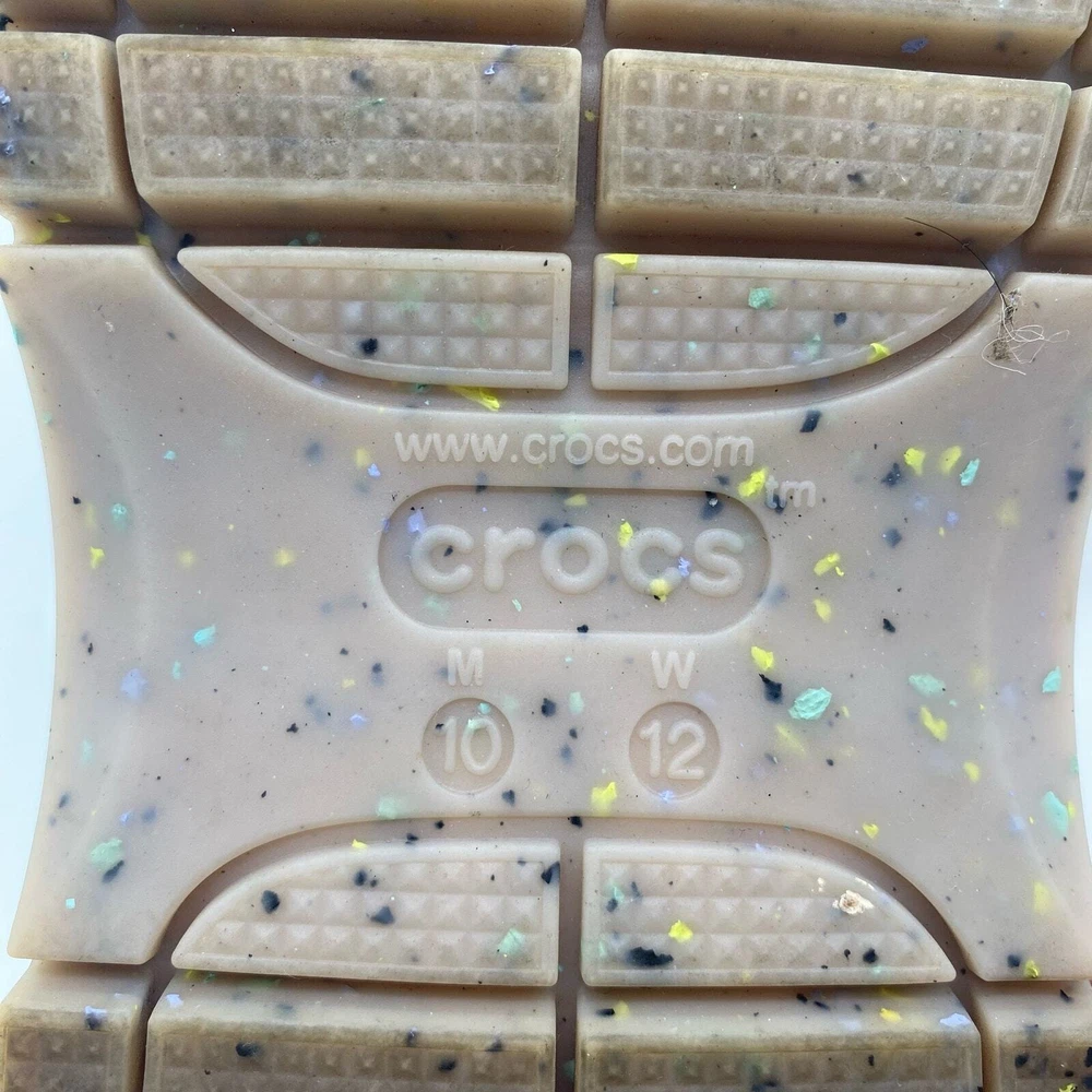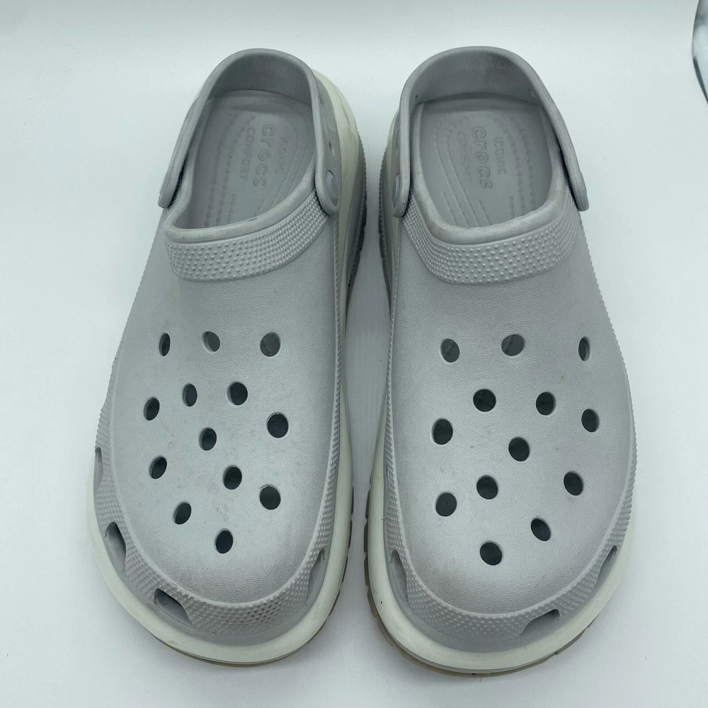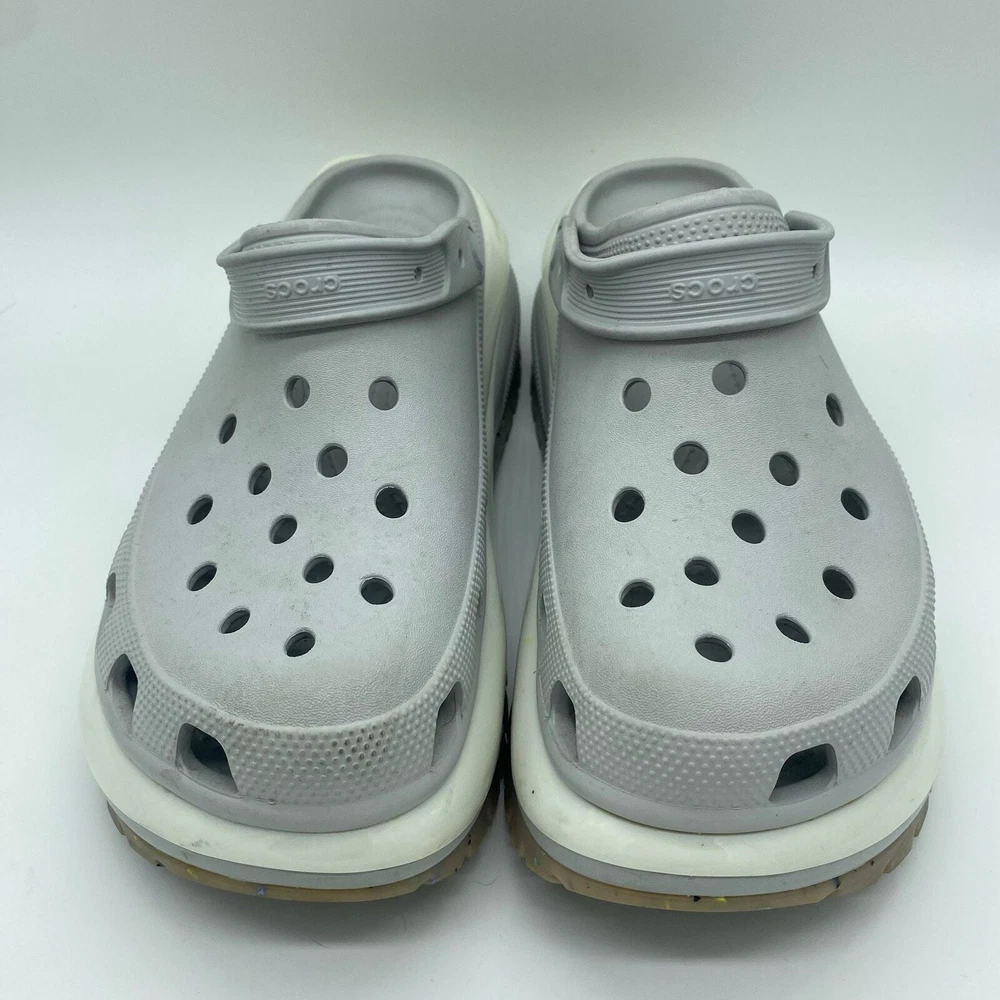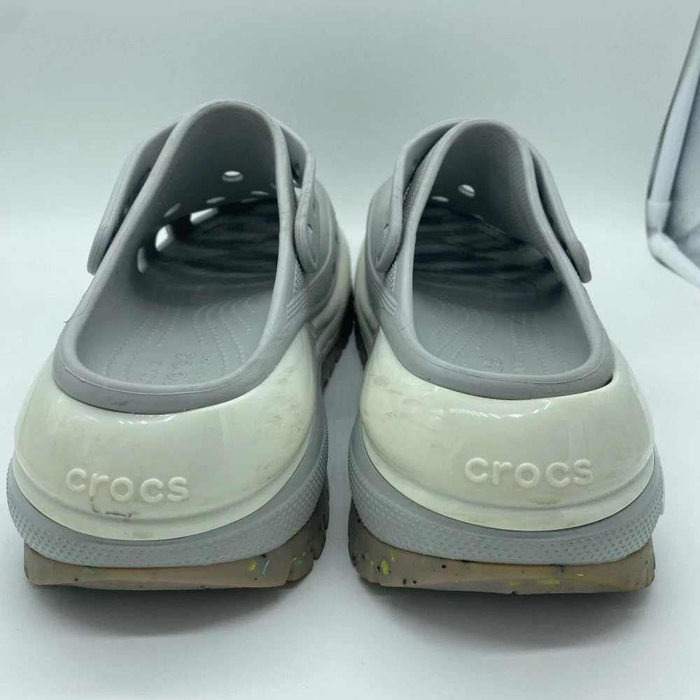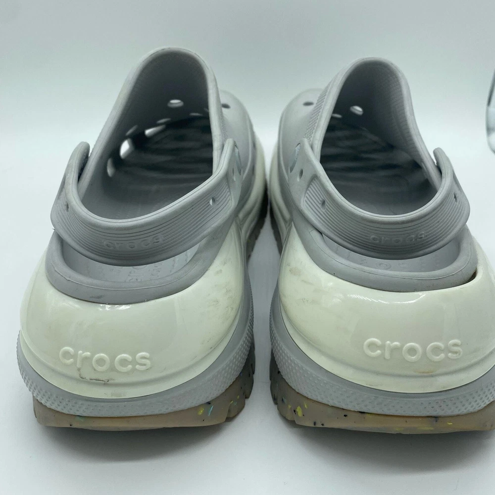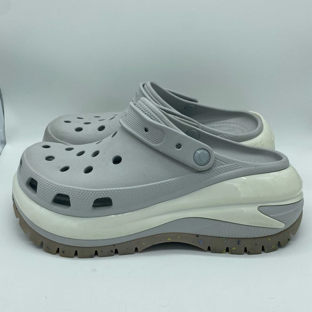 Crocs Men's 10 Women's 12 Gray White Mega Crush Clog Platform Slip-On Shoes. Crocs brand shoes in a men's size 10 or women's size 12. "Mega Crush" style shoes. Slip-on clogs. Gray and white colorway. Slingback style. In great pre-owned condition, see photos for more details. Always feel free to ask any questions you may have! Reasonable offers accepted.