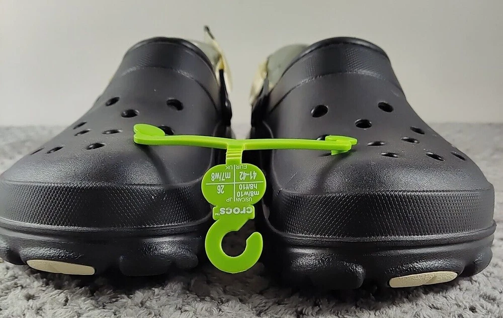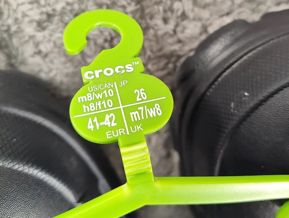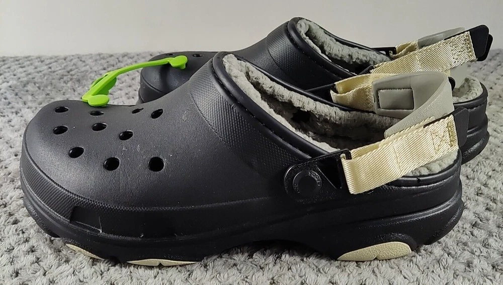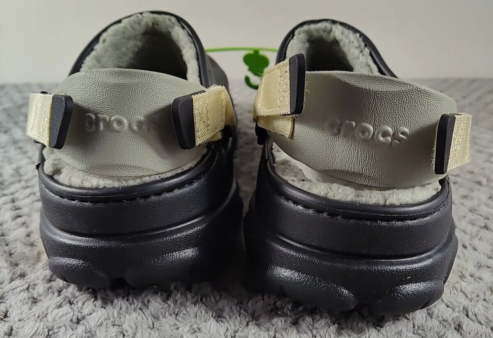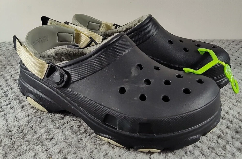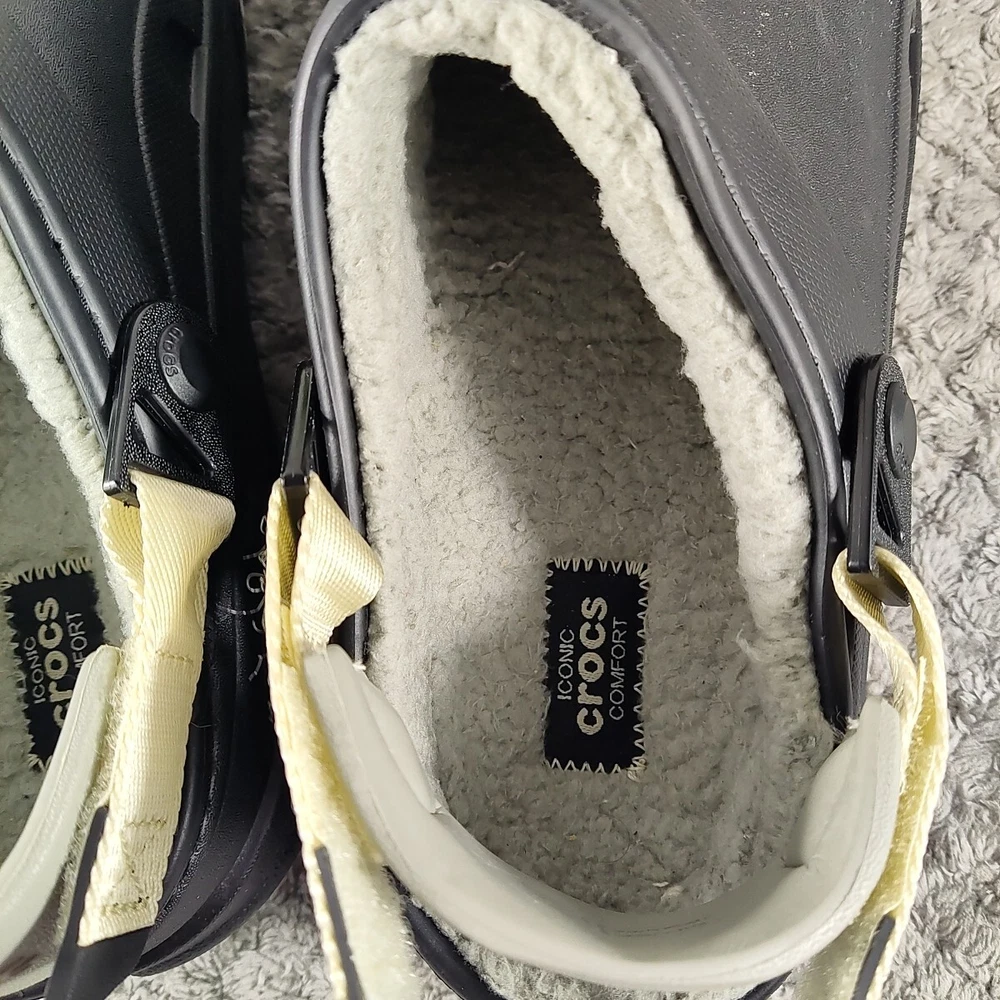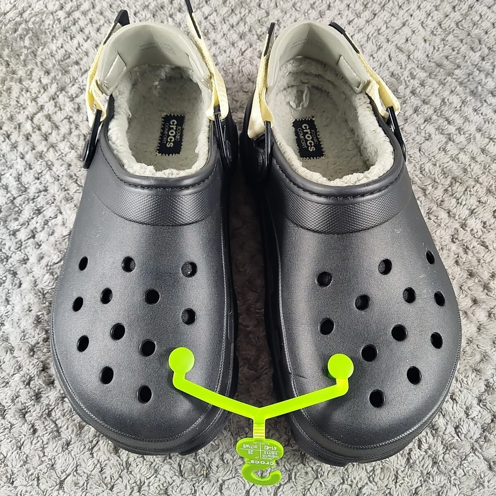 Style: Clog Seller Notes: “New without box.” Brand: Crocs Upper Material: Synthetic Color: Black Pattern: Solid Outsole Material: Synthetic Type: Casual Insole Material: Faux Fur US Shoe Size: 8 Lining Material: Faux Fur Features: Lined EU Shoe Size: 41 Department: Men UK Shoe Size: 7