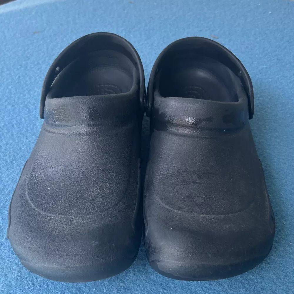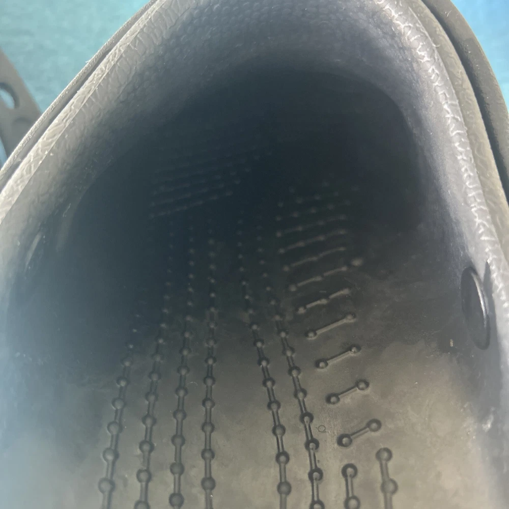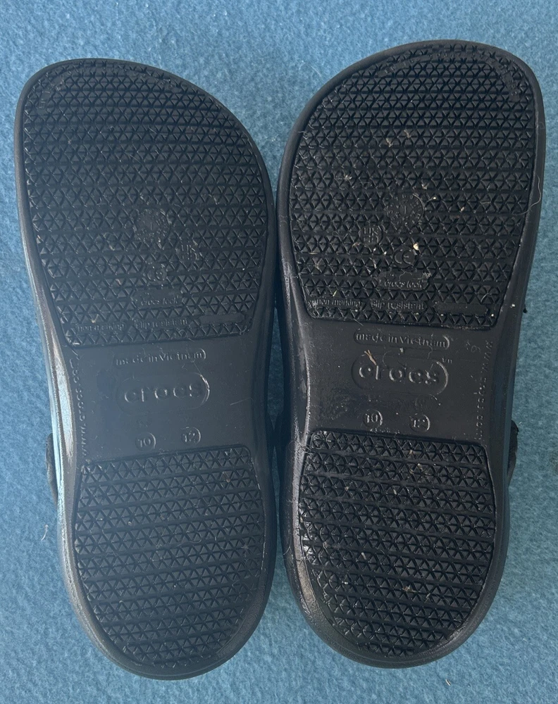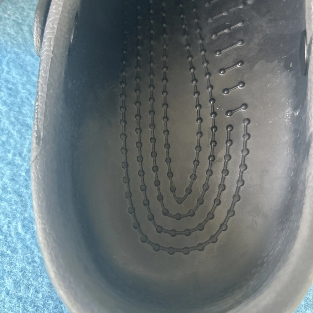 Soles are almost complete, and shoe is in very nice condition. As a wearer of these type of shoes, I can state that not all crocs fit the same. That being said, I can say that this pair runs on the smaller side and would not be suitable for wide feet. They could also use a little armor all to shine them up a bit. 00g9w9s9x.50