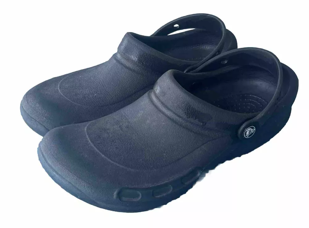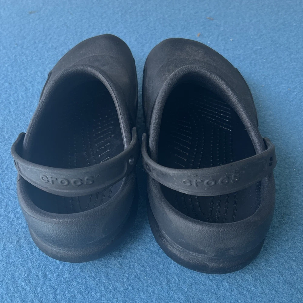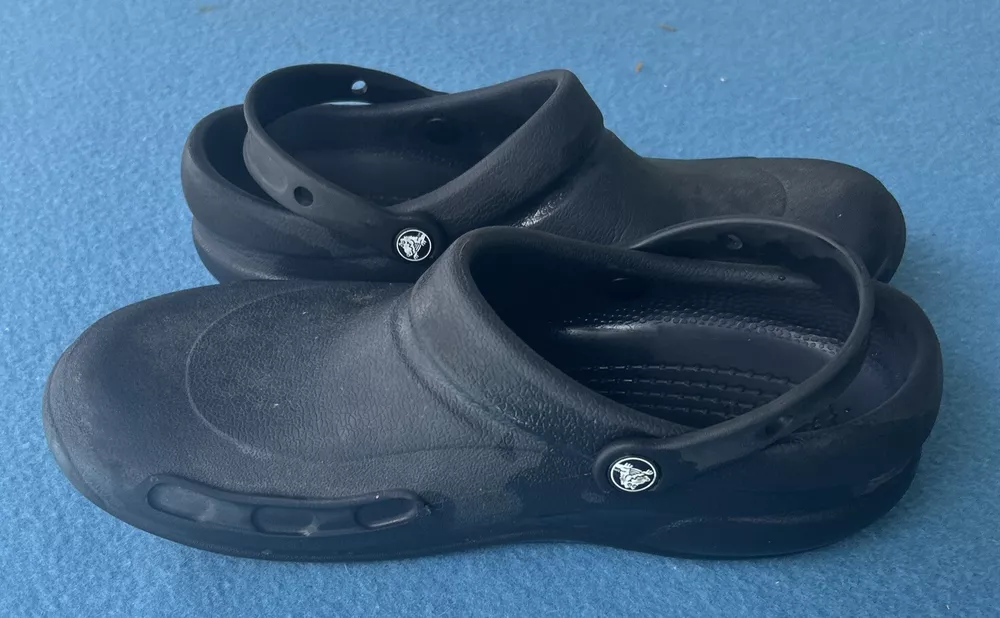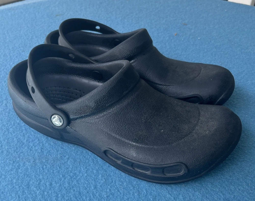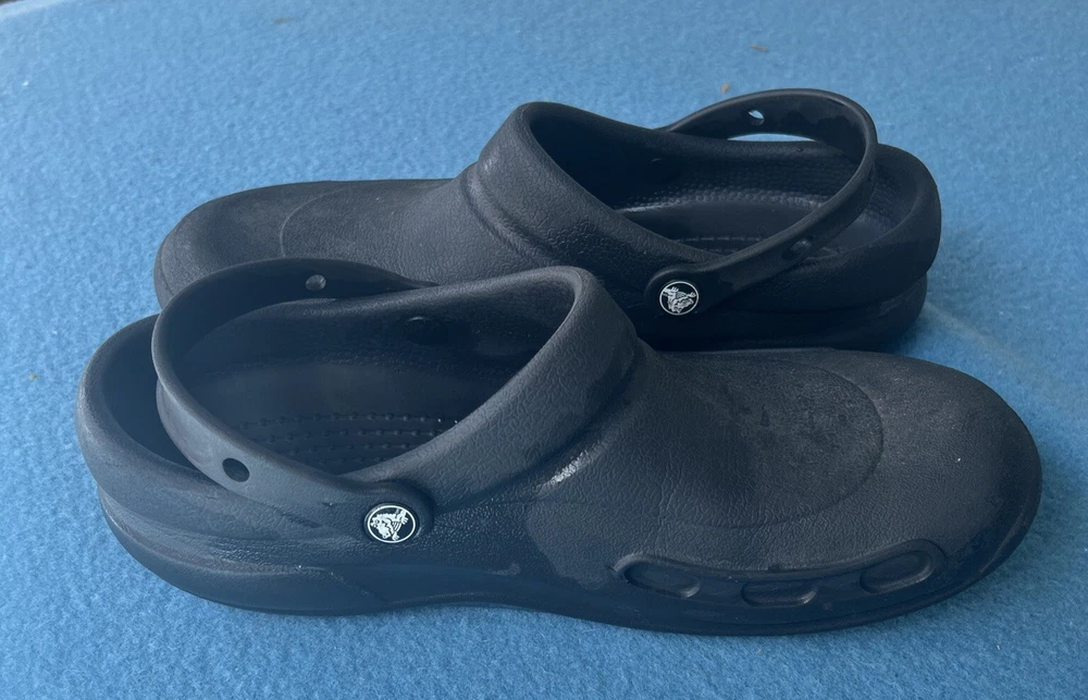 Soles are almost complete, and shoe is in very nice condition. As a wearer of these type of shoes, I can state that not all crocs fit the same. That being said, I can say that this pair runs on the smaller side and would not be suitable for wide feet. They could also use a little armor all to shine them up a bit. 00g9w9s9x.50