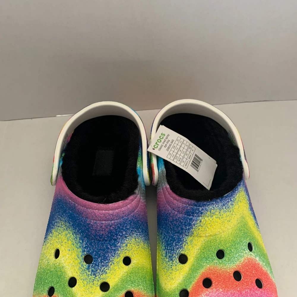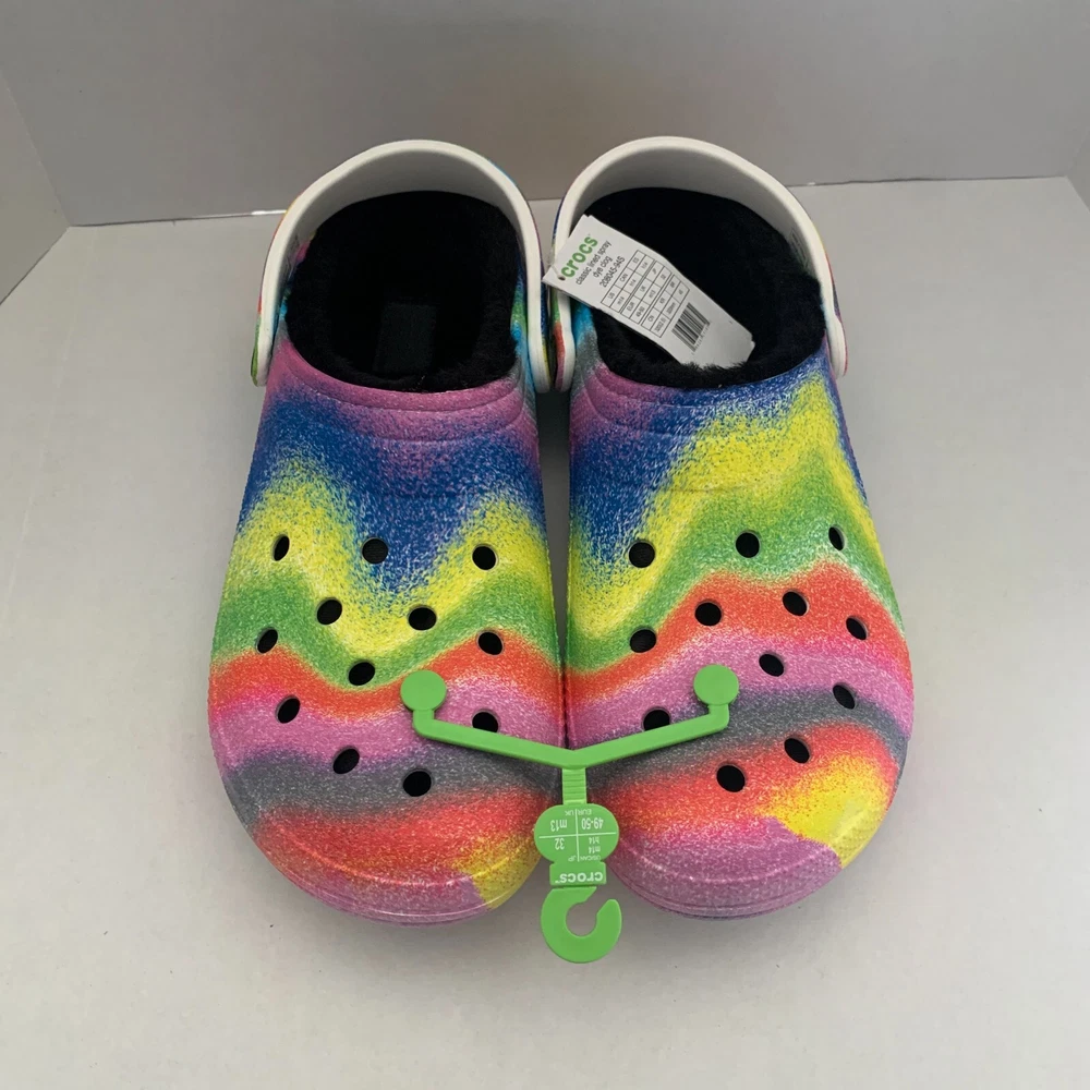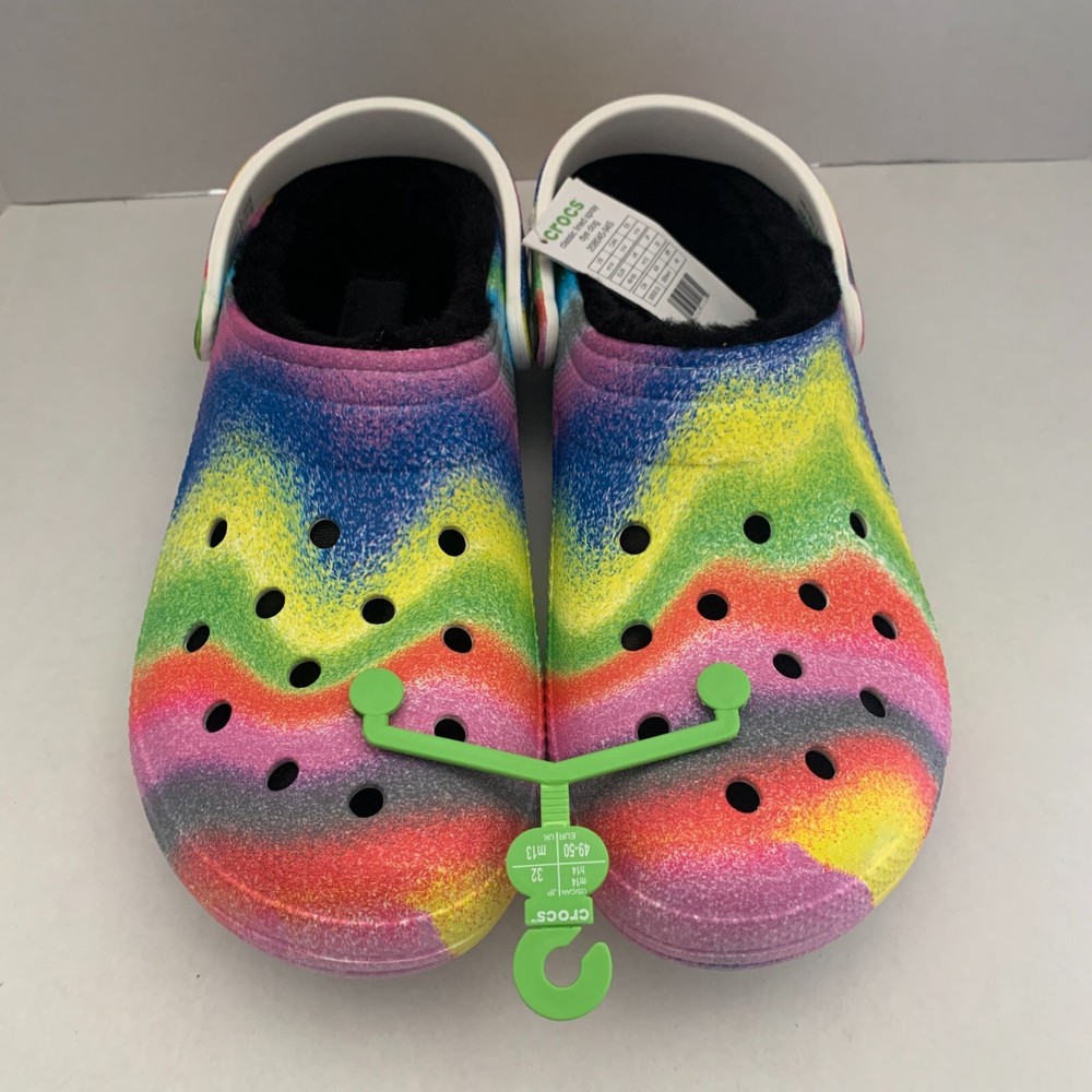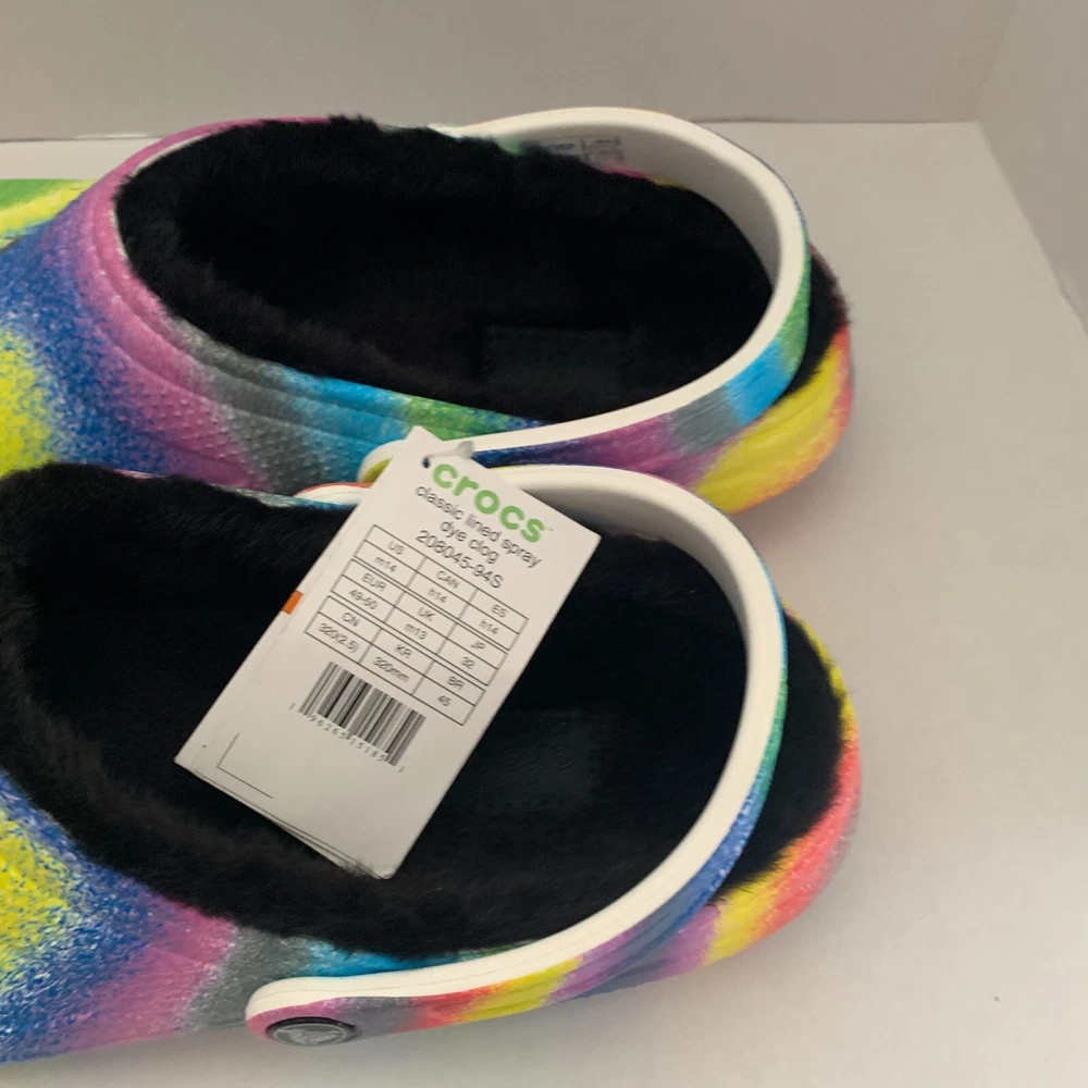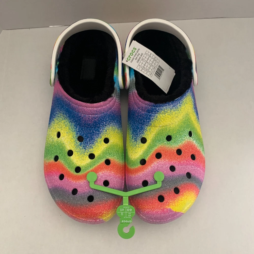 Brand: Crocs Fabric Type: Blended Fabric Vintage: No Accents: Logo Toe Shape: Round Toe Outsole Material: Croslite Outsole UK Shoe Size: 13 AU Shoe Size: N/A Department: Men Shoe Width: Standard Product Line: Crocs Occasion: Activewear, Casual, Travel US Shoe Size: 14 Customized: No Features: Lined Insole Material: Faux Fur EU Shoe Size: 49-50 Theme: Outdoor, Casual Lining Material: Polyester Upper Material: Croslite upper Color: Multicolor Style: Clog Closure: Slip On Character: Crocs Model: N/A Season: Fall, Spring, Summer, Winter Pattern: Tie Dye Country/Region of Manufacture: Vietnam Seller Notes: “Brand New” Type: Casual