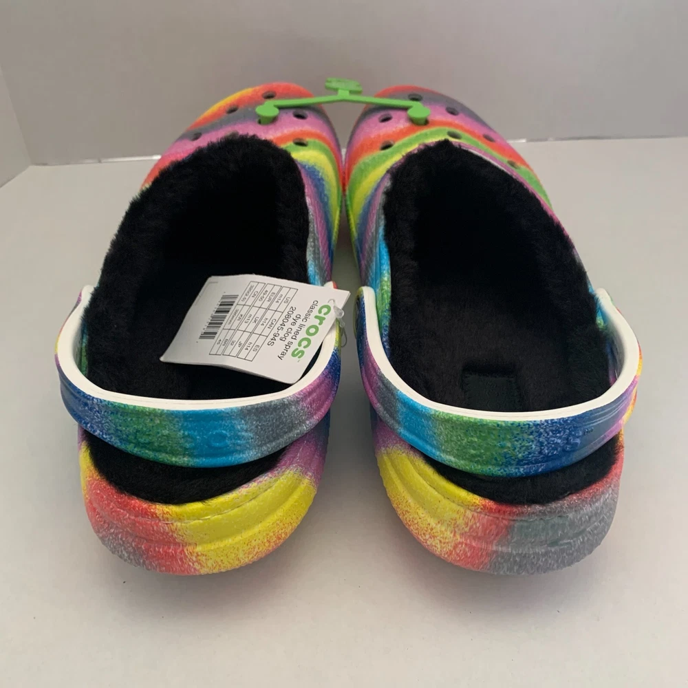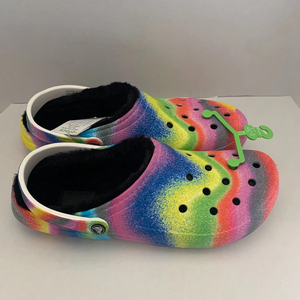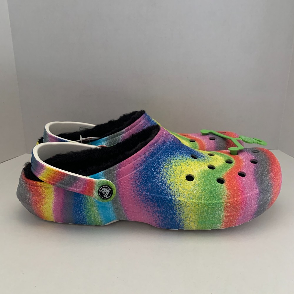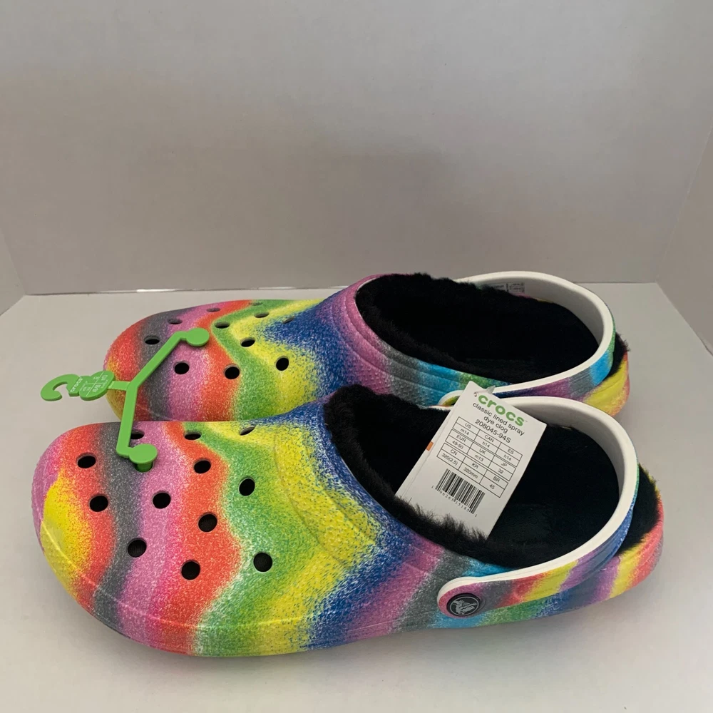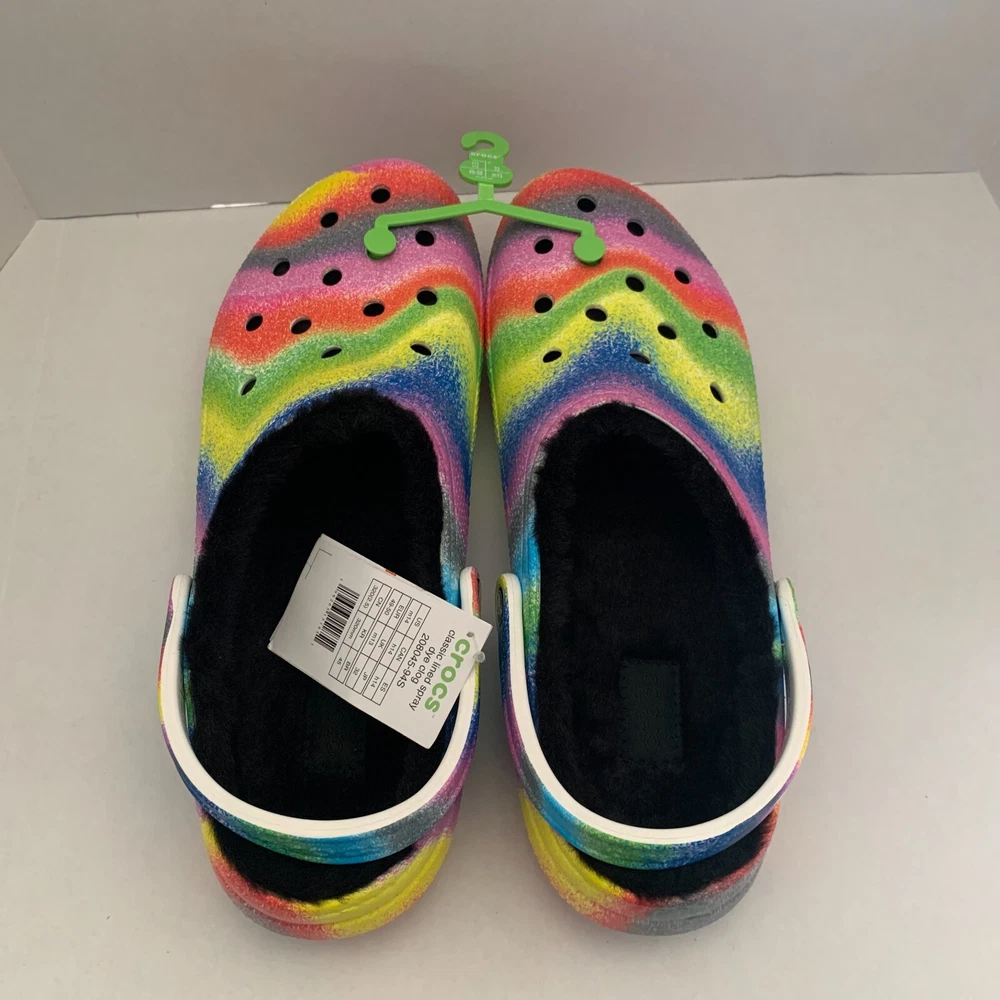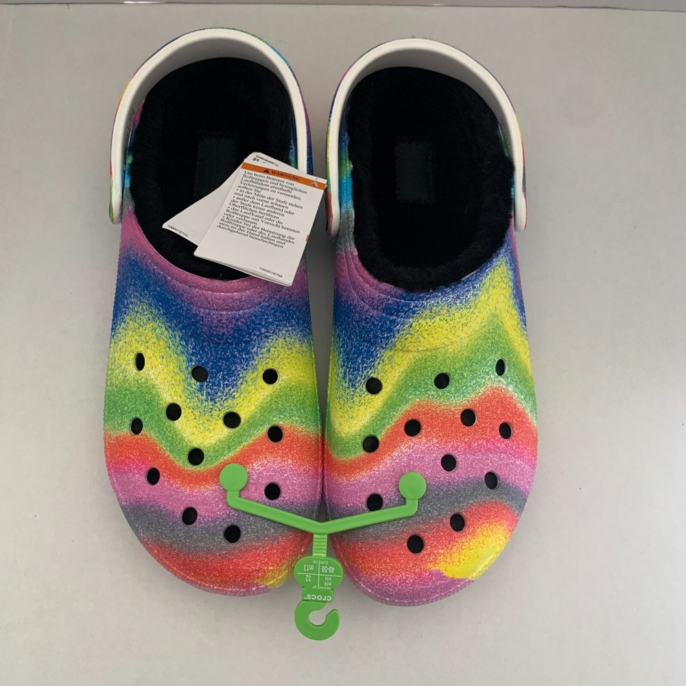 Brand: Crocs Fabric Type: Blended Fabric Vintage: No Accents: Logo Toe Shape: Round Toe Outsole Material: Croslite Outsole UK Shoe Size: 13 AU Shoe Size: N/A Department: Men Shoe Width: Standard Product Line: Crocs Occasion: Activewear, Casual, Travel US Shoe Size: 14 Customized: No Features: Lined Insole Material: Faux Fur EU Shoe Size: 49-50 Theme: Outdoor, Casual Lining Material: Polyester Upper Material: Croslite upper Color: Multicolor Style: Clog Closure: Slip On Character: Crocs Model: N/A Season: Fall, Spring, Summer, Winter Pattern: Tie Dye Country/Region of Manufacture: Vietnam Seller Notes: “Brand New” Type: Casual