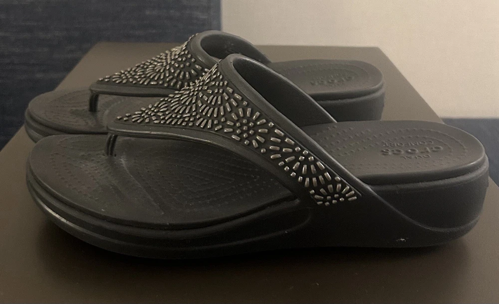 Crocs Monterey Diamante Womens Size 9 Black Thong Flip Flop Wedge Sandals 206343