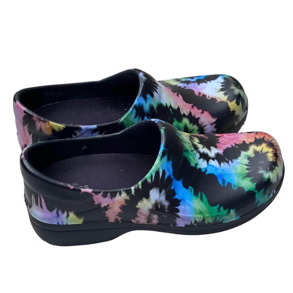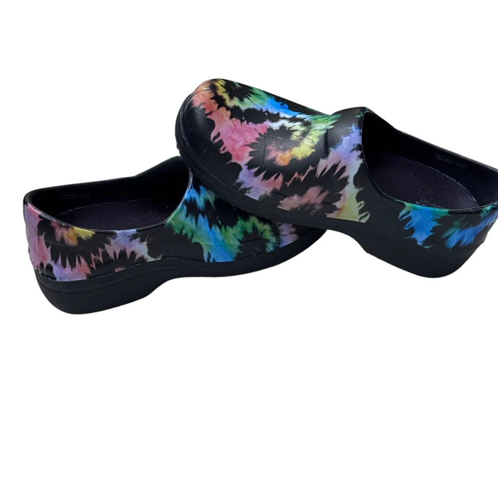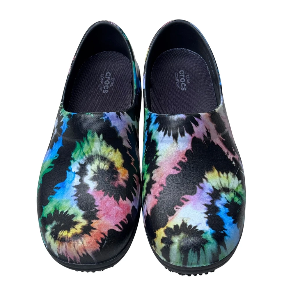 The Crocs Neria Pro II Tie Dye Nurse Clogs in size 8 are comfortable slip-on shoes designed for women. Featuring a colorful tie-dye pattern, these round toe clogs have a low heel height and are suitable for travel, casual outings, or workwear. The dual comfort design provides cushioning and support, making them ideal for activities like nursing. With a non-marking and non-slip sole, these rubber shoes offer a secure and comfortable fit for all-day wear.