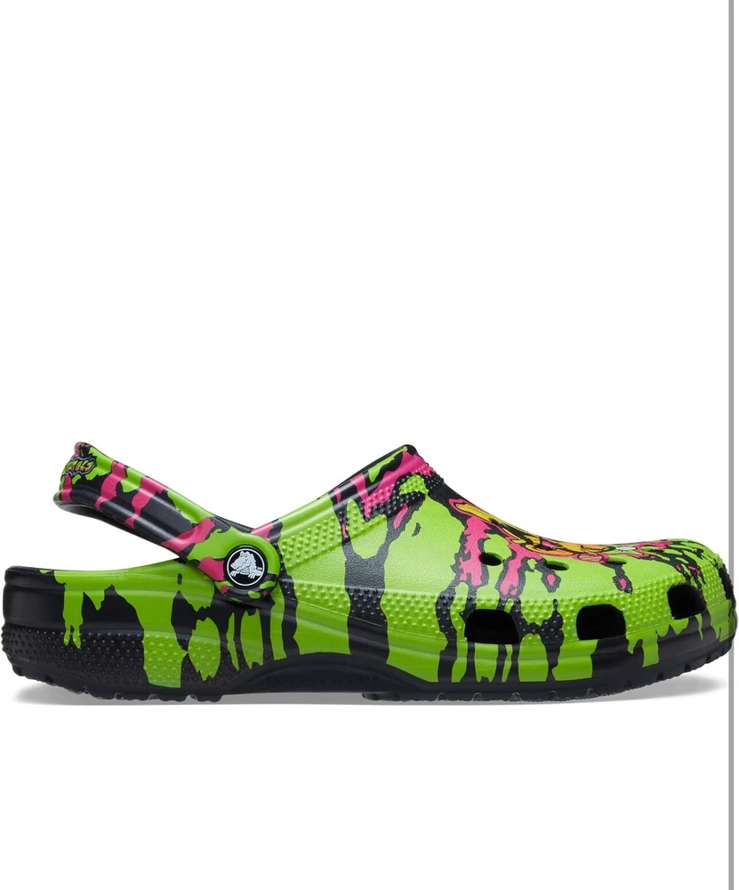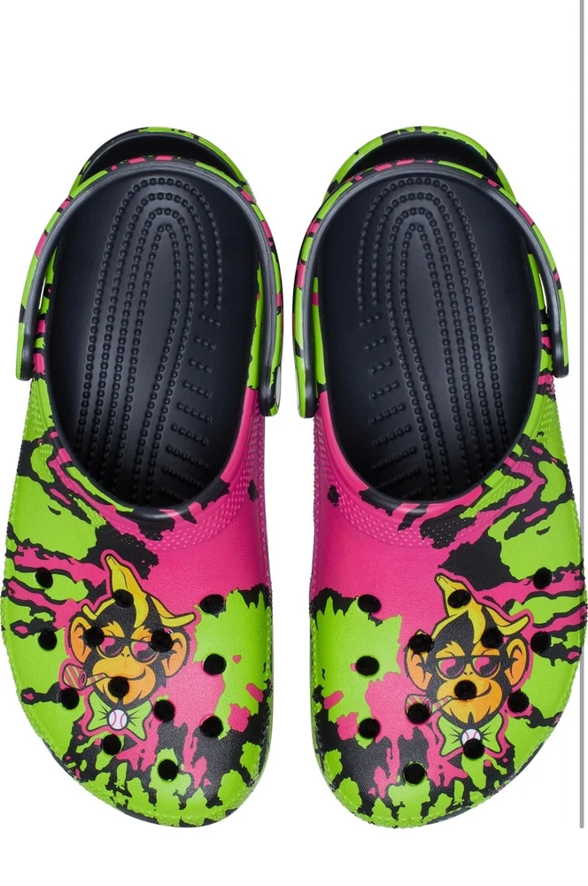Elevate your footwear game with these Crocs Savanah Bananas Classic Clogs in Party Animals print. These unisex clogs are perfect for travel, casual wear, and workwear. The round toe and pull-on closure make them easy to wear, while the rubber outsole and lining ensure comfort and durability. These clogs have a flat heel of under 1 inch, making them perfect for summer, fall, and spring wear. The standard shoe width and rubber insole material add to the comfort factor. These Crocs are perfect for fans of the classic theme and the Party Animals print. **RETAIL $70**