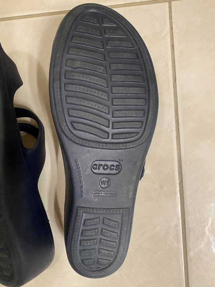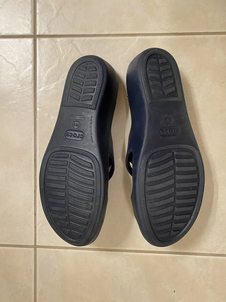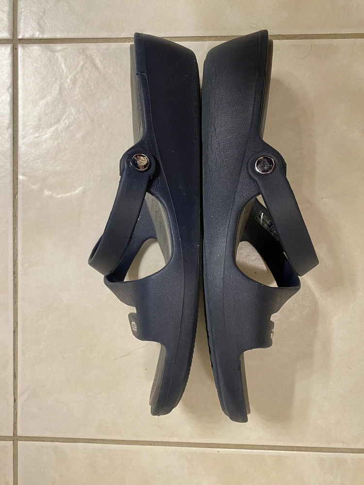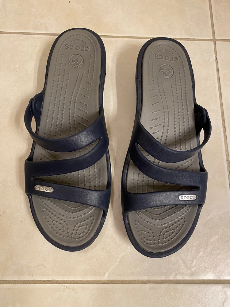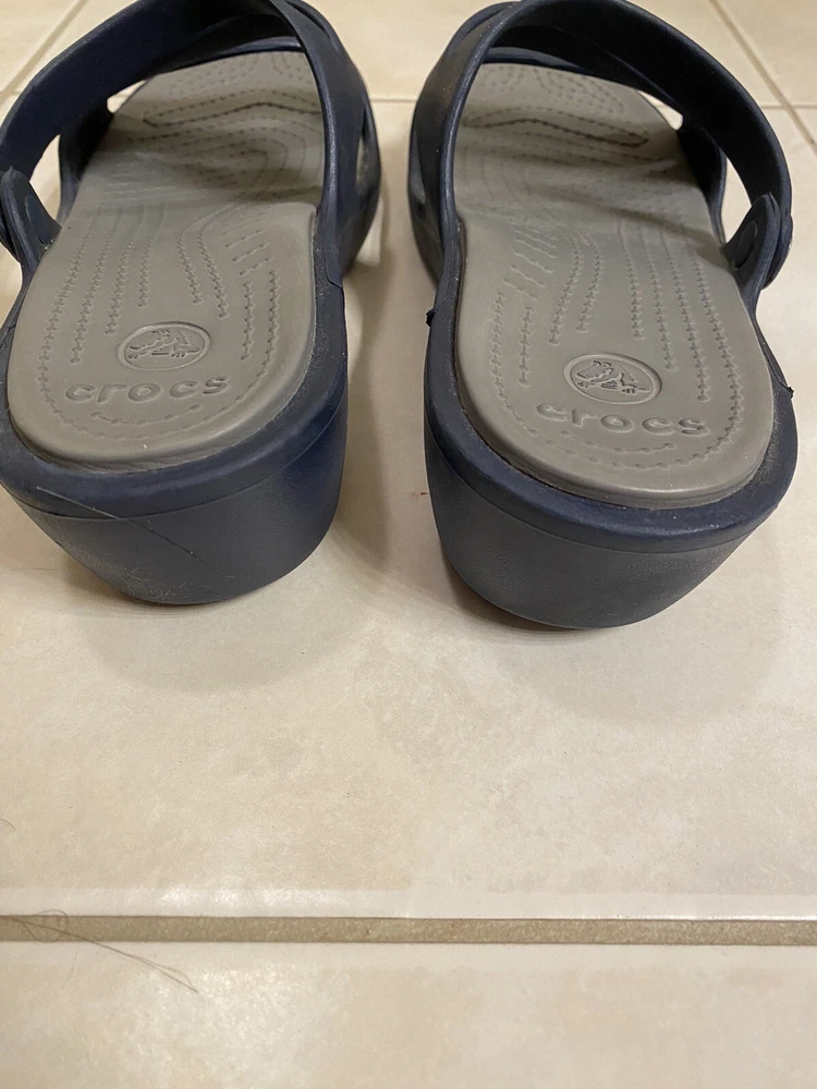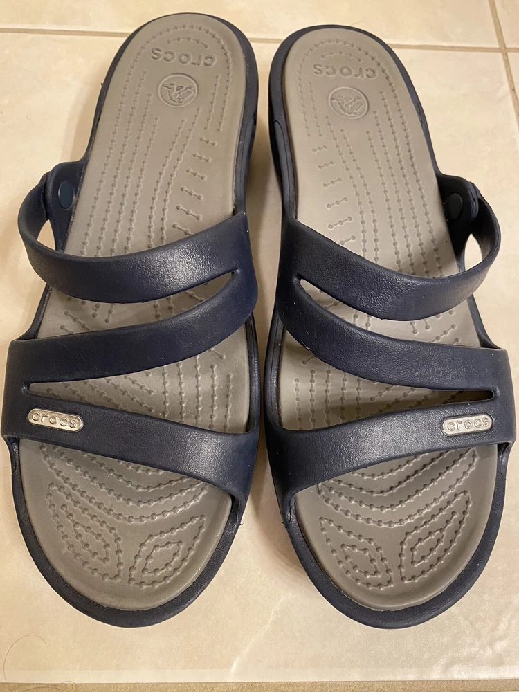 Comfortable sandals! Nice pre-owned condition. Logo button on the strap. Blue sandal with gray insole. This is a great sandal to slide into for so many occasions, from going on a cruise to just taking a quick trip to the grocery store!