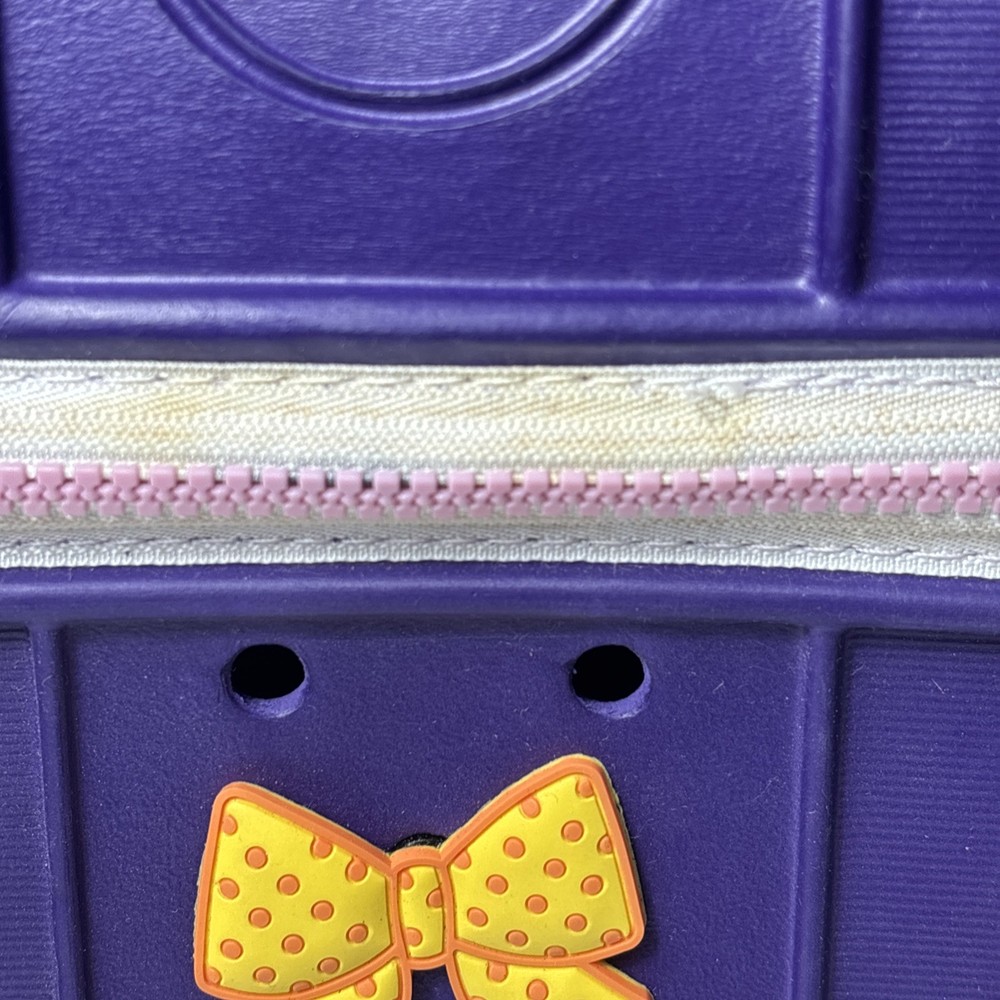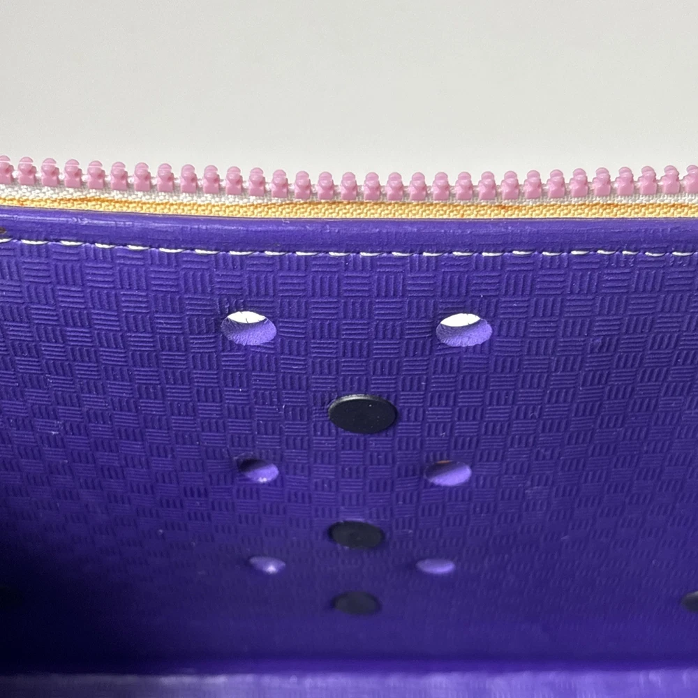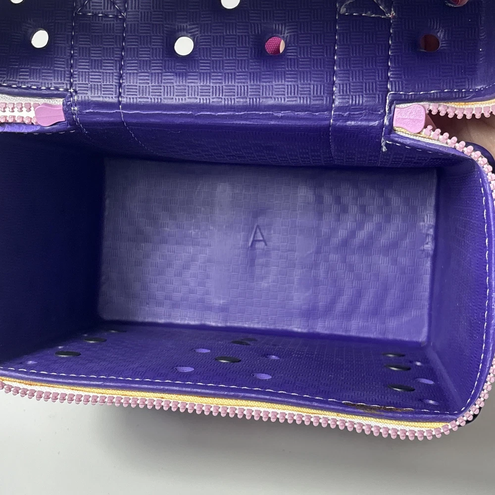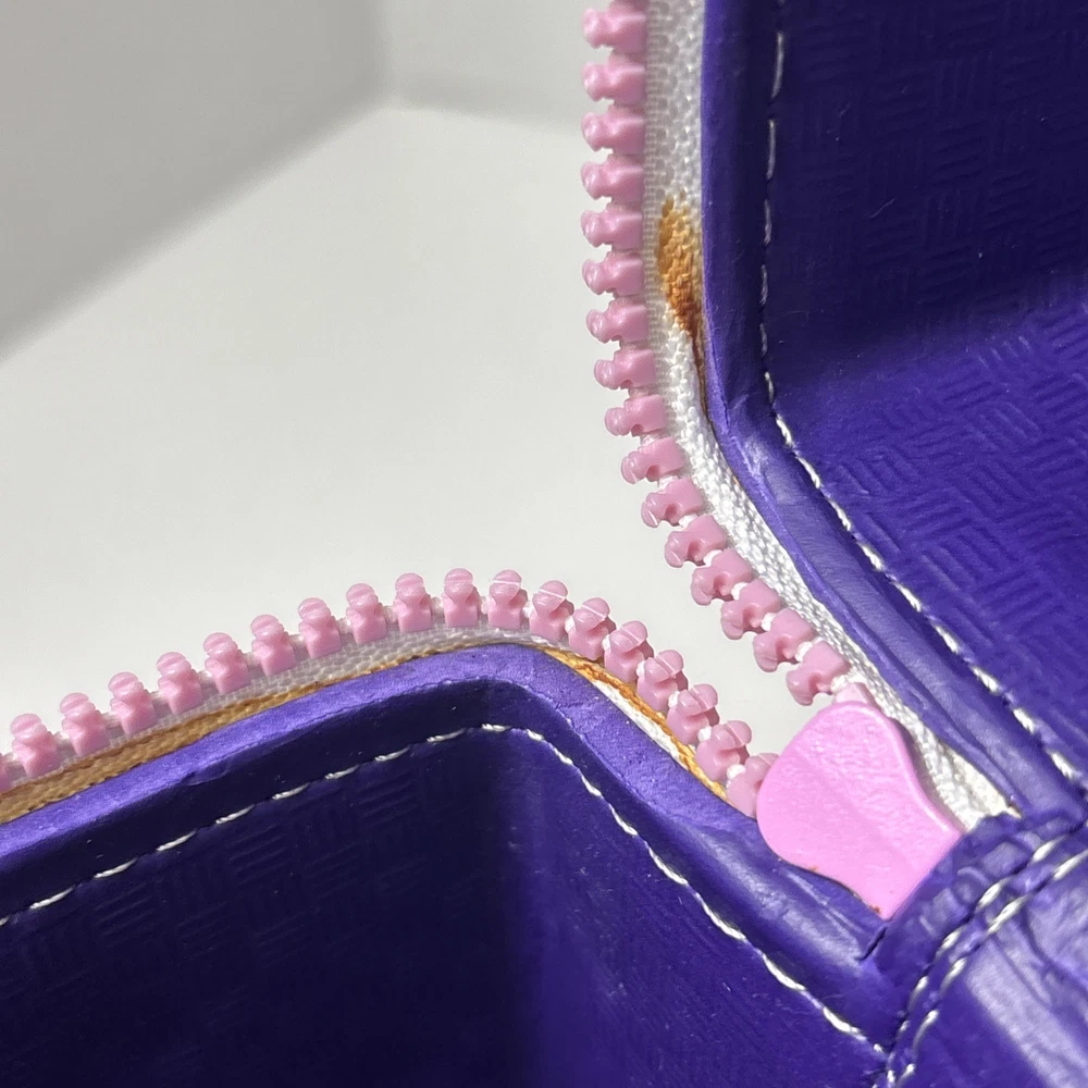 Please see pics, one faint spot where color is faded. One hole a little stretched from a jibbet and the glue that holds the zipper on is visible from the outside as a faint beige line all around.