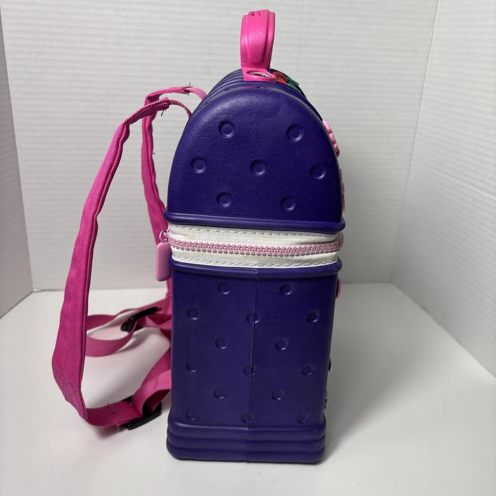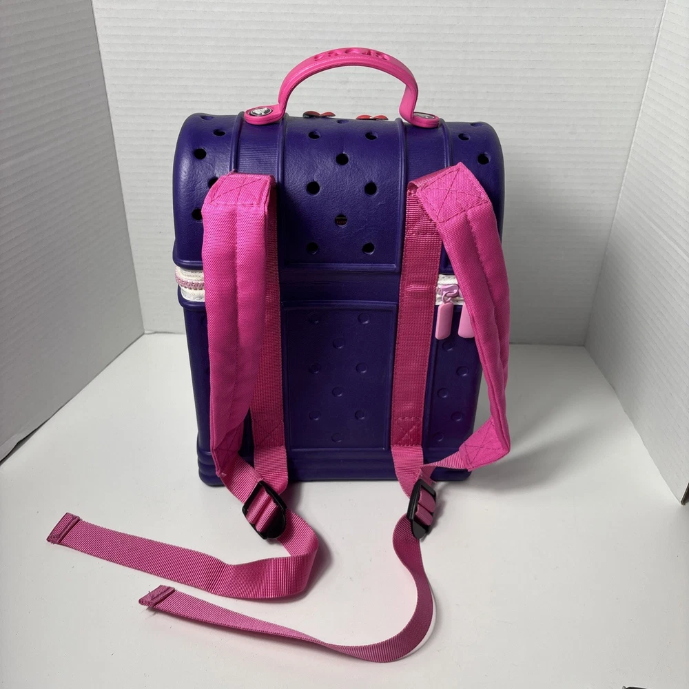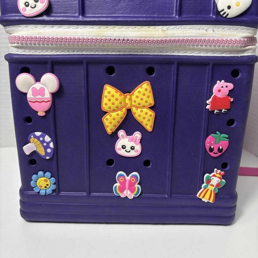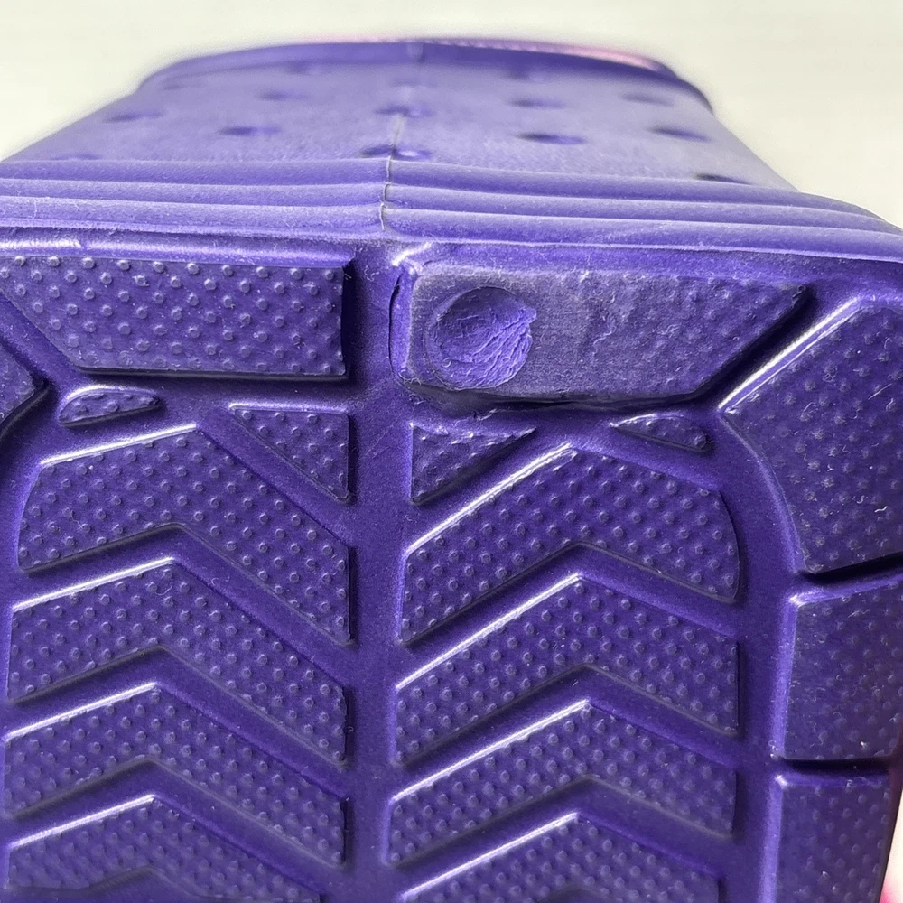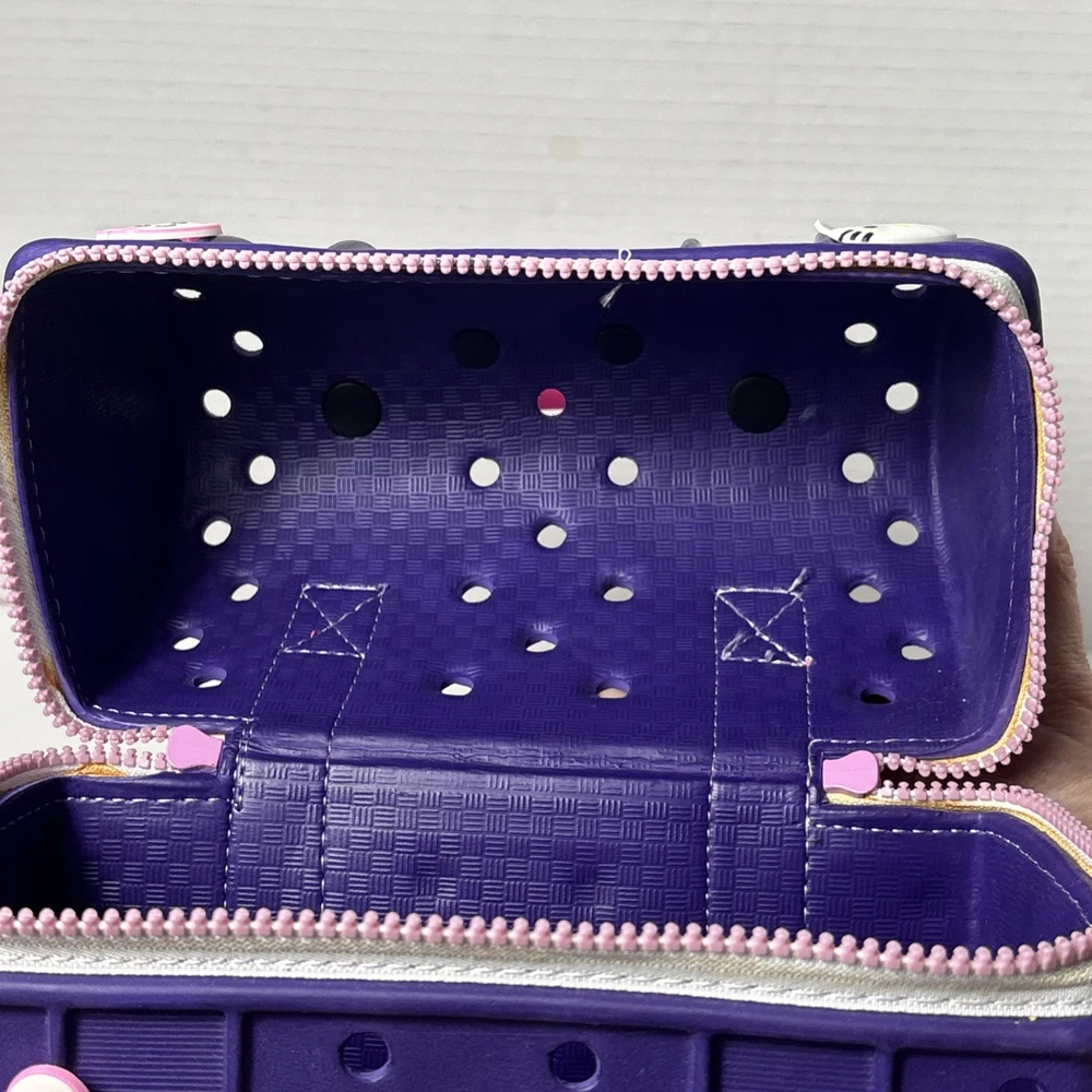 Please see pics, one faint spot where color is faded. One hole a little stretched from a jibbet and the glue that holds the zipper on is visible from the outside as a faint beige line all around.