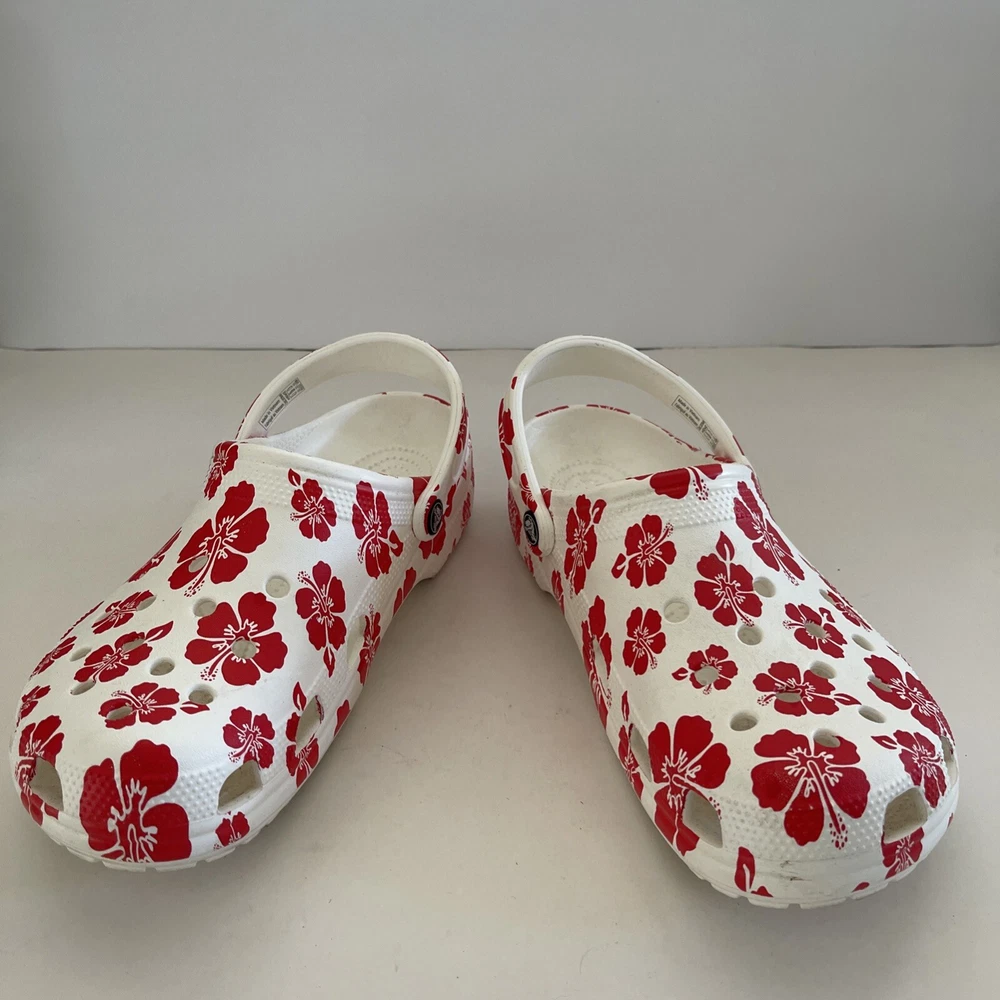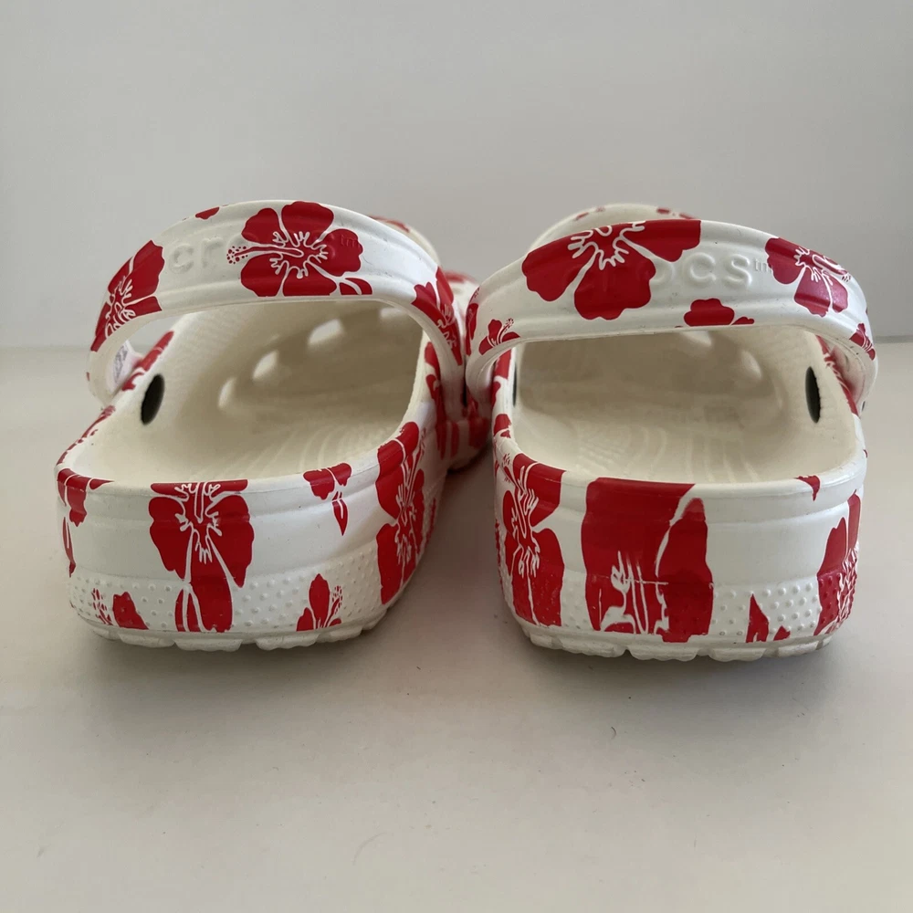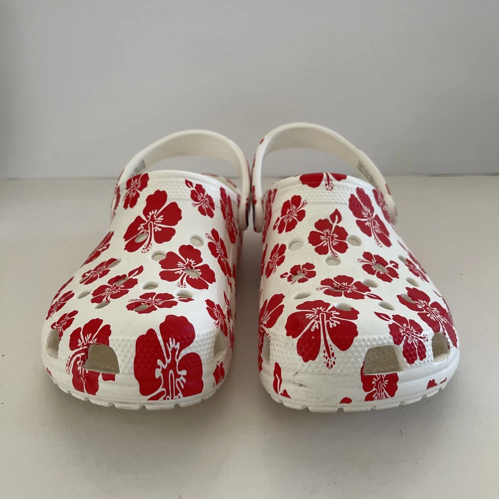 Crocs Resort White with Red Hawaii Floral Hibiscus all over Print Clogs size Men 10 / Women 12