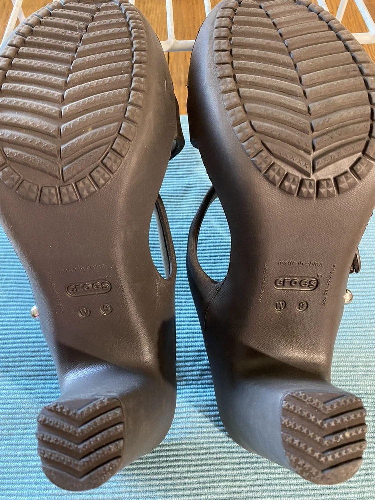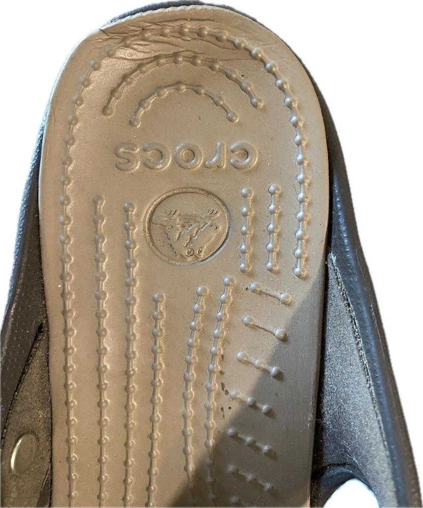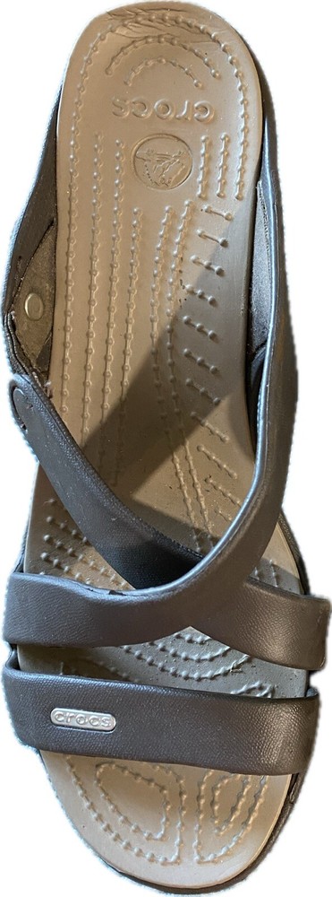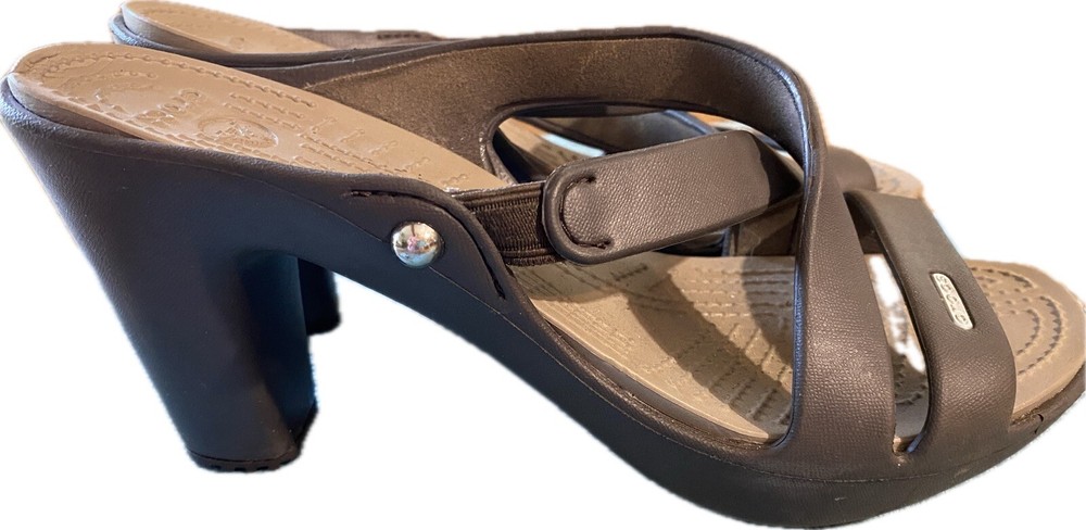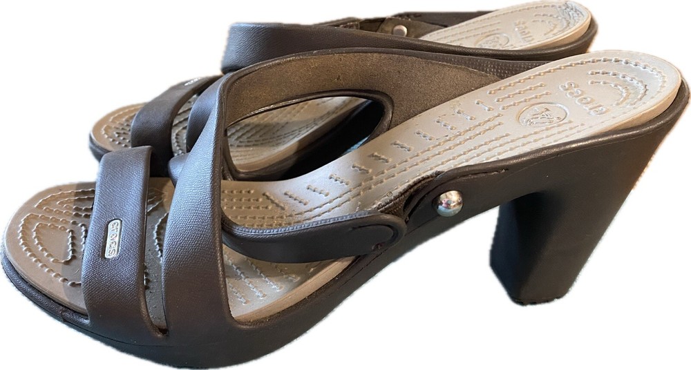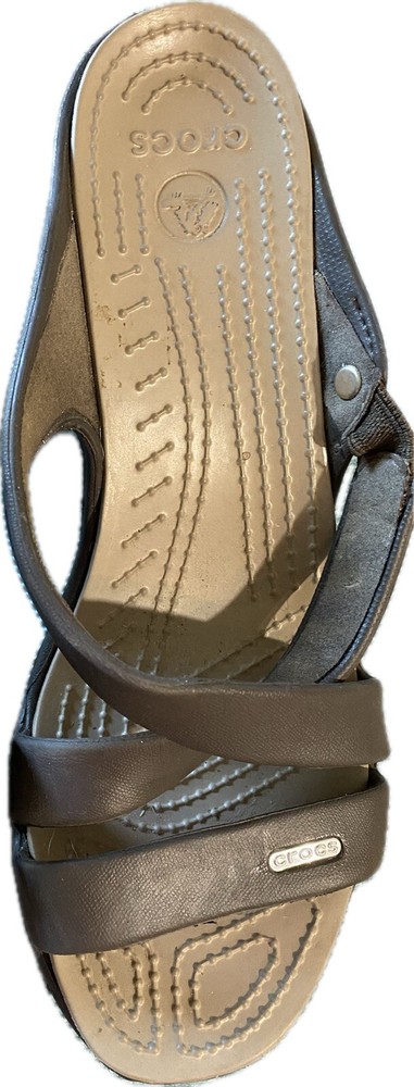 Elevate your summer style with these brown Crocs Cyprus IV sandals. Slip-on and slide into comfort with the chunky block heel and standard shoe width. These sandals feature a solid pattern, synthetic lining and upper material, and synthetic outsole material. Perfect for a day out, these sandals are customized for your fashion needs with no vintage style. The Crocs Comfort Slide product line offers a high heel height of 3-3.9 inches with a slip-on closure. The synthetic insole material adds extra comfort for all-day wear. See picture of right shoe, back of insole slight defect.