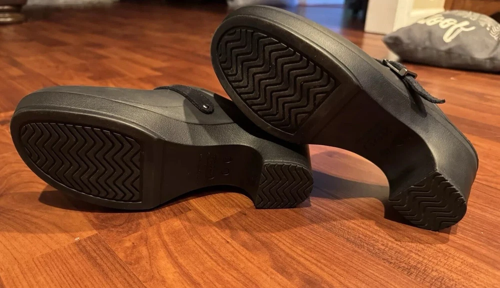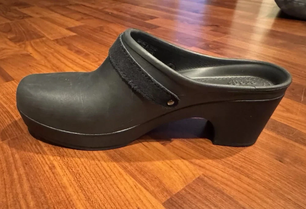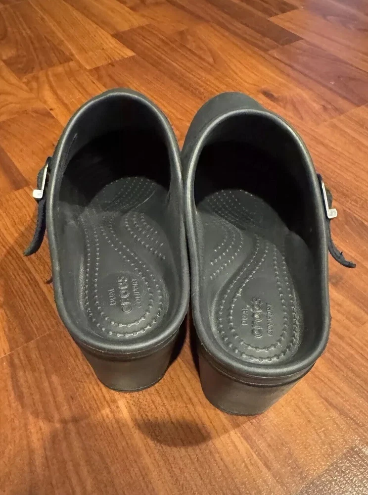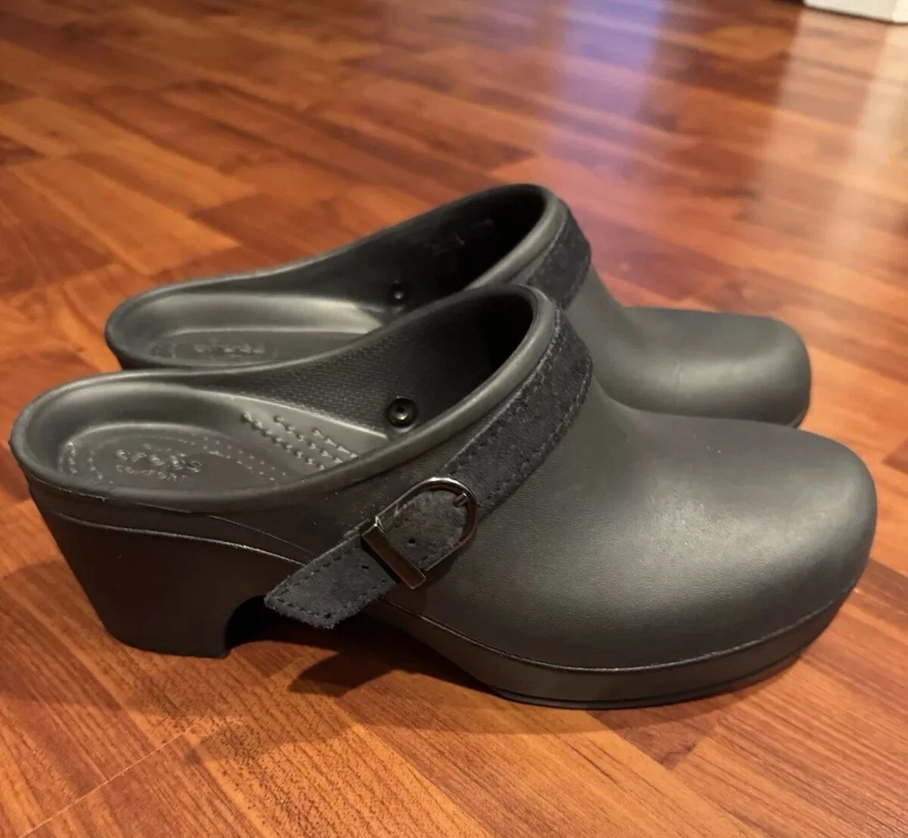 These are Crocs Sarah clogs for women in black, size 8, featuring a closed toe. They have a mid-height heel, suitable for travel and casual wear in summer, fall, and spring. The rubber outsole and breathable design offer comfort for walking and everyday wear. Excellent pre-owned condition. No flaws to notes. Coming from a smoke-free home.