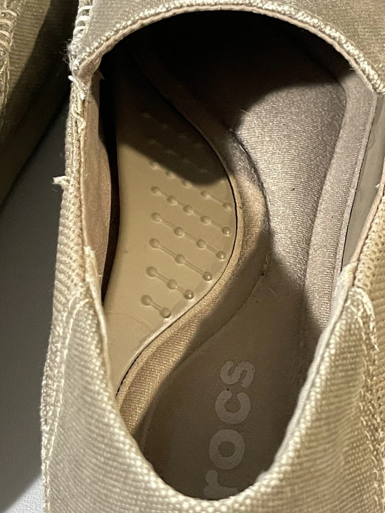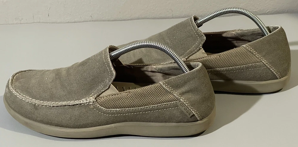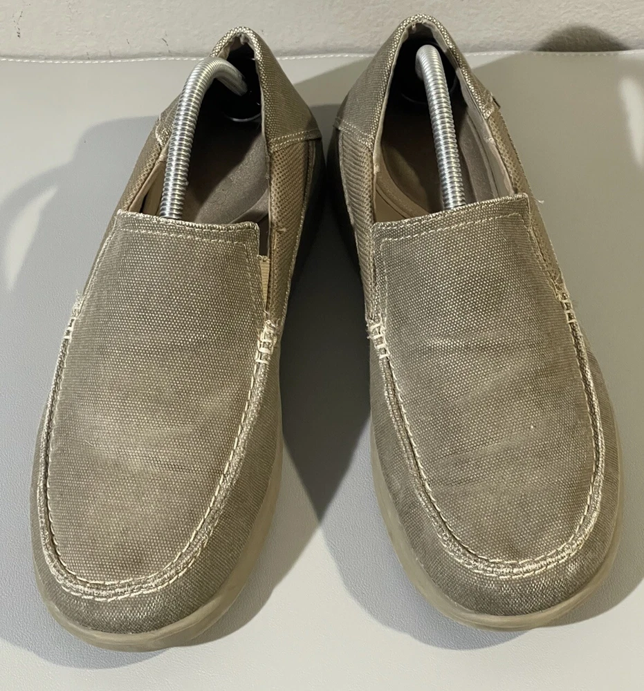 The Crocs Shoes Men's Size 14 Slip-On Canvas Comfort Loafer Shoe is designed for casual wear and offers a comfortable fit. The shoe features a solid beige canvas upper with a round toe shape and slip-on closure for easy wearing. Ideal for travel, activewear, or everyday casual use, this Crocs shoe is crafted with a fabric lining, rubber insole, and a comfortable design that is suitable for summer, fall, and spring seasons. Perfect for men looking for a versatile and easy-to-wear shoe option.