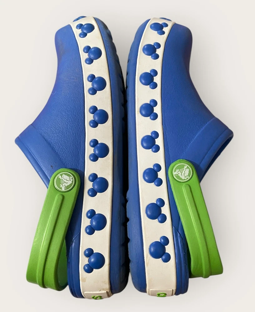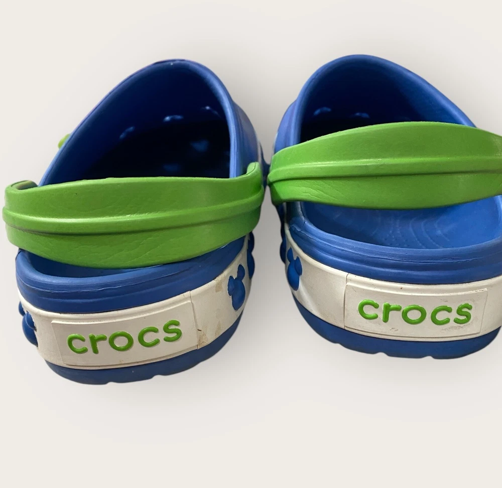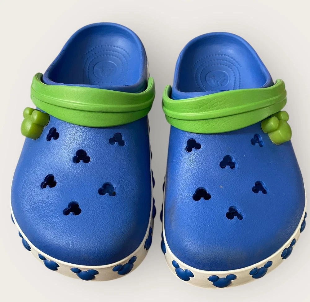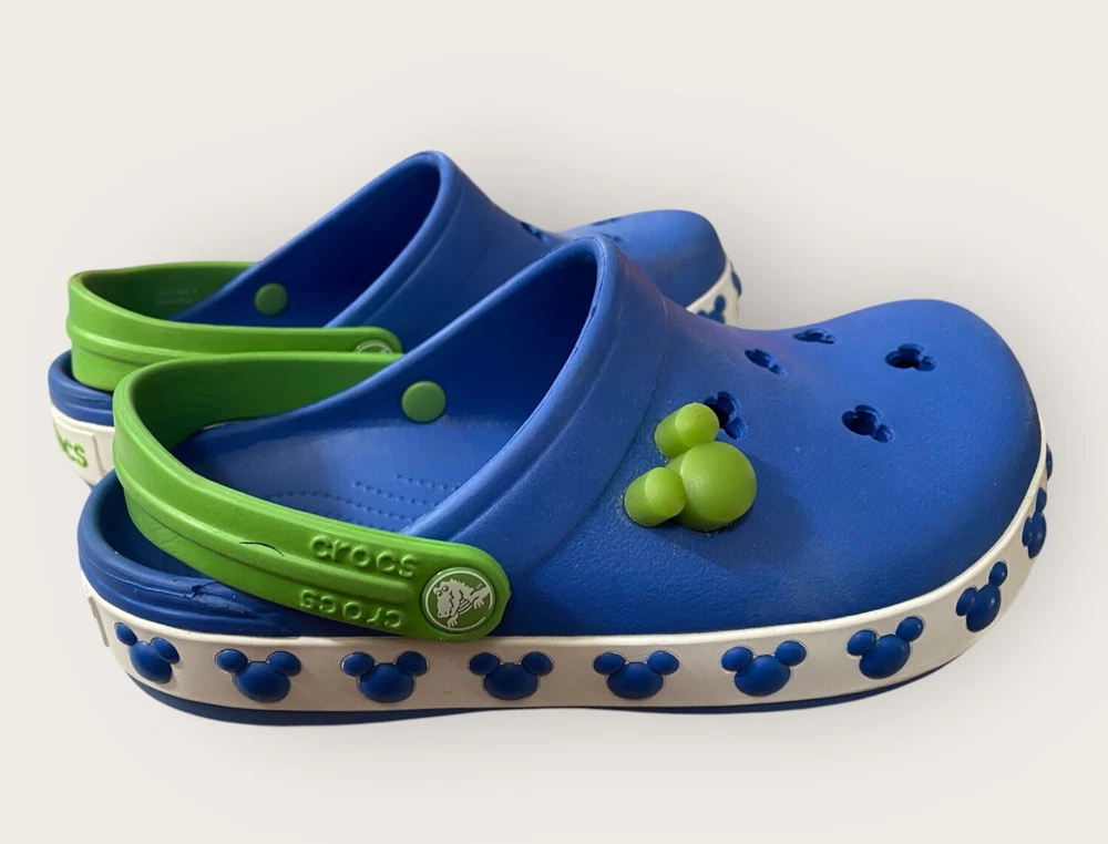 Add some Disney magic to your child's footwear with these Crocs Disney Blue Mickey Mouse Cut Outs Clogs. These sandals feature a round toe shape and slip-on closure for easy wearing. The upper is made of durable rubber material with cut-out accents of Mickey Mouse, making it a perfect choice for any Disney lover. The flat heel style and standard shoe width ensure comfort, while the rubber outsole provides good traction. Unisex Size J3 Blue Lime Green Get your child ready for any adventure with these stylish and functional Crocs Disney clogs. See full description