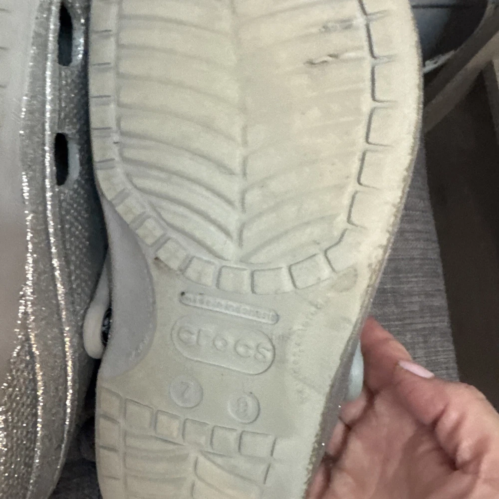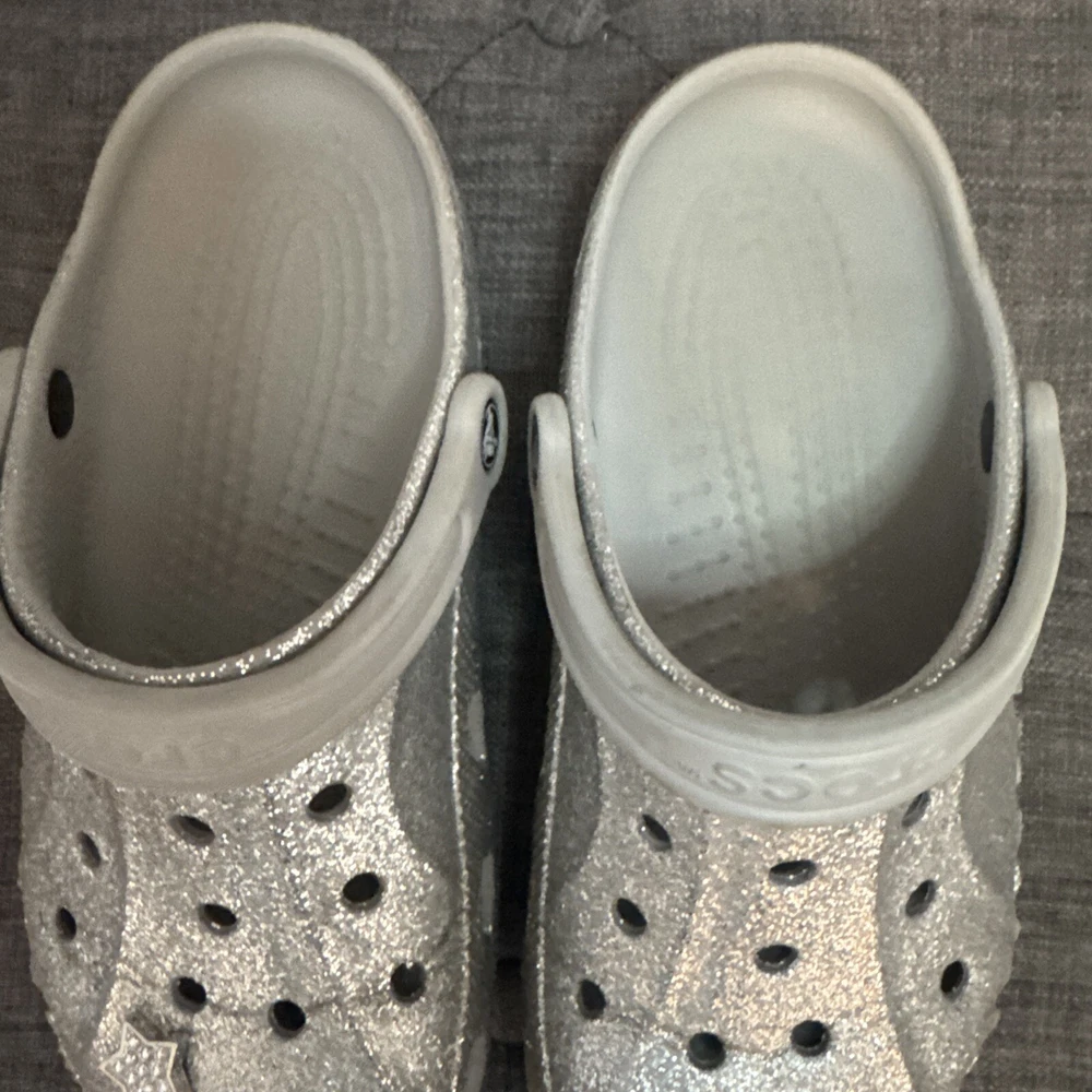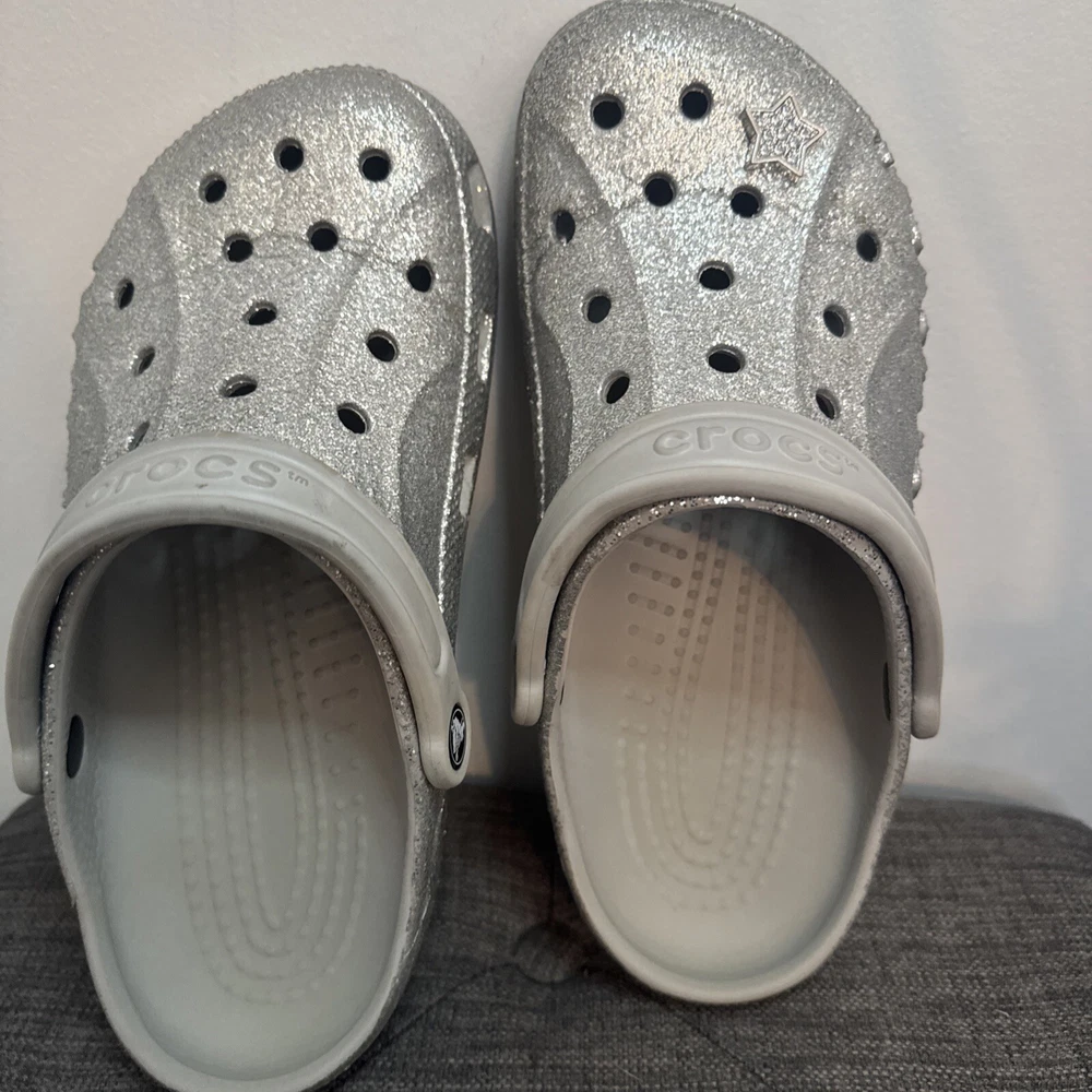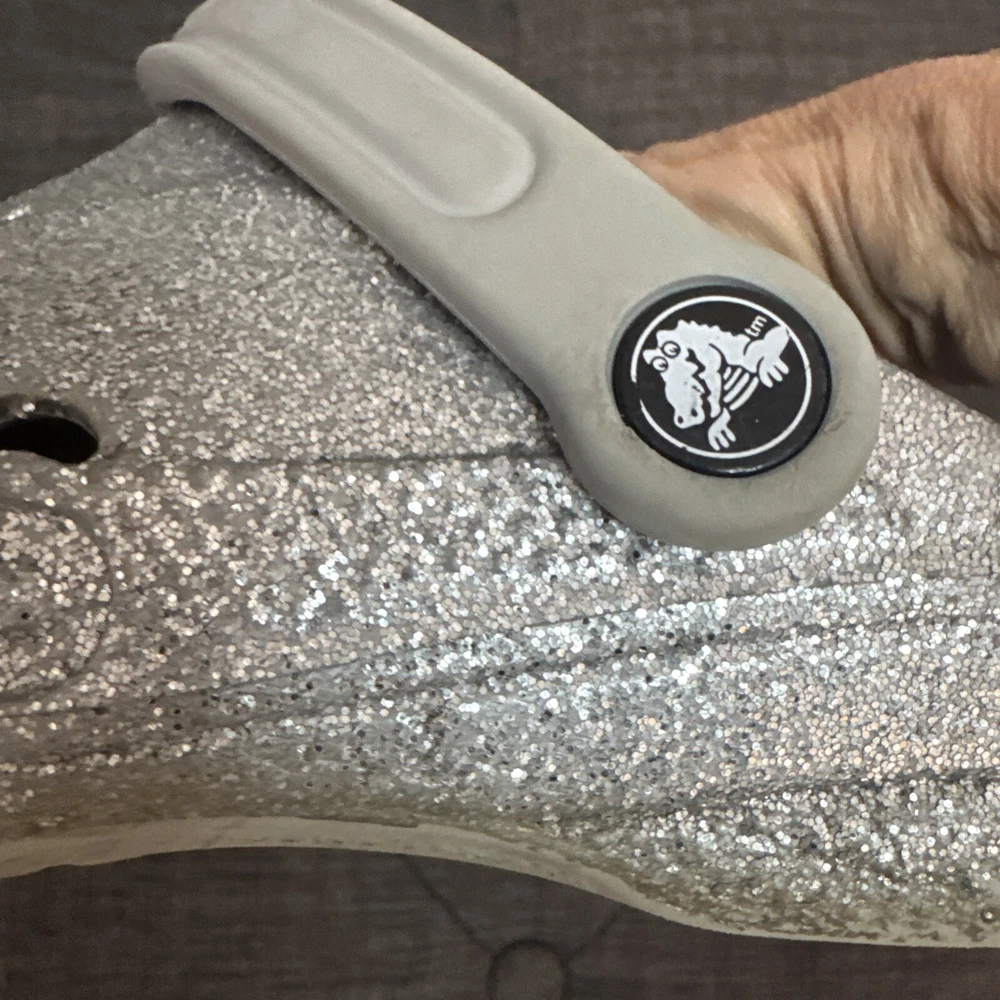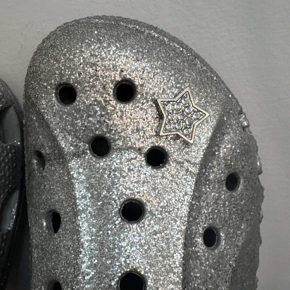 Crocs Silver Glitter Clog Shoes are unisex, featuring a round toe, slip-on closure, low heel, and ankle strap. The silver color with a classic design and colorful accents make them suitable for travel, activewear, casual, and workwear occasions. These lightweight clogs provide cushioned comfort, arch support, and breathability, ideal for walking, school, beach, skateboarding, and fishing activities in any season.