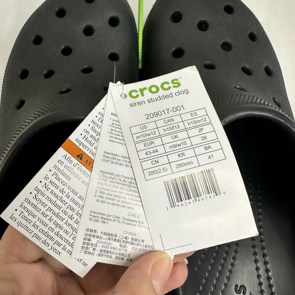 Crocs Siren Studded Unisex Adult Clog Size W12 / M10 Black 209017-001 New No one can resist the Siren. Indulgent, alluring and uncompromising, this silhouette is ready for a night out. This true high heel style with a sleek look and feel brings a feminine spin to the Classic with comfort that keeps you on your feet through the wee hours. -Sole material Resin -Outer material Resin -Closure type Pull-On -Water resistance level Water Resistant • Molded TPU heel cup • Ventilation ports add breathability and help shed water and debris • Easy to clean and quick to dry • Lightweight and flexible with 360 degree comfort and Iconic Crocs Comfort For full details and description, please refer to the pictures. All measurements are approximate and lighting may vary on pictures. Please ask any questions before purchasing. I answer most questions instantly! Reasonable offers considered. FAST SHIPPING! #1037