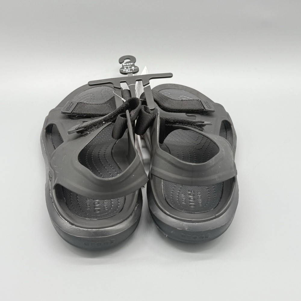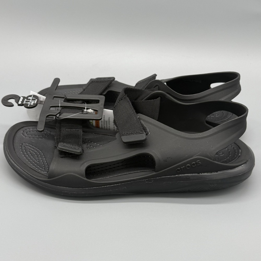 The Crocs Swiftwater Expedition Sandal M in Men's Size 8 is a versatile and comfortable slip-on sandal perfect for travel, casual wear, and work. With adjustable straps, cushioning, and a waterproof synthetic outsole, these sandals provide comfort and support for all-day wear. The black solid pattern and logo accents add a stylish touch to the lightweight and breathable design. Whether you're exploring the outdoors or running errands, these Crocs Swiftwater Expedition Sandals are a reliable choice for any season.