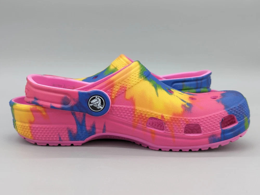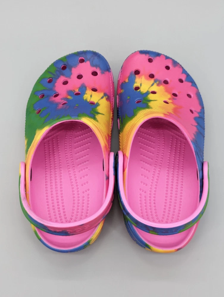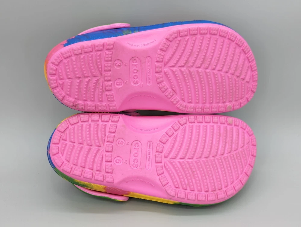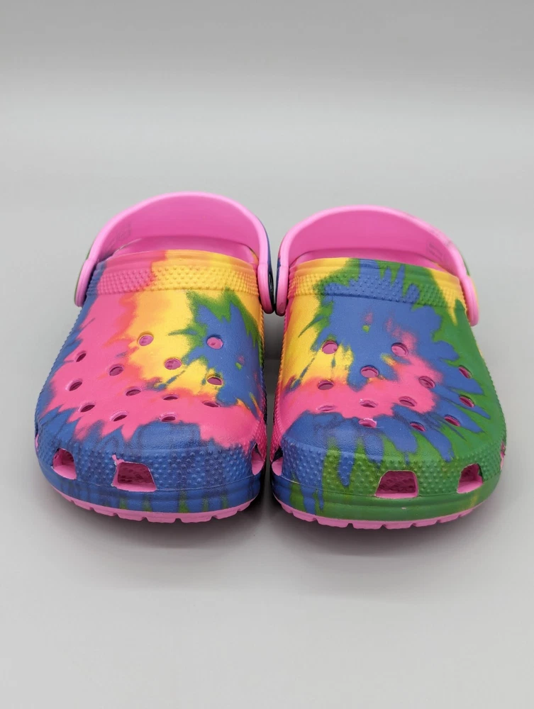 Crocs Tie Dye Electric Pink Blue Green Slip On Shoes 205453 Size Ladies 5 Mens 3 Cleaned and sanitized. Light wear.