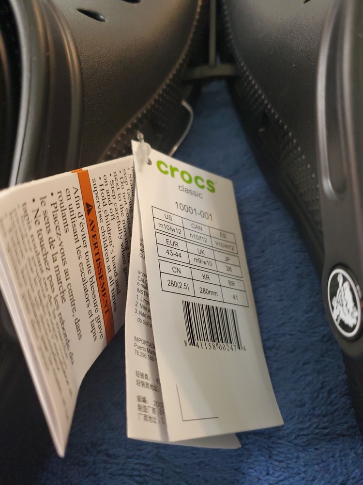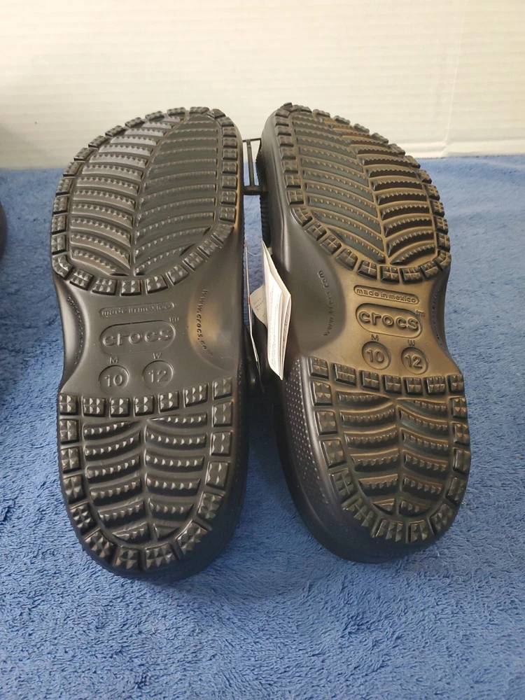 Step out in style with these classic black Crocs clogs. The perfect choice for a versatile and comfortable shoe, these sandals are made of durable rubber and are suitable for men and women alike. With a US shoe size of 10, these Crocs are a great addition to any wardrobe. The unisex Crocs Classic Clogs feature a slip-on design that is easy to wear and remove. The outsole is also made of rubber, providing excellent grip and traction. The Crocs have a simple and timeless design that is suitable for any occasion. WILL SHIP IN A STURDY BOX. WE WILL COMBINE SHIPPING ON MULTIPLE ITEMS IF POSSIBLE. PLEASE CHECK OUT OUR OTHER ITEMS. THANKS FOR LOOKING.