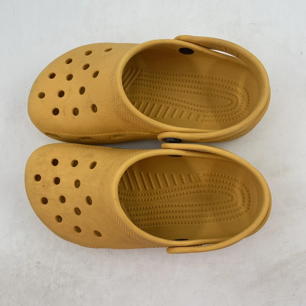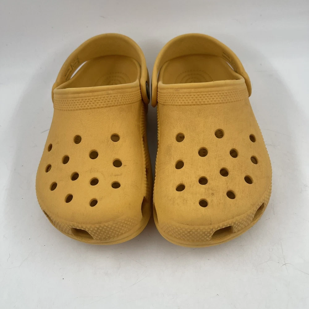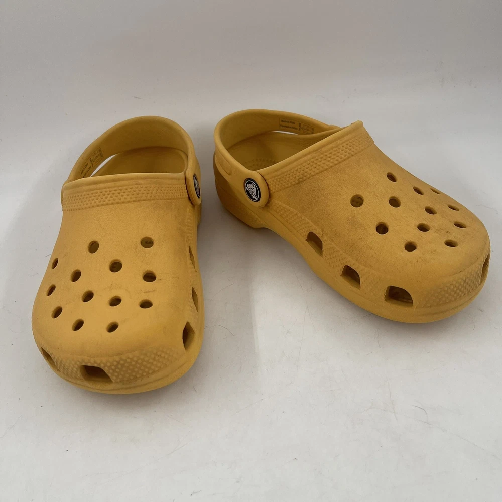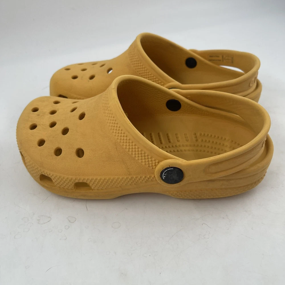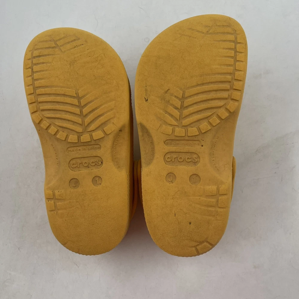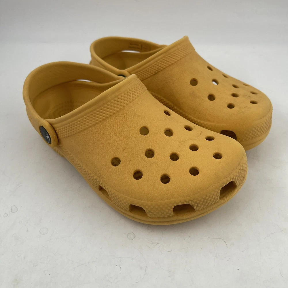 Shoe Width: Standard Heel Style: Flat Season: Fall, Spring, Summer Theme: Beach, Going Out, Modern Brand: Crocs Character: Clogs Character Family: Clogs Closure: Slip On Heel Height: Flat (Under 1 in) Upper Material: Croslite Lining Material: Croslite Vintage: No Occasion: Casual, Travel Country/Region of Manufacture: China Type: Casual Product Line: Crocs Classic UPC: Does not apply Insole Material: Croslite Model: Crocs Classic Toe Shape: Closed Toe Pattern: Solid Style: Clog Performance/Activity: Beach, Walking Department: Unisex Kids AU Shoe Size: 13.5 Outsole Material: Croslite gtin13: Does not apply Shoe Shaft Style: Low Top Accents: Logo Color: Yellow UK Shoe Size: 13.5 US Shoe Size: J 1 Features: Breathable, Comfort, Lightweight