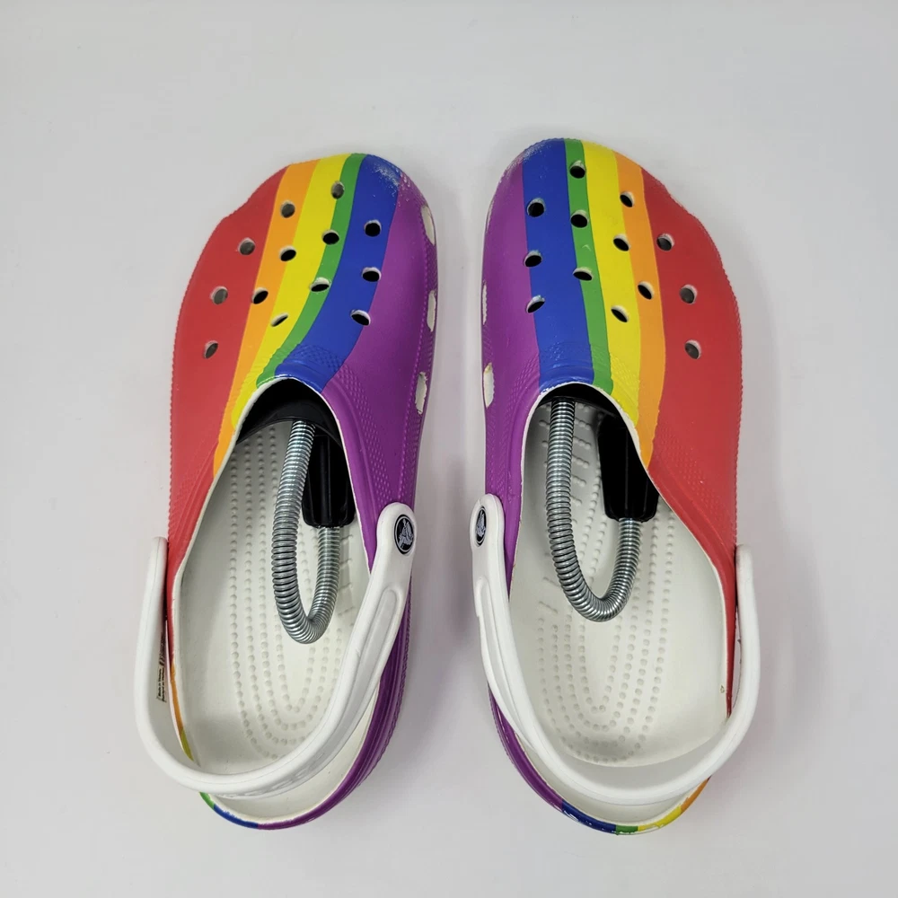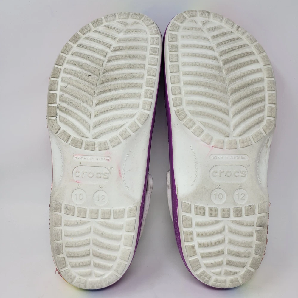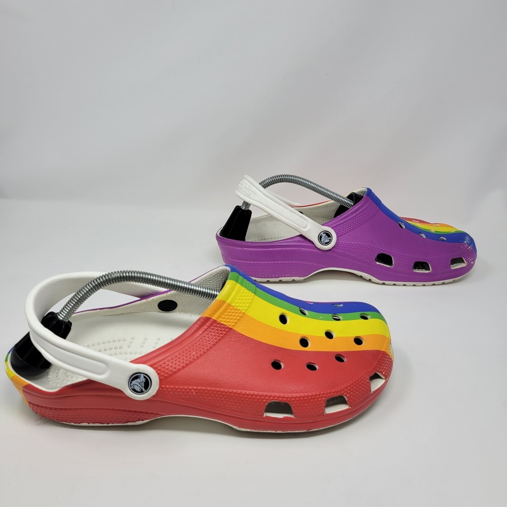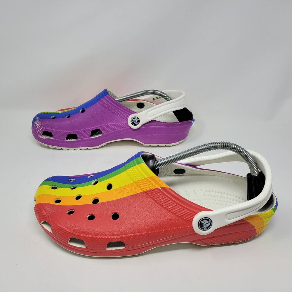 Crocs Men's Size 10 Women's Size 12 Rainbow Multi Pride Clogs Slip Ons Shoes are unisex round toe clogs with a multicolor rainbow pattern. They feature an ankle strap, logo accents, and are lightweight and breathable, making them suitable for travel, casual wear, work, and activewear. These synthetic clogs have a standard shoe width and a synthetic lining, with a synthetic upper and insole material. Perfect for those who appreciate art, hippie, bohemian, and outdoor themes. These shoes are in excellent “pre owned” condition. For more information, please see photos or feel free to contact me with any questions. All orders are shipped within 24 hours of payment received.