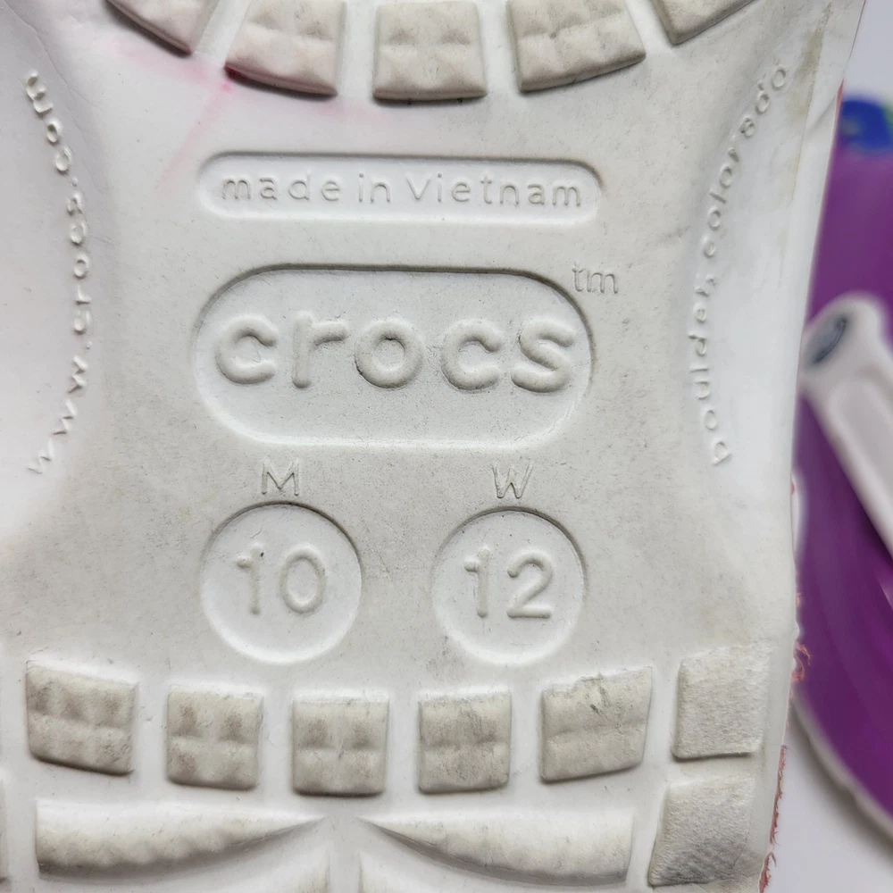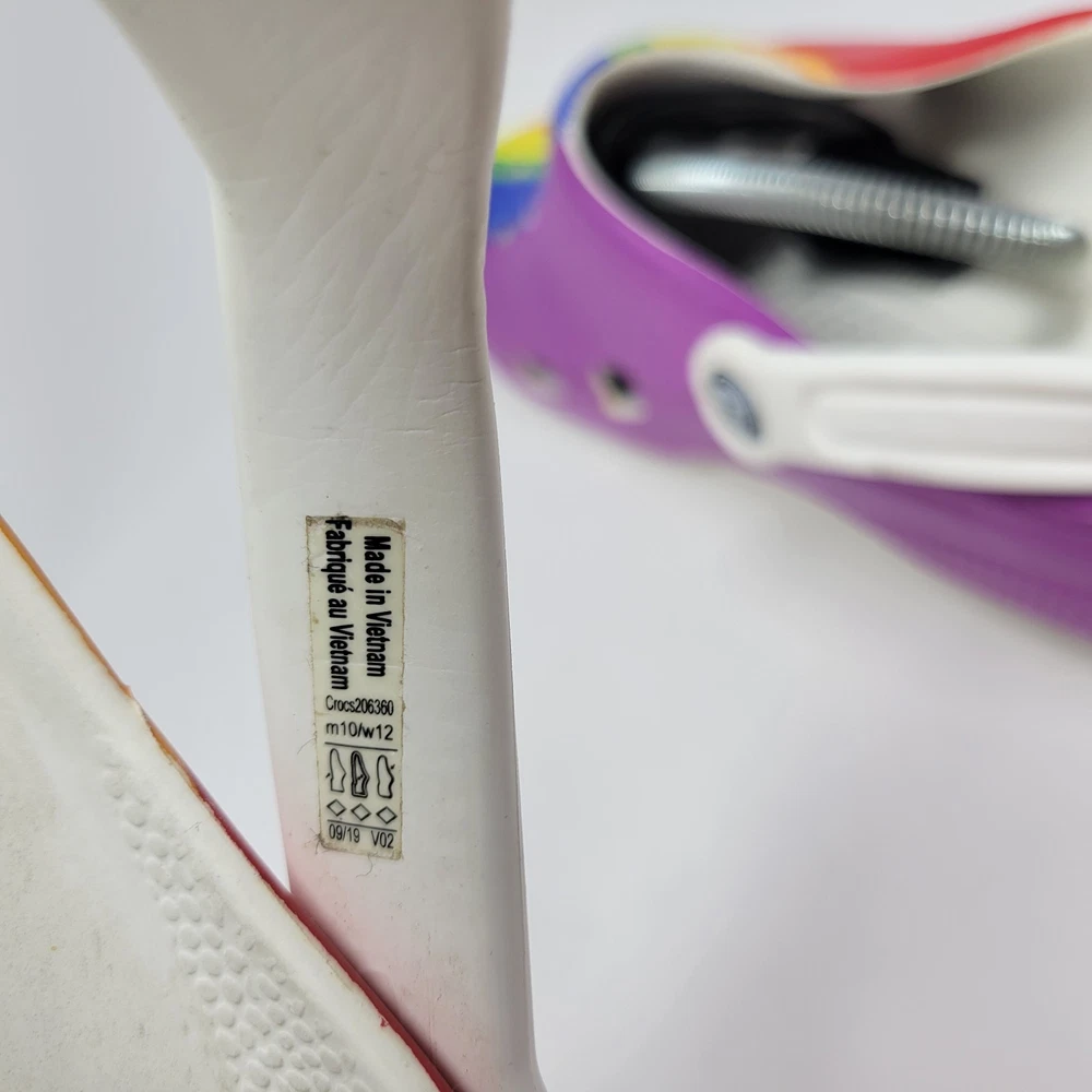 Department: Unisex Adults Lining Material: Synthetic Closure: Slip On Fabric Type: Blended Fabric Product Line: Crocs Classic Upper Material: Synthetic Pattern: Rainbow Theme: Hippie, Sports, Art, Bohemian, City, College, Logo, Outdoor Brand: Crocs Outsole Material: Synthetic Type: Casual Color: Multicolor Model: Crocs Classic Clogs Vintage: No US Shoe Size: 10 Customized: No UK Shoe Size: 11 Accents: Logo Insole Material: Synthetic Features: Breathable, Comfort, Lightweight, Ankle Strap, Straps Style: Clog Shoe Width: Standard Occasion: Casual, Travel, Activewear, Workwear EU Shoe Size: 44 Toe Shape: Round Toe Season: Fall, Spring, Summer, Winter Country/Region of Manufacture: Vietnam