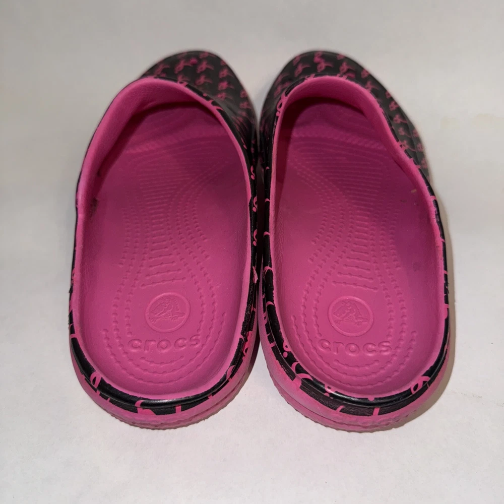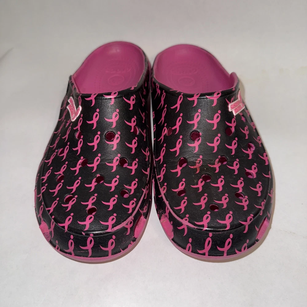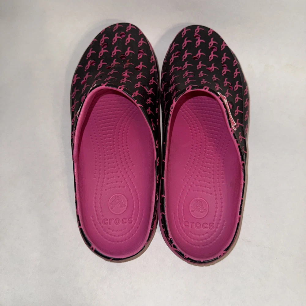 This Crocs mule shoe is a pre-owned women's size 7 in a pink and black color scheme with a Breast Cancer Awareness design. The shoe features a closed toe, slip-on style, and a relaxed fit, making it ideal for travel, casual wear, and work. It has a flat heel, lightweight construction, and is water-friendly with non-marking soles. The shoe is part of the Crocs freesail Susan G. Komen collection, offering comfort and breathability for activities like walking, beach outings, and school.