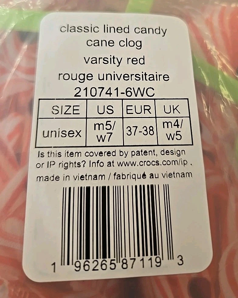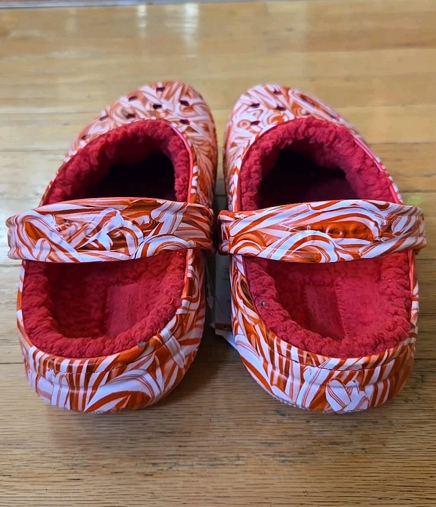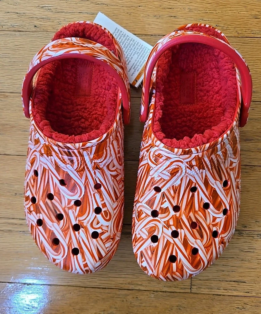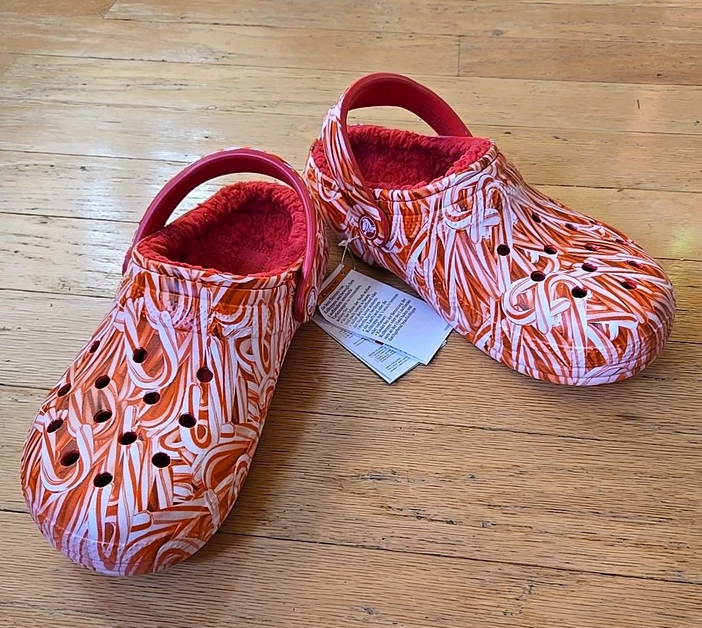Elevate your comfort and style with these festive Crocs Classic Lined Candy Cane Clogs. Perfect for both women and men, the size 7W / 5M clogs feature a playful candy cane pattern in red and white, making them a great addition to your Christmas attire. The synthetic upper material and lining ensure a comfortable fit, while the almond toe shape and flat heel style provide a smooth and stable stride. These slip-on sandals are versatile and suitable for various occasions, including travel, activewear, casual outings, and workwear. The synthetic outsole material offers durability, and the standard shoe width adds to the overall comfort. Whether you're walking on the beach, going to school, or just lounging around, these Crocs Candy Cane clogs are a perfect choice for a stylish and comfortable footwear option.