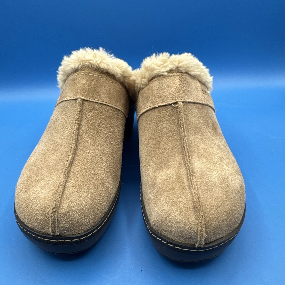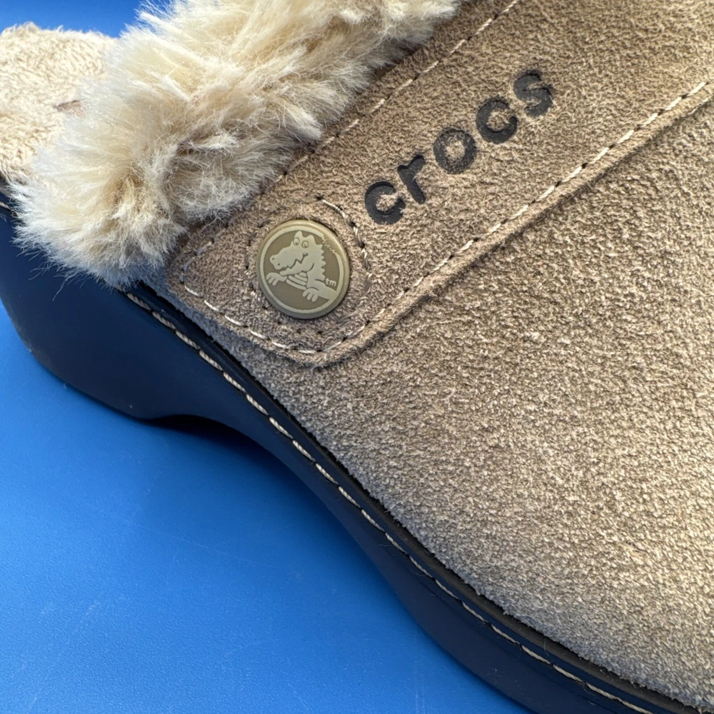 These Crocs Women's mule clogs are designed in brown suede with a faux fur lining for added comfort. They are slip-on style shoes with a faux suede outsole, perfect for casual wear. The size is women's 7, making them suitable for everyday use. Pre owned. Hardly used. No original box. Excellent condition. Size 7W. Please check the pictures carefully as part of the description. Feel free to ask questions if you need more information before you buy it. Thank you for your interest B-11