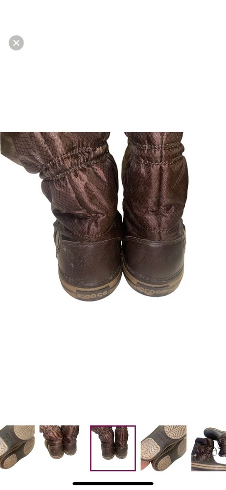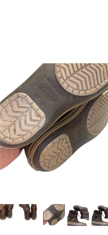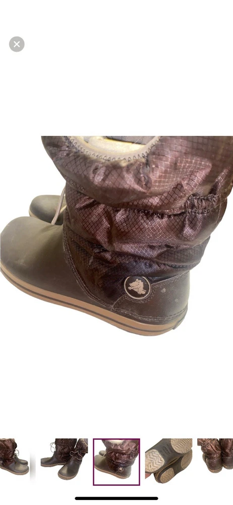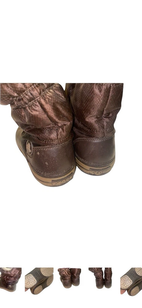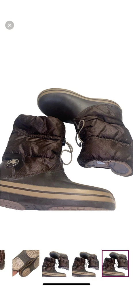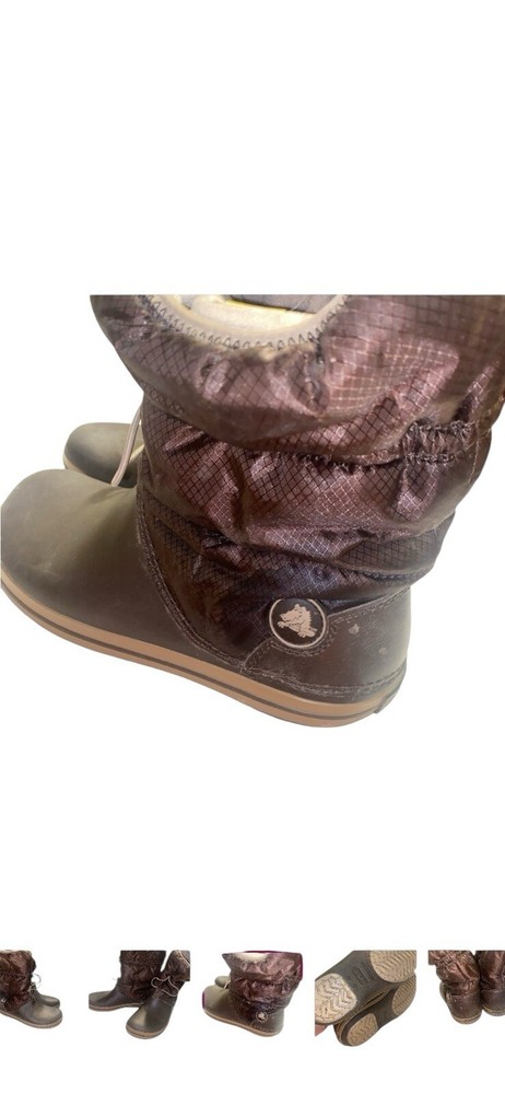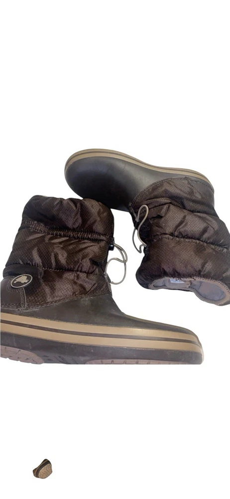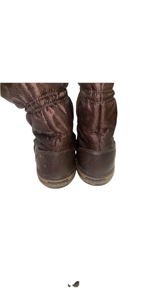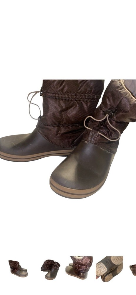 Crocs Women's Winter Puff Boot in size 10 features a round toe, pull-on closure, low heel, quilted accents, and a vintage style. Designed for winter wear, the mid-calf snow boot is lined with synthetic material and has a rubber outsole. The brown boot from the Crocs Drew Barrymore collection is a stylish and comfortable choice for outdoor activities and casual wear.
