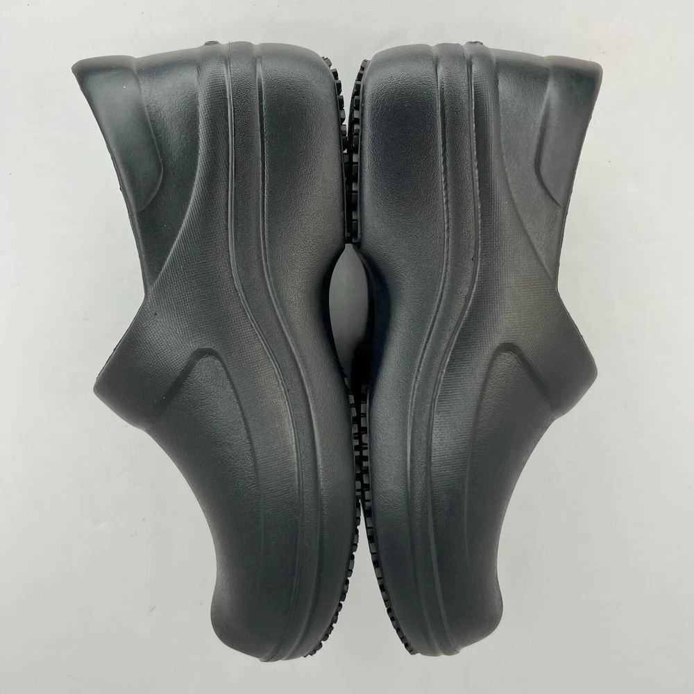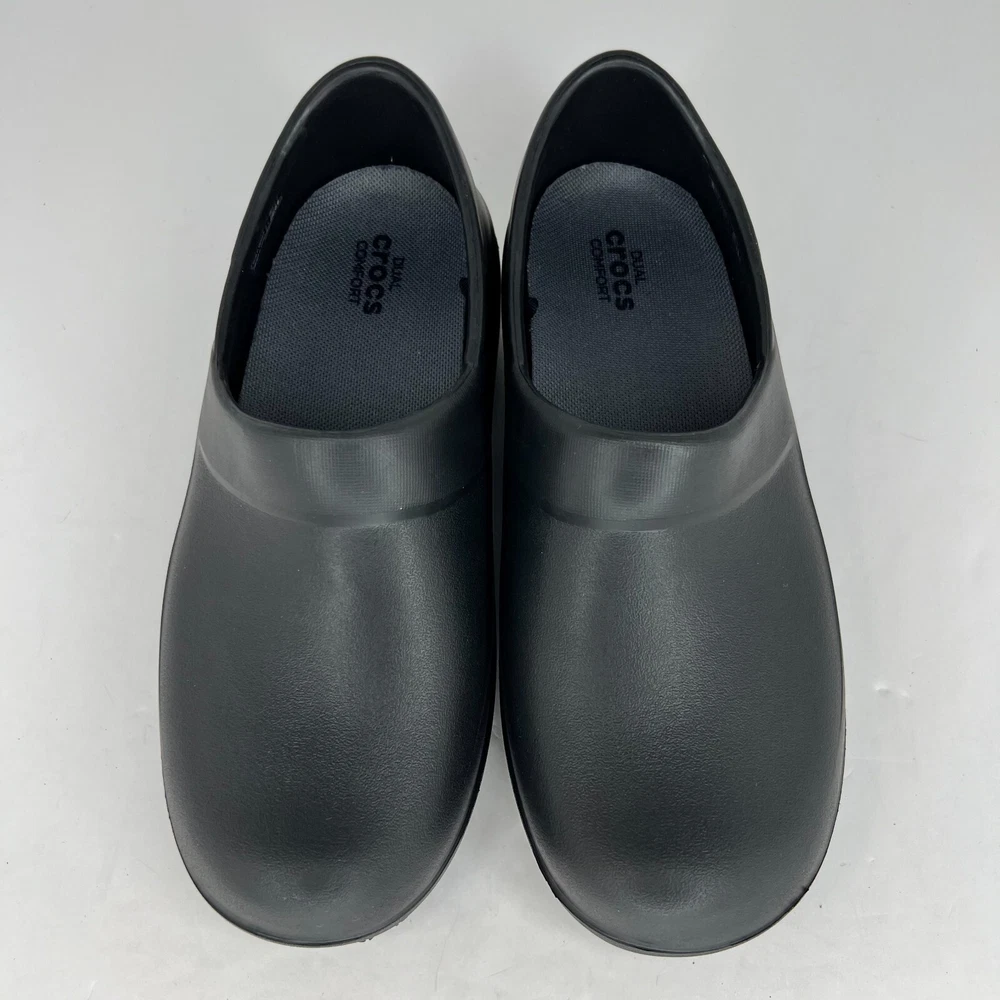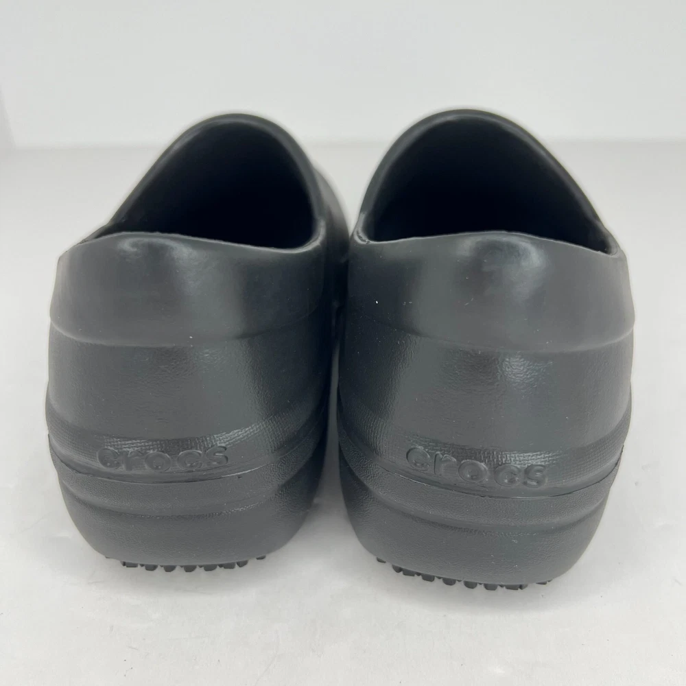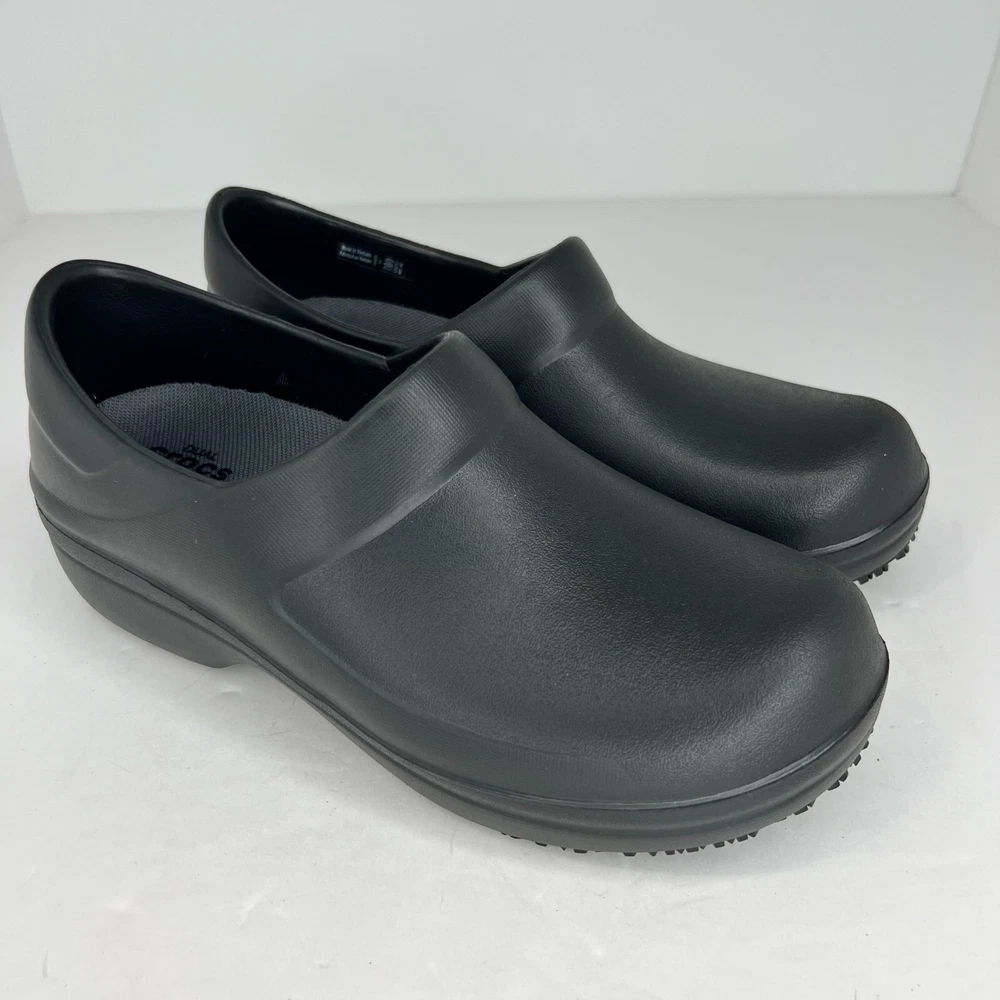 Elevate your workwear with these stylish Crocs Neria Pro II slip-resistant slip-on clogs. The black rubber upper and closed-toe design provide both durability and safety, while the slip-resistant outsole ensures you stay comfortable and secure in slippery work environments. The low wedge heel and M shoe width make these clogs perfect for all-day wear, whether you're on your feet or walking around the office. These women's clogs feature a solid pattern and a product line of Crocs Neria. They are available in UK shoe size 3.5, US shoe size 6, and EU shoe size 36. The insole is also made of rubber, providing added comfort and support. Ideal for summer, fall, and spring, these slip-on clogs are the perfect addition to any work wardrobe. 100% CUSTOMER SATISFACTION IS OUR GOAL! Our items are always carefully examined for condition, measured if necessary, and photographed in a climate controlled and smoke-free environment. We make every attempt to accurately describe and clearly picture the items we have for sale. Please, ALWAYS view all of the photos. We value your business and our goal is your complete satisfaction. FAST SHIPPING All items are packaged with care and shipped out the same or next business day via USPS, FEDEX, or UPS with tracking numbers so you are always informed. RETURNS We offer a 30-day return policy. All items must be unused and unopened in the condition in which they were received, with original packaging, and all accessories included for return. REVIEWS - CUSTOMER SATISFACTION - COMMUNICATION We aim to make you happy. After you receive your shipment, please leave a positive review . If you have concerns or questions about your order, please contact us so we can resolve the issue. We will do our best to make you satisfied. THANK YOU FOR YOUR BUSINESS!