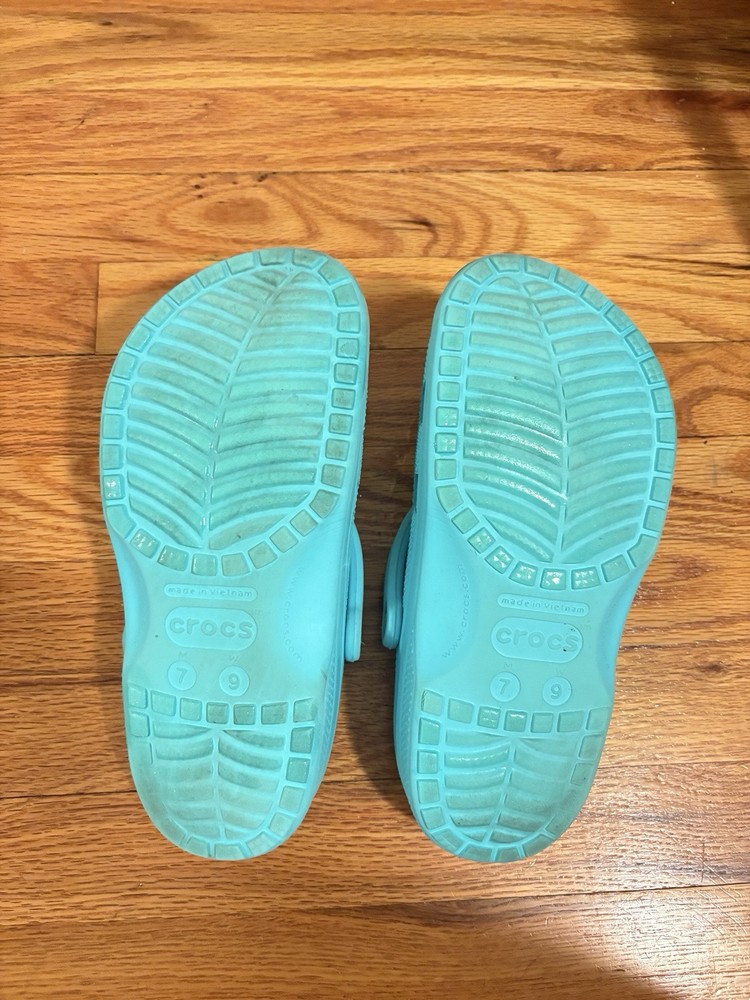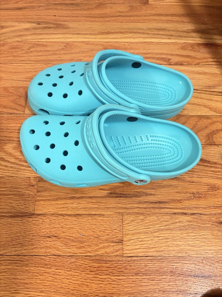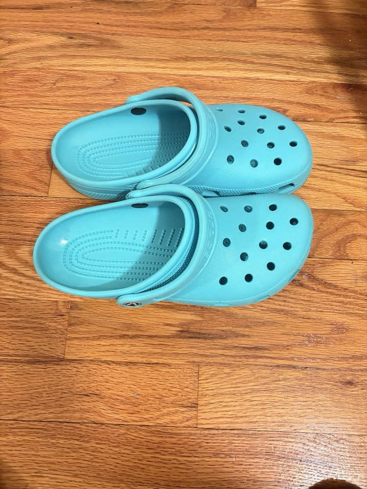 Aqua colored Crocs sized women’s 9, men’s 7. Perfect slides for the summer and spring time. Casual and comfortable for going on trips to easily slide on and off on the go.