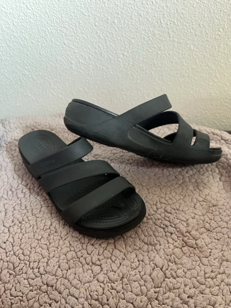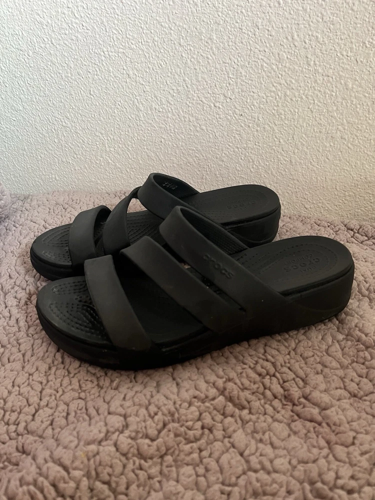Crocs Women’s Size 9 Low Wedge Slip On Crocband Sandal Black White Stripe Accent