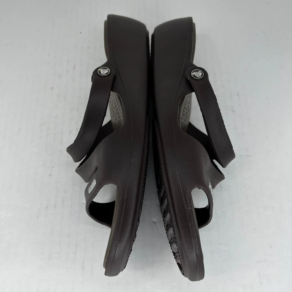 Step out in style with these fashionable brown strappy sandals from Crocs. Perfect for summer, fall or spring, these slip-on flats are made of high-quality rubber and come in a UK shoe size of 8, a US shoe size of 10 and EU shoe size of 42. The low heel height of 1-1.9 inches makes them comfortable for everyday wear and the rubber outsole material ensures durability. The Crocs Swiftwater model features a solid pattern with a beautiful accent strap that adds a touch of elegance to your outfit. Ideal for women, these sandals have a W shoe width and offer a personalized fit. Don't miss out on the opportunity to add these stylish sandals to your wardrobe. 100% CUSTOMER SATISFACTION IS OUR GOAL! Our items are always carefully examined for condition, measured if necessary, and photographed in a climate controlled and smoke-free environment. We make every attempt to accurately describe and clearly picture the items we have for sale. Please, ALWAYS view all of the photos. We value your business and our goal is your complete satisfaction. FAST SHIPPING All items are packaged with care and shipped out the same or next business day via USPS, FEDEX, or UPS with tracking numbers so you are always informed. RETURNS We offer a 30-day return policy. All items must be unused and unopened in the condition in which they were received, with original packaging, and all accessories included for return. REVIEWS - CUSTOMER SATISFACTION - COMMUNICATION We aim to make you happy. After you receive your shipment, please leave a positive review . If you have concerns or questions about your order, please contact us so we can resolve the issue. We will do our best to make you satisfied. THANK YOU FOR YOUR BUSINESS!