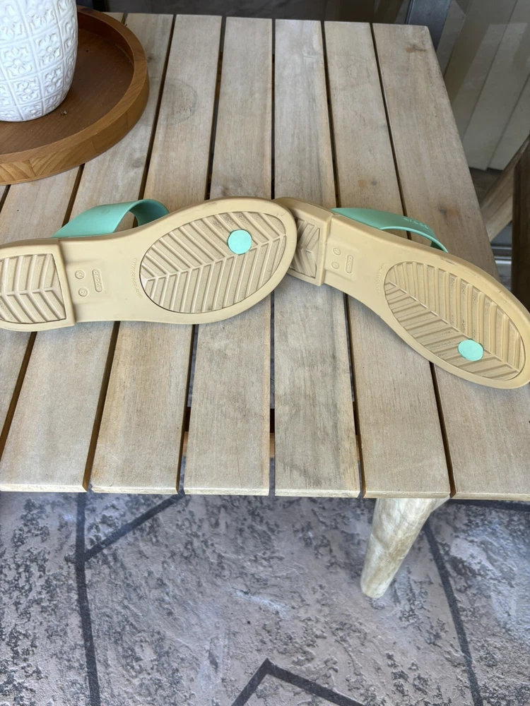 LIKE NEW/ NEVER WORN Step into comfort with the Crocs Women’s Tulum Thong Flip Flops. These sandals feature a solid teal blue and beige color scheme, with a jade stone hue that adds a touch of sophistication to your casual look. The slip-on style ensures easy wearability, perfect for those on-the-go moments or relaxed sunny days. Crafted with a durable rubber upper and designed for all-day comfort, these flip flops boast a flat heel style that's less than an inch high, making them ideal for everyday wear. The standard shoe width accommodates most foot sizes, ensuring a snug and comfortable fit for a size 6. Whether you're heading to school or enjoying a leisurely stroll, these Crocs sandals are a versatile addition to any wardrobe.