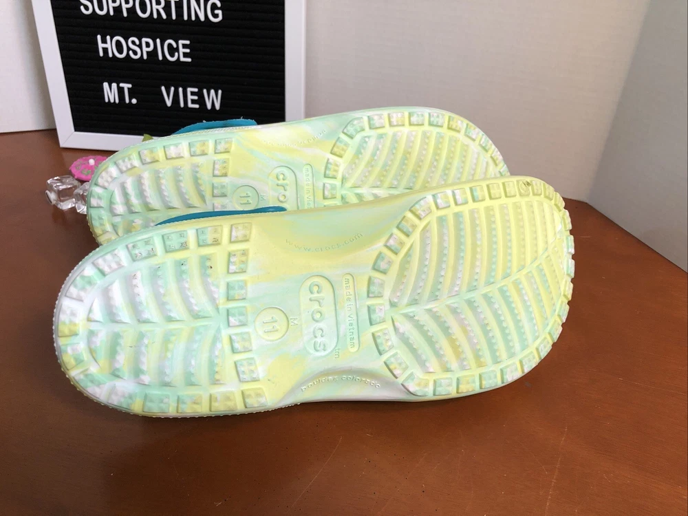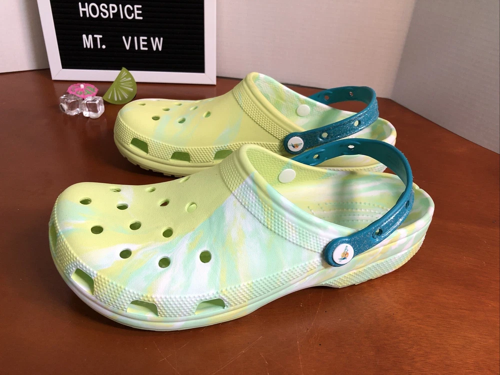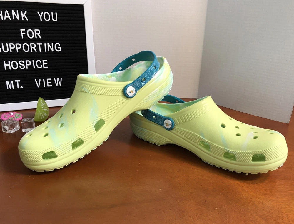 Elevate your style with these limited edition Crocs X Margaritaville Jimmy Buffet classic clogs. The tie-dye pattern in green adds a touch of vibrancy to your outfit. These crocs feature a rubber upper and insole material, making them durable and comfortable to wear. The Crocs X Margaritaville Jimmy Buffet classic clogs are a must-have for any fan of the iconic musician and a great addition to any shoe collection. Like new condition with minimal signs of wear. A few original charms are missing. Please see all photos All proceeds benefit hospice patients.