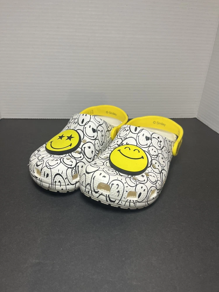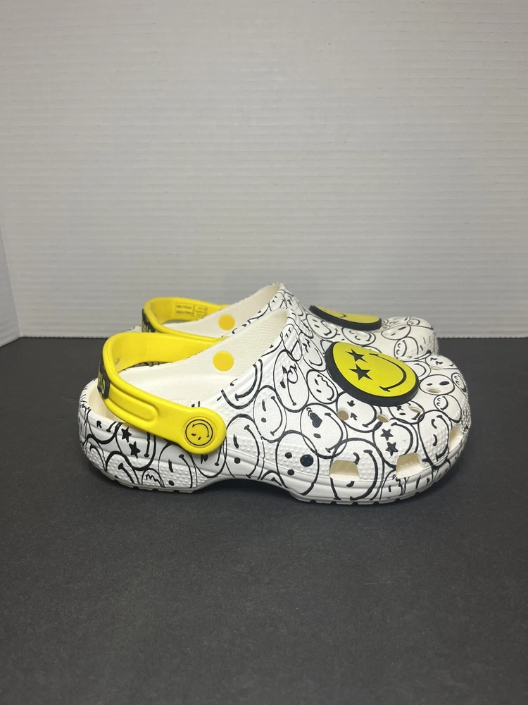 Elevate your child's footwear game with the Crocs X SmileyWorld Collab Classic Clog. This limited edition design features a round toe shape, slip-on closure, and a flat heel height of under 1 inch. The white color and happy, classic theme make it a perfect fit for any season, whether it's winter, summer, fall, or spring. The Crocs SmileyWorld Classic model is designed for comfort, breathability, and non-slip safety, making it an ideal choice for casual occasions. The ankle strap provides additional support, and the lightweight design ensures your child's feet stay comfortable all day long. Available in US shoe size 2 this unisex kids' shoe is a must-have addition to your child's wardrobe.