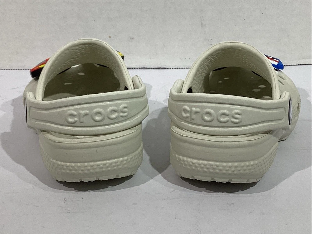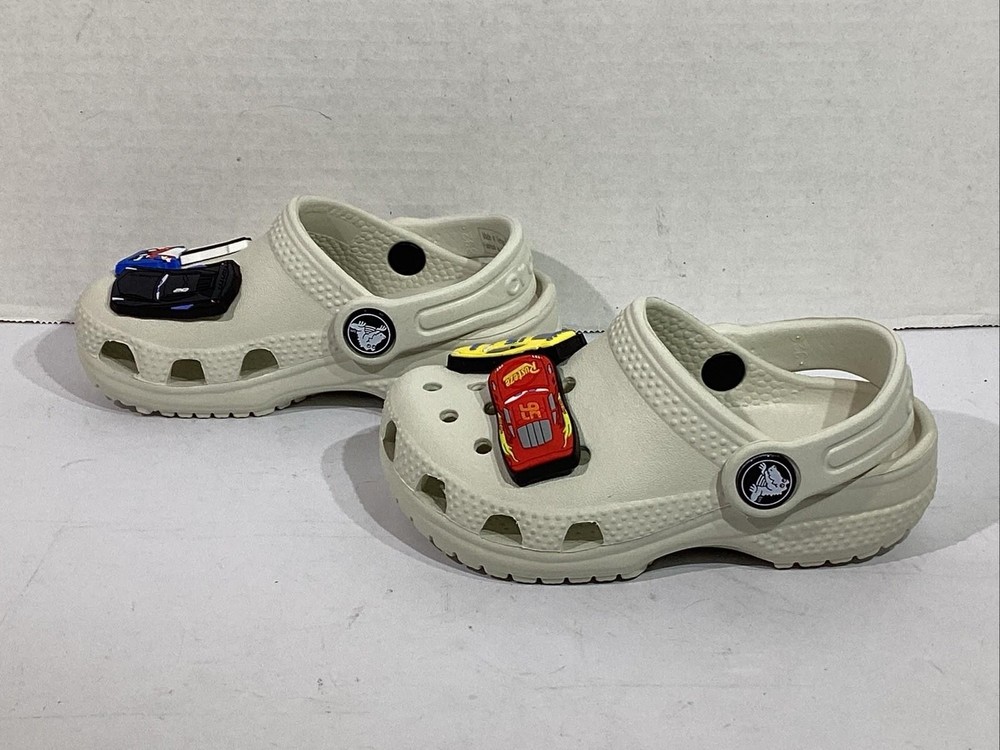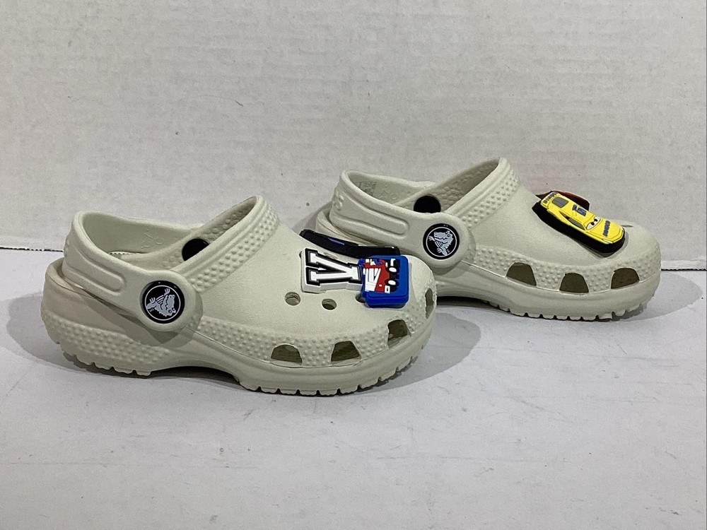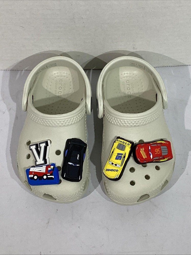 The product is a pair of Crocs youth size 7 gray clogs featuring 5 Disney Cars Jibbitz charms, including Lightning McQueen. These slip-on clogs have a low top design with a round toe shape and flat heel height, making them comfortable for casual wear. The standard shoe width and rubber upper material ensure a good fit for unisex kids. Perfect for the summer, fall, and spring seasons, these clogs are a fun and stylish choice for young fans of the Cars movie franchise. CONDITION: NEW without original Box. Additional details for this item can be found on the Manufacturer's website. CHECKOUT MY OTHER AUCTIONS........NEW ITEMS LISTED DAILY!! PLEASE LOOK AT ALL THE PICS CLOSELY FOR MORE DETAILS Highly popular Style, so bid QUICK & don't miss out! All Items come from a smoke-free, pet-free environment. "IF" shoes come with a box, it may need a little TLC due to storage & transit. All auctions must be paid within 3 days of ending. PayPal only accepted. Tennessee residents add 9.25% sales tax. INTERNATIONAL SHIPPING: We ship using Ebay's Global International Shipping program. All fees & pricing are calculated directly by Ebay, not the seller. We have no access to what Ebay charges or customs fees. RETURNS: We offer Ebay's 30-day Hassle-free Returns. Buyer pays return shipping. We process refunds less original shipping & a 10% restock fee. Exception: if you have a problem with your item, please contact us immediately, so that we can quickly resolve any "not as described" issues PRIOR to filing a claim with EBay. FEEDBACK: Your SATISFACTION is IMPORTANT to us! "Positive" feedback will be Automatically left once an item is paid. If you are HAPPY with your purchase........PLEASE leave us "Positive" Feedback & 5-star Detailed Seller Ratings. If you are UNHAPPY with your item or have any concerns, PLEASE contact us PRIOR to leaving Neutral or Negative feedback because we try our best to resolve any issues quickly. Listing and template services provided by inkFrog