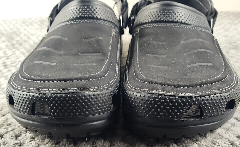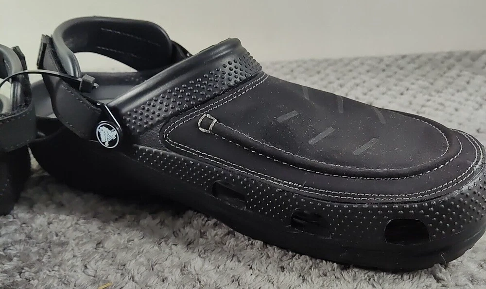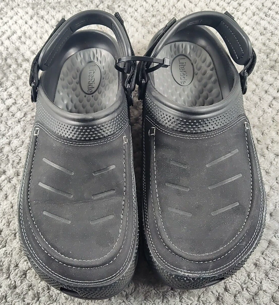 Crocs Yukon Vista II LiteRide Clogs for Men - Black/Slate Grey - 10M The Crocs™ Yukon Vista II LiteRide® Clogs for Men are the next evolution of comfortable clogs. These clogs feature leather instep plugs for a different Crocs look and feel. The super-cushioned LiteRide footbeds boosts comfort. Adjustable back straps allow you to find that perfect fit. These Crocs feature the signature Croslite™ shell material that keeps your travels comfortable. Imported. Manufacturer style #: 207689. Leather instep plug Super-cushioned LiteRide footbeds Adjustable back strap Full Croslite shell