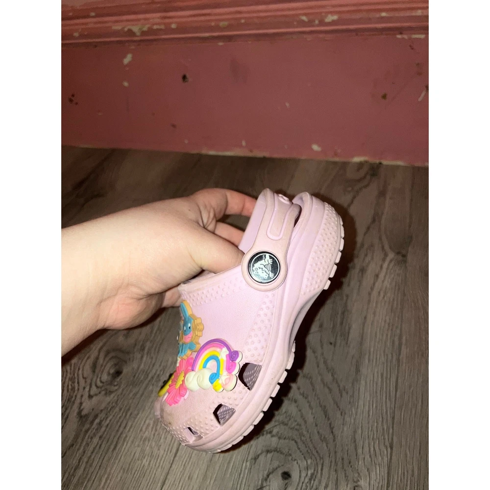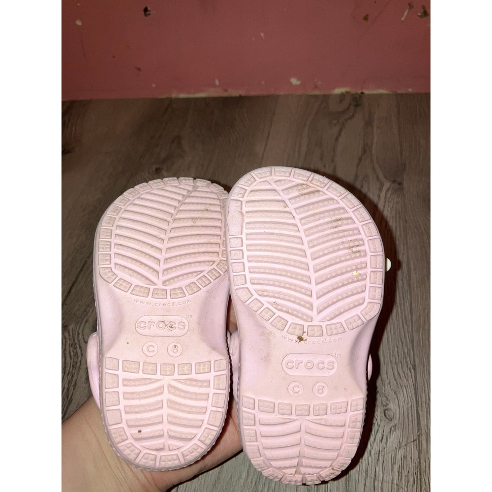 Brand: Crocs Size: 6 Toddler Color: Light pink Condition: in play condition has dirt, staining, and the jibitz a couple are damaged. But still has a lot of life left in them. Style: Crocs Offers welcome! Bundle to save!