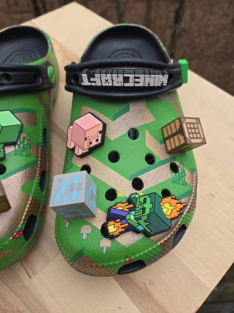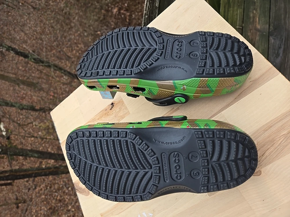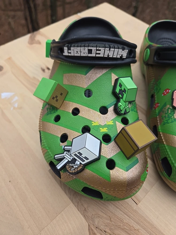 Elevate your casual shoe game with these Crocs x Minecraft Elevated Clogs in green. These limited edition clogs feature a camouflage pattern with Minecraft characters and ankle straps for a comfortable fit. The lightweight design makes them perfect for everyday wear, and the Crocs brand ensures durability. These shoes are customized and come with Jibbitz parts for added fun. They are perfect for casual occasions.