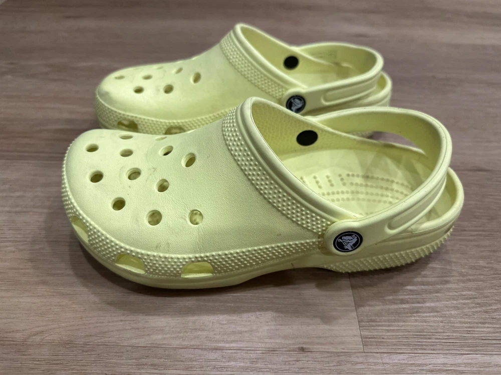 Embrace everyday comfort with the Crocs Classic Clogs in a vibrant sunflower yellow. These iconic clogs are designed for women who appreciate a blend of practicality and style. The lightweight construction, coupled with a durable rubber upper and toe cap, ensures long-lasting wear and ease of maintenance. Perfect for a range of casual settings, including beach outings, walks, or simply strolling through school, these clogs offer a snug fit in a size 9 (W9/M7) with a standard shoe width. The low top shaft and flat heel underscore the shoe's understated design, making them an ideal companion for those who value comfort and breathability in their footwear.
