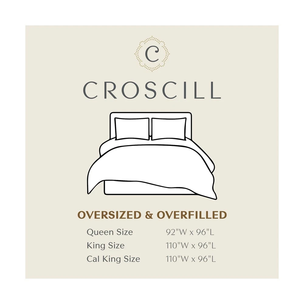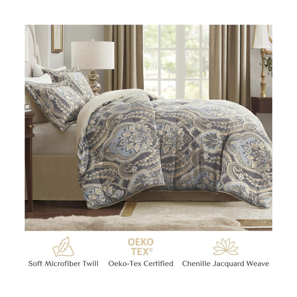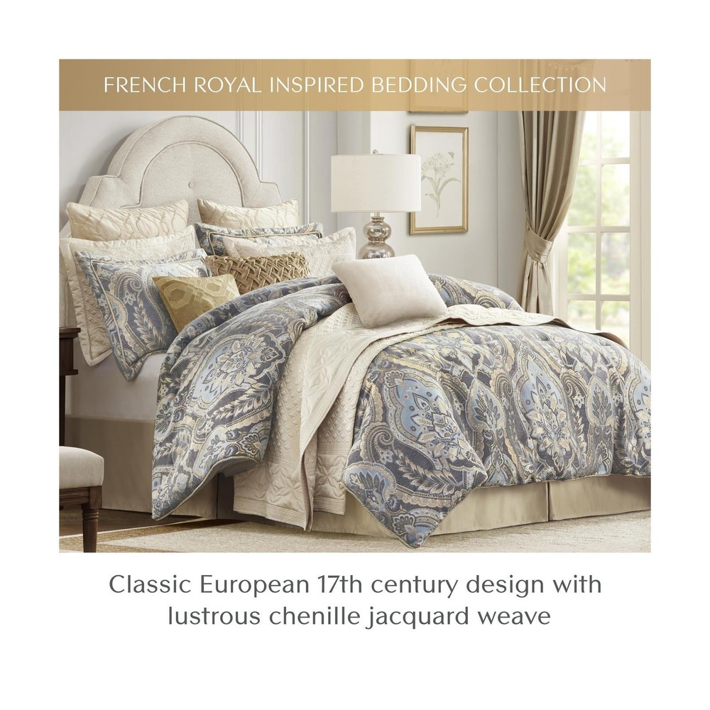 Croscill King Comforter Set, Luxe Chenille Jacquard Damask, Soft Microfiber Twill Comforter for a King-Size Bed, Oversized Comforter King Bedding, 2 Shams & Bedskirt, Julius, Blue/Grey 4 Piece Comforter and Sham Face: 100% Polyester Chenille Jacquard, Back: 100% Polyester Microfiber Twill Solid Dyed. Experience opulence with our Luxurious Bedding Set - a timeless blend of French 17th century inspired design. Immerse yourself in the lustrous comfort of a damask jacquard weave, evoking the classic opulent lifestyle with a touch of modern elegance Exquisite craftsmanship - Indulge in the luxurious and lavish comfort of a chenille jacquard weave paired with a soft microfiber twill reverse. Embrace cozy and intimate moments at home, surrounded by beauty and elegance crafted with meticulous attention High Quality - Discover perfection in our matching shams, featuring hidden zippers, a sophisticated flange with delicate rope trim. Elevate the design with a lustrous antique satin bedskirt; all with the assurance of high-quality Oeko-Tex certification Comforter set includes oversized: 1 Comforter: 110"W x 96"L, 2 King Shams: 20"W x 36"L + 2"D , 1 Bedskirt: 78"W x 80"L +15"D Care for your luxurious bedding with sophistication: Opt for dry cleaning for the comforter and shams, while the bedskirt revels in the ease of machine washing. (See sewn-in label for care instructions) Size King Included Components 1 Comforter, 2 King Shams, 1 Bedskirt Color Blue/Grey Style Traditional