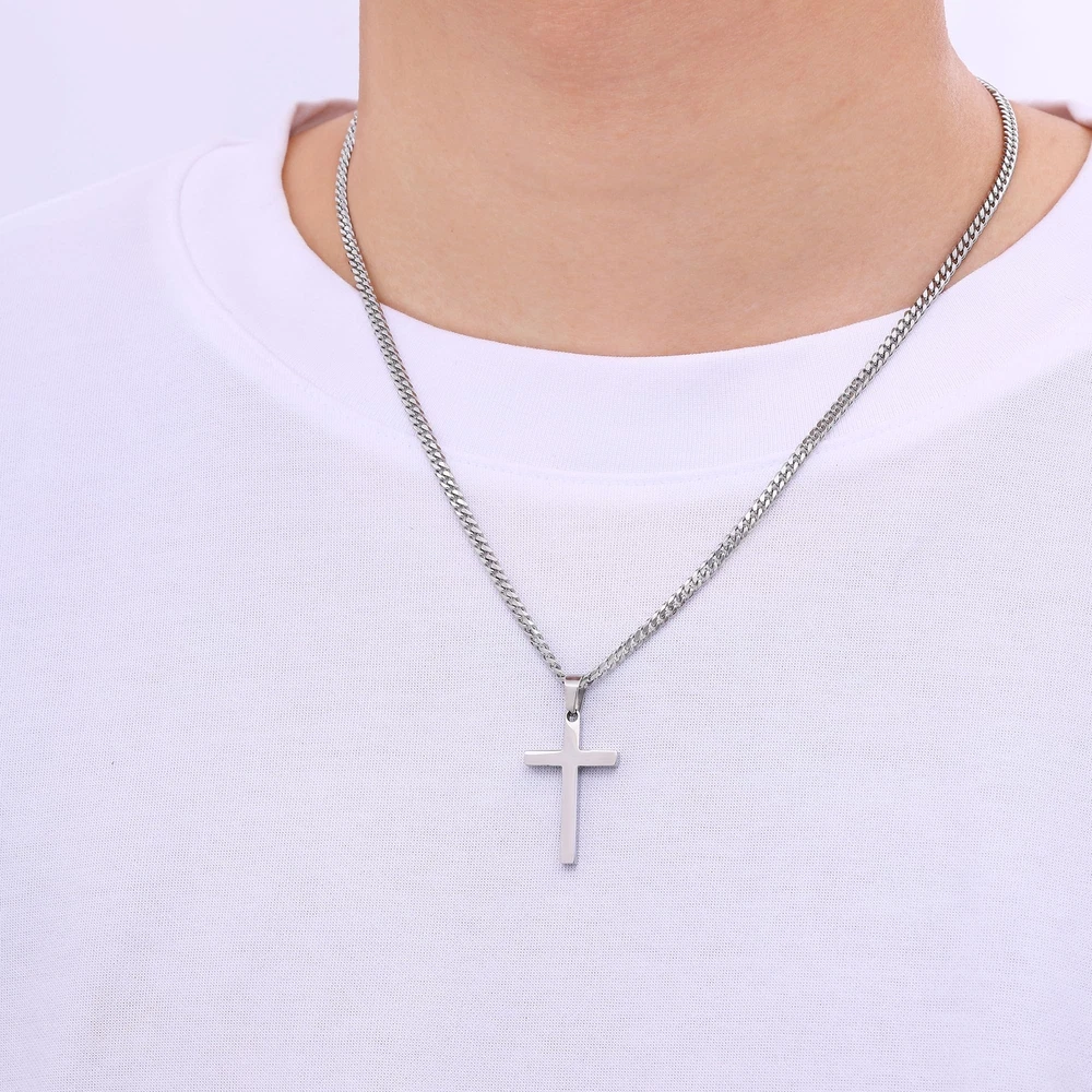 Mens Cross Necklace Specification: Type: Cross Necklace for Men Color: Gold/Black/Silver Tone Size: 3.5mm width Chain, 16"-24" length Chain: Cuban Pendant: 0.8"*0.4" tiny 1.2" * 0.7" small cross, 1.8" * 1.0" medium cross, 2.1" * 1.2" big cross Material: 316L Stainless Steel Clasp: Lobster Claw Clasp Applicable: Men Women Girls and Boys cross chain Package: Gold/Black/Silver Tone Cross Necklace for Men*1 Bright blue gift box*1 Thank You Card*1 Necklace for Boys, wear it every day: ✔ Hypoallergenic ✔ Sturdiness ✔ High quality ✔ Giftable ✔ Craftsmanship ✔ Not tangled ✔ Last long time Sturdy: High-316L stainless steel cross chain for men, sturdy mens necklaces for everyday wear Hypoallergenic: Smooth touch and hypoallergenic silver tone cross necklaces for men, comfortable for your sensitive skin, siutable to wear in daily life Craftsmanship: Diamond-cut and polished cross necklace, more reflective and shiny than standard stainless steel necklace for men Perfect size: Light weight 1.2*0.7" cross pendant, 3.5mm width 20" length mens silver tone chain. Wear alone or layered for a personal statement Jewelry for him/her: cross necklace packaged with a delicate jewelry box, great jewelry ideas for men, women on birthday, anniversary, Christmas etc.
