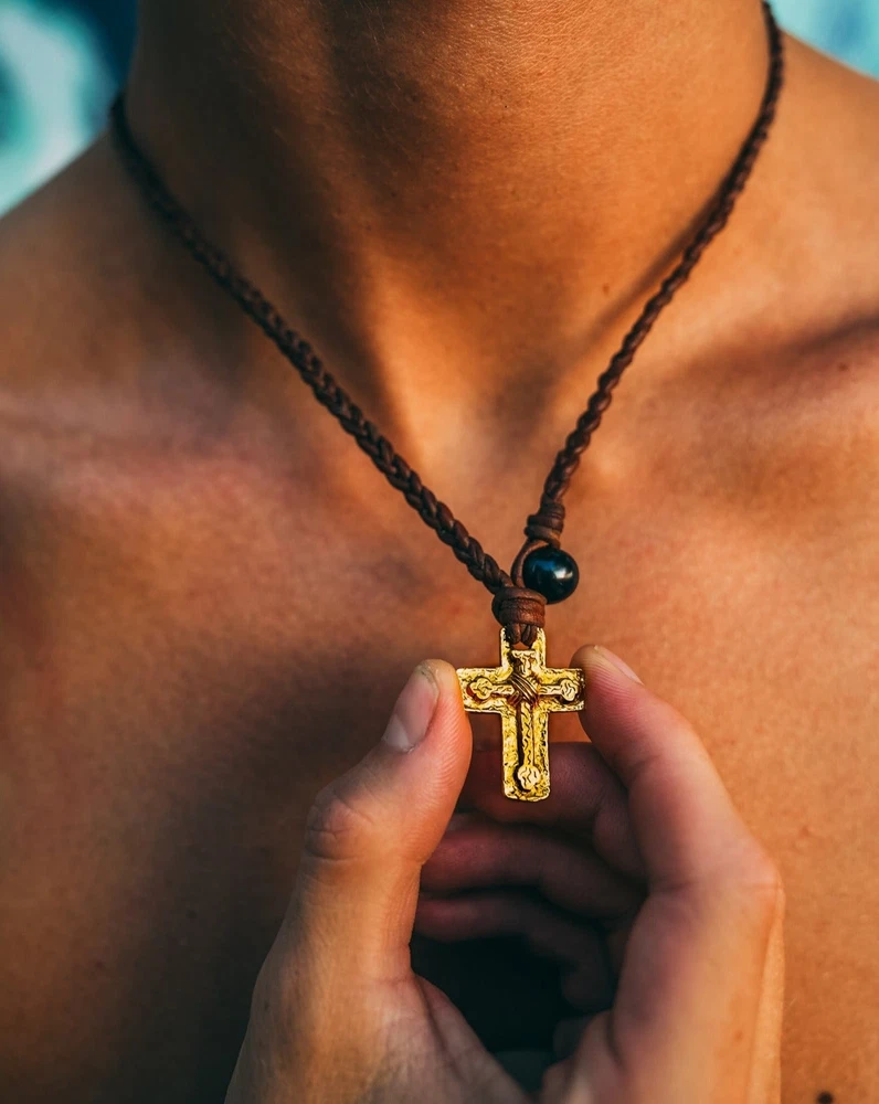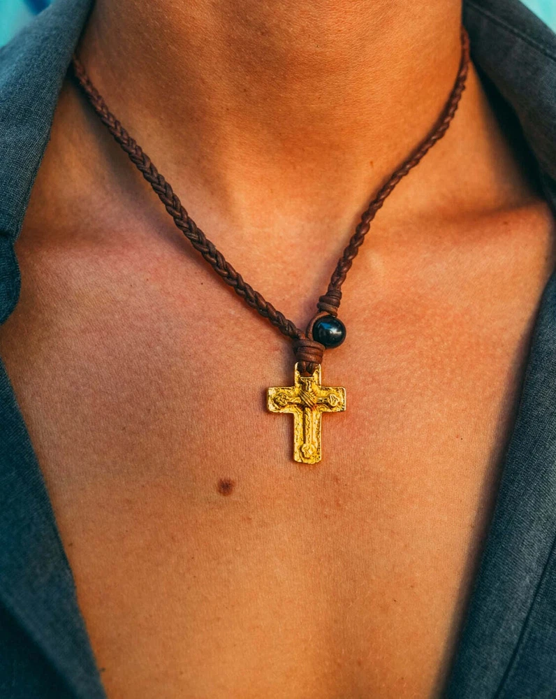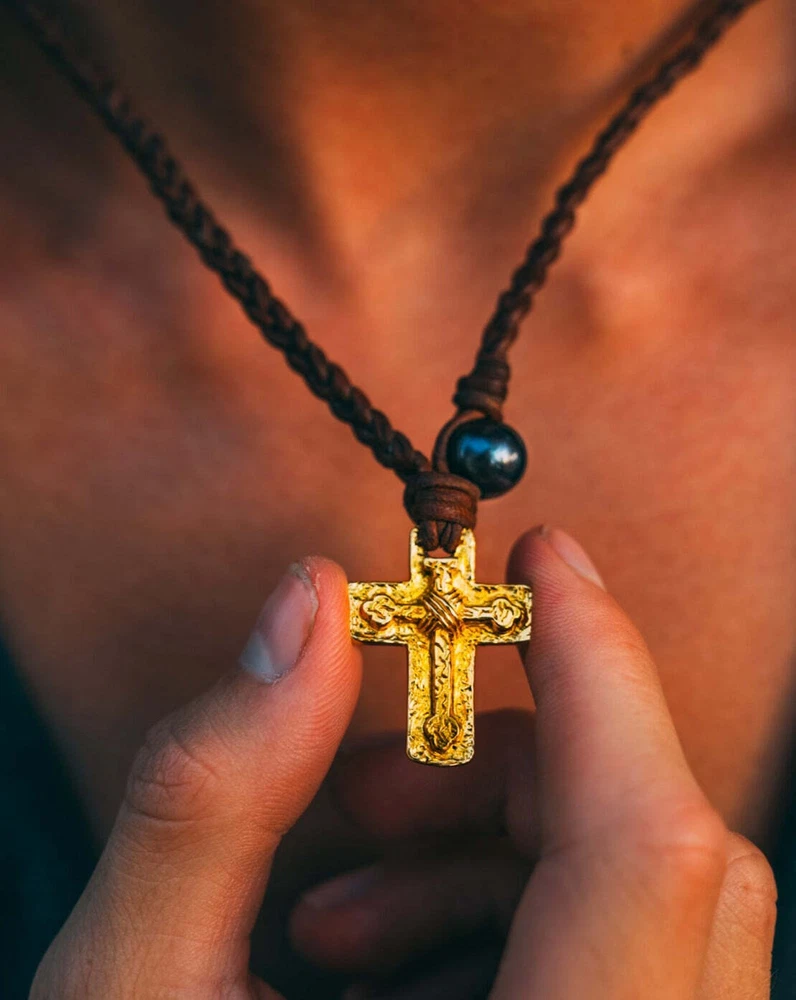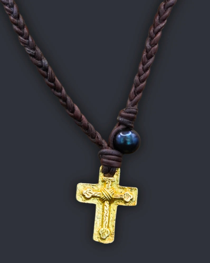 Navigate life's adventures with confidence wearing the Gold plated Cross Pendant Necklace. Crafted with Gold plated brass, authentic leather, and premium pearls, it is an accessory that complements any outfit and never needs to be taken off. - Gold Plated Brass - Premium White & Black Pearl - Authentic Braided Leather Chain - One size fits most, adjustable to various neck sizes Each piece is handmade to last a lifetime.