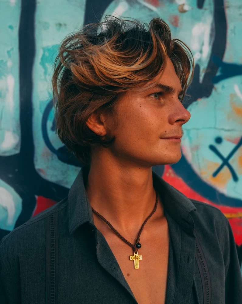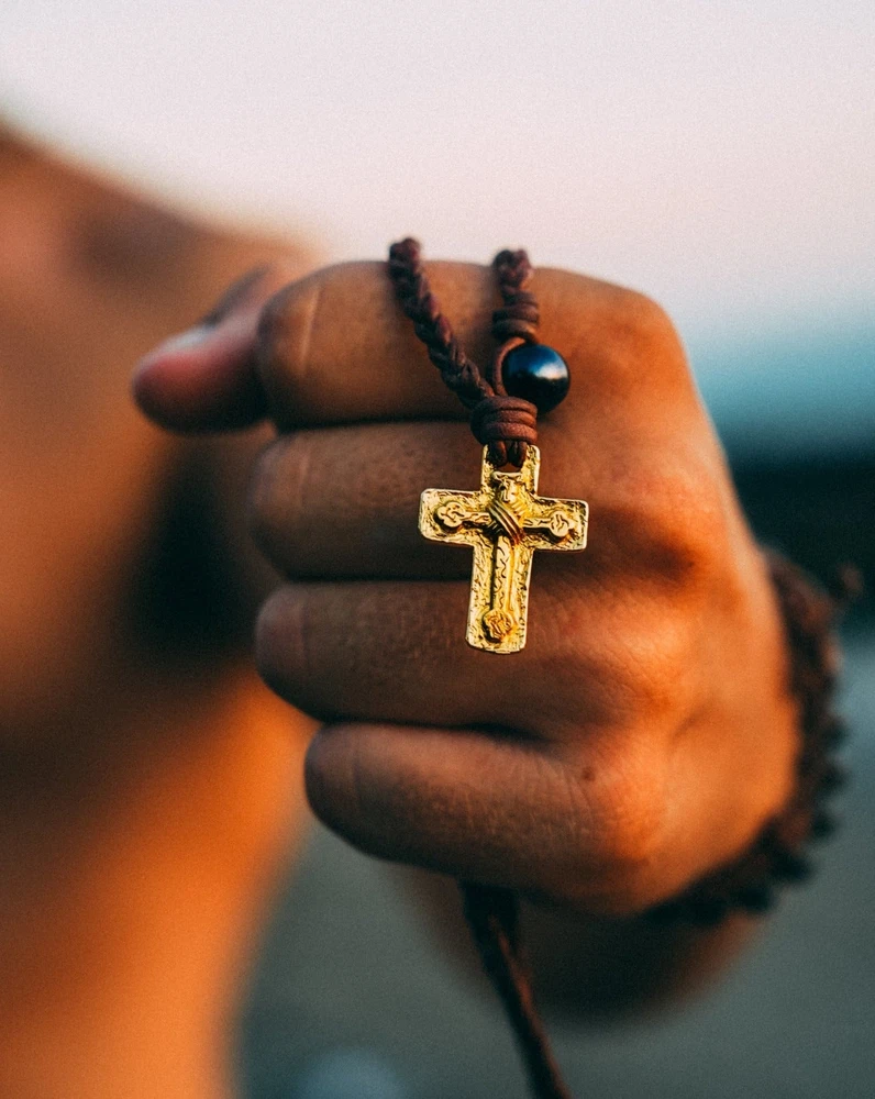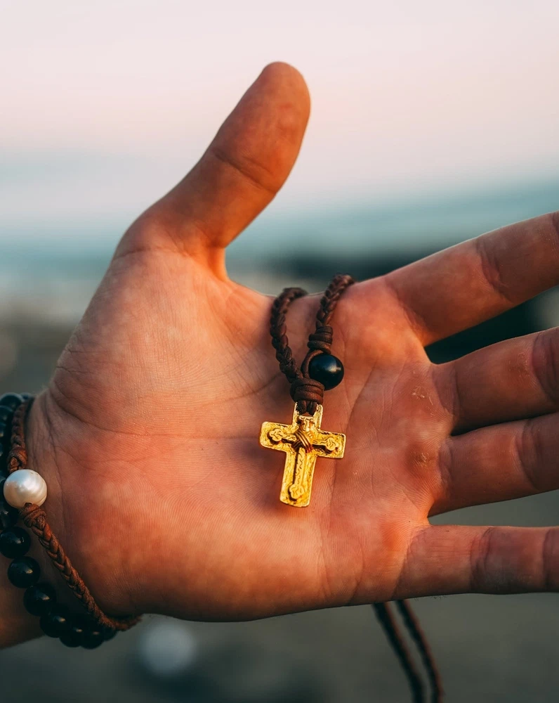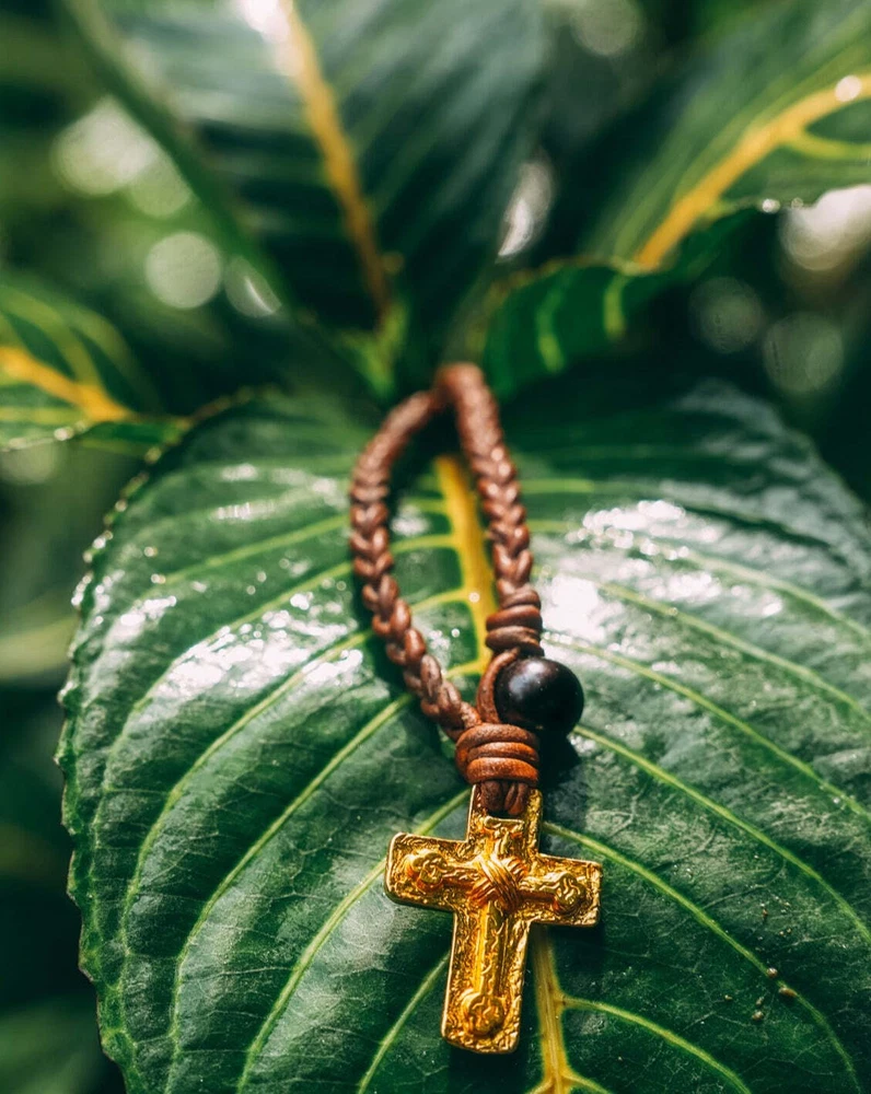 Navigate life's adventures with confidence wearing the Gold plated Cross Pendant Necklace. Crafted with Gold plated brass, authentic leather, and premium pearls, it is an accessory that complements any outfit and never needs to be taken off. - Gold Plated Brass - Premium White & Black Pearl - Authentic Braided Leather Chain - One size fits most, adjustable to various neck sizes Each piece is handmade to last a lifetime.
